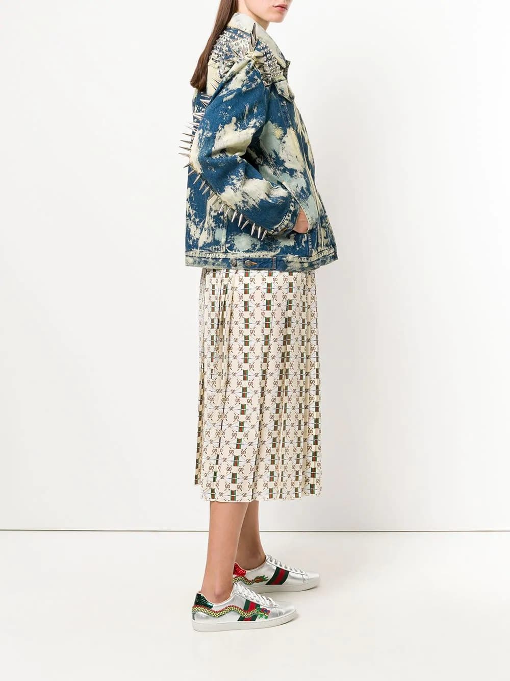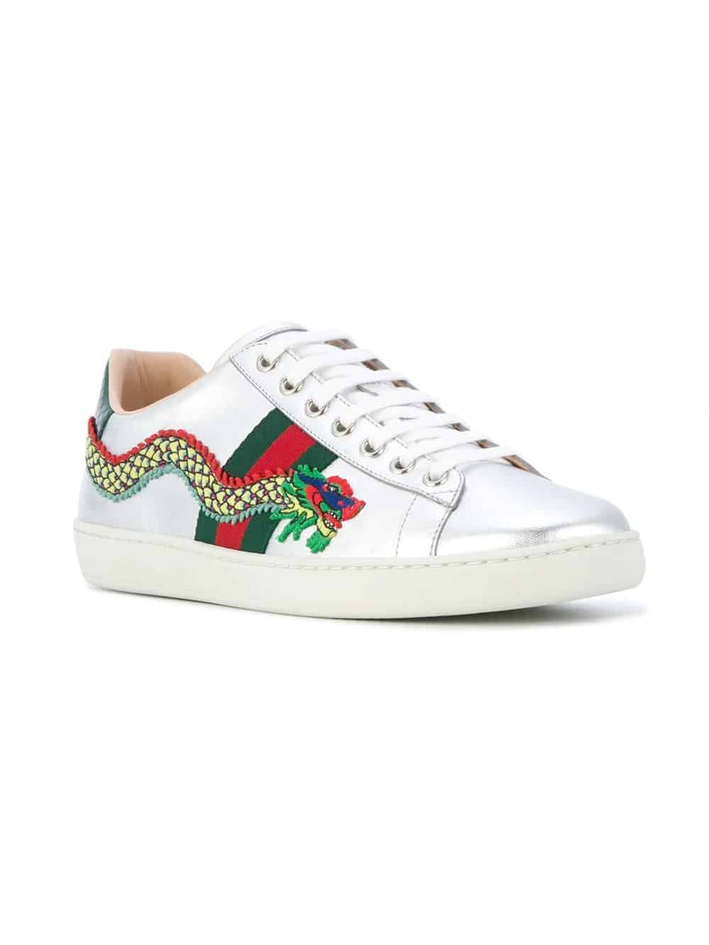 Tune into Gucci’s eclectic aesthetic with these dragon embroidered Ace sneakers. Detailed with the label’s signature green and red Web trim, these silver leather Gucci sneakers capture the eccentric, colourful and romantic vision of the Italian fashion house. They are completed with a round toe, a lace-up front fastening, a green snakeskin branded heel counter and a flat rubber sole. Please note that this item cannot be shipped outside the E.U.. For the most comfortable fit please select half a size down.