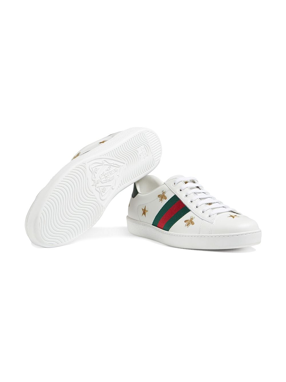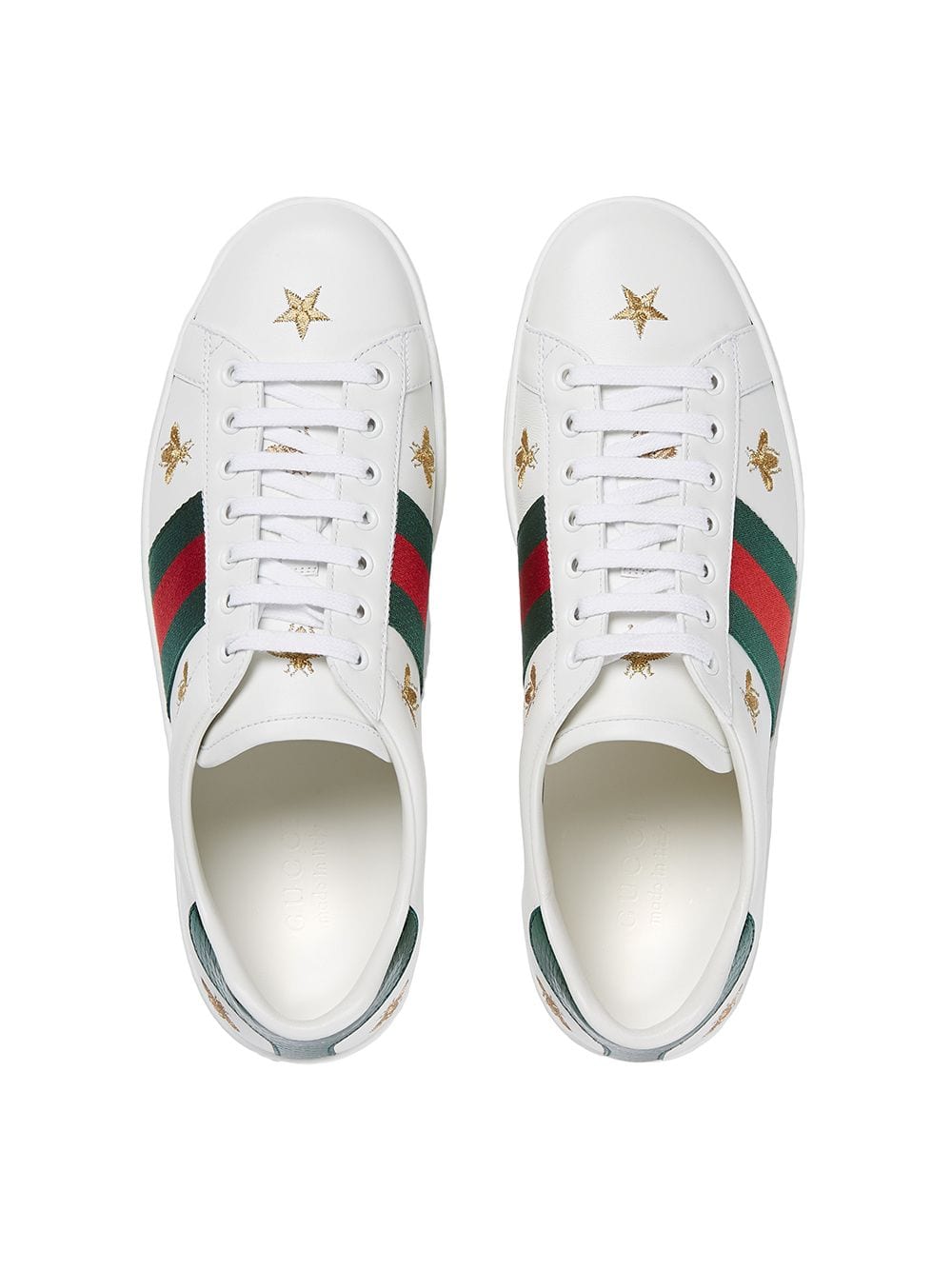 Our classic low-top sneaker with gold thread-embroidered bees and stars, two of Alessandro Michele’s signature details. White leather with gold thread-embroidered bees and stars and green ayers snake detail at the heel. Green and red Web. Rubber sole. 5mm height. Made in Italy. Please note that this item cannot be shipped outside the E.U..
