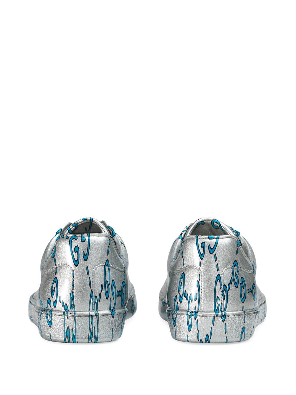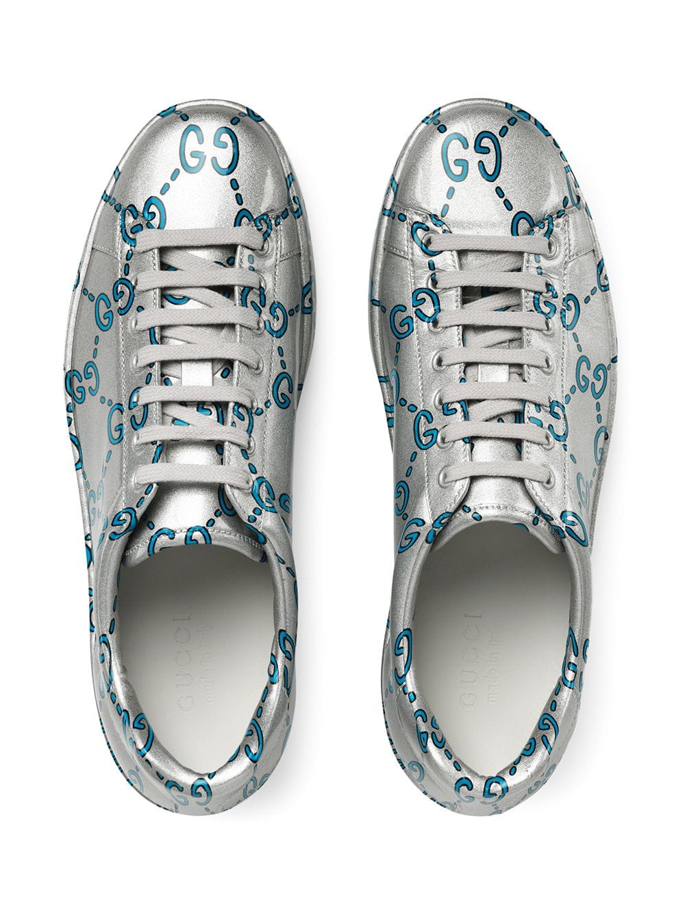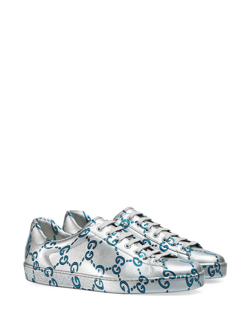The retro inspired design of the Ace sneaker is embellished with a comics inspired GG print on a metallic silver base that speaks to the glam rock influence that runs through the Cruise 2019 collection. First used in the 1970s, the GG logo was an evolution of the original Gucci rhombi design from the 1930s, and from then it’s been an established symbol of Gucci’s heritage. Silver and blue GG print coated leather;Rubber sole;5mm height;Made in Italy.