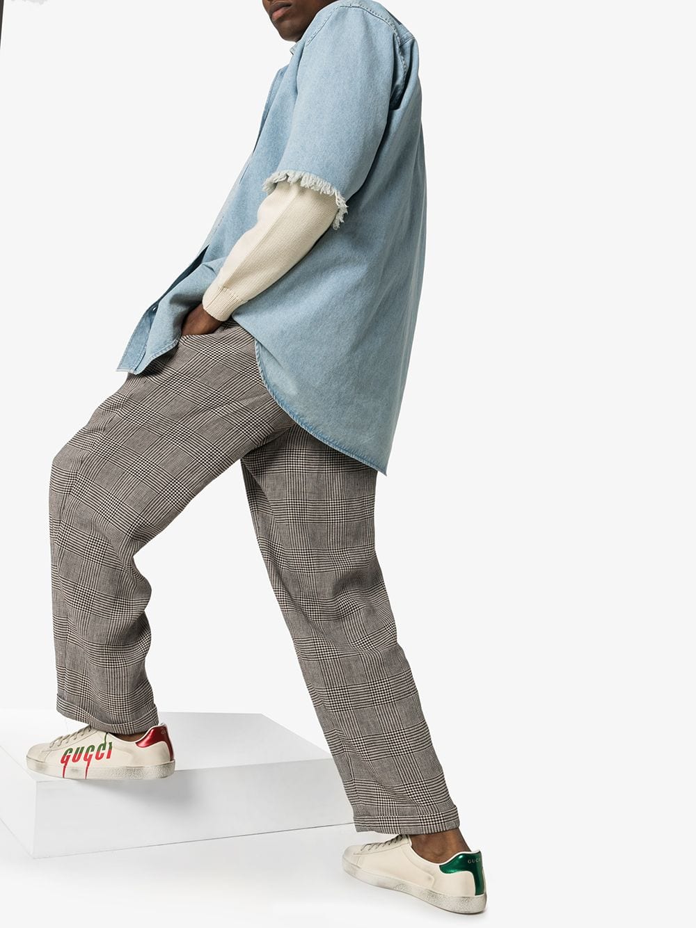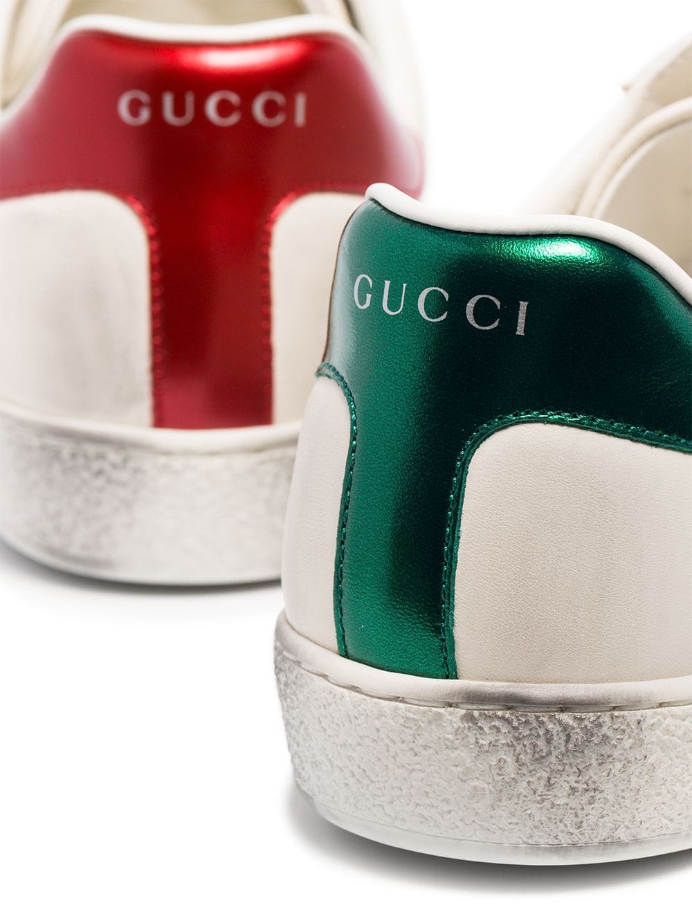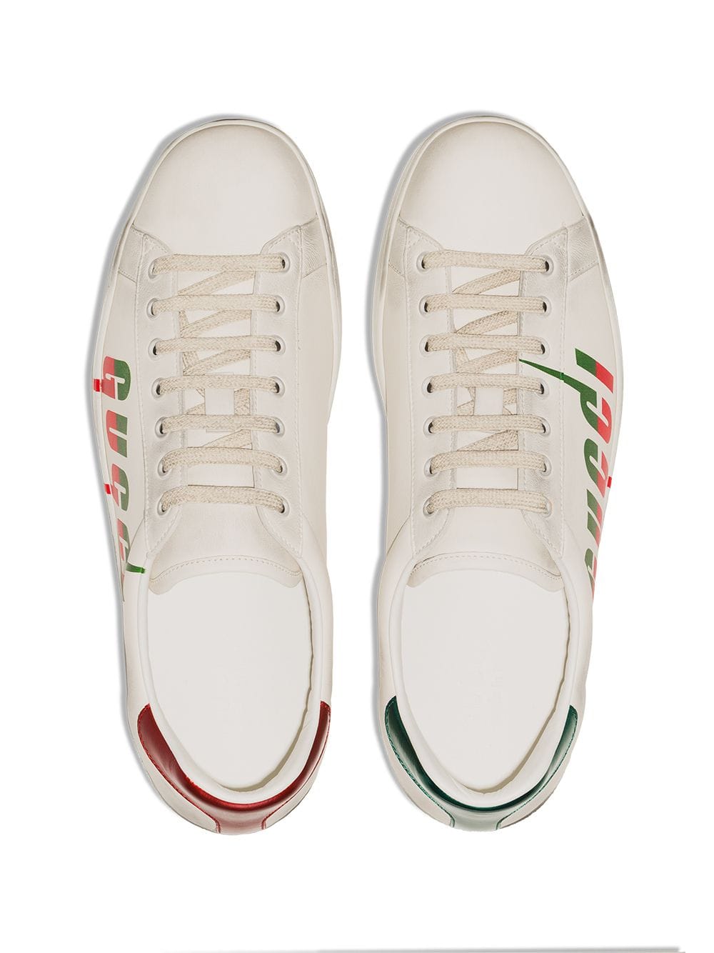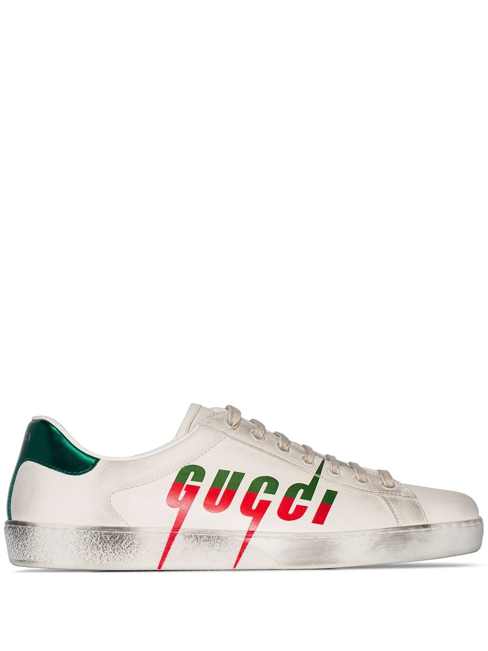 Gucci is celebrated for their quirky graphics, whimsical prints and bold colour schemes. These white leather Ace logo printed sneakers from Gucci feature a round toe, a front lace up detail, a flat rubber sole, branded heel counter and a logo patch at the tongue.