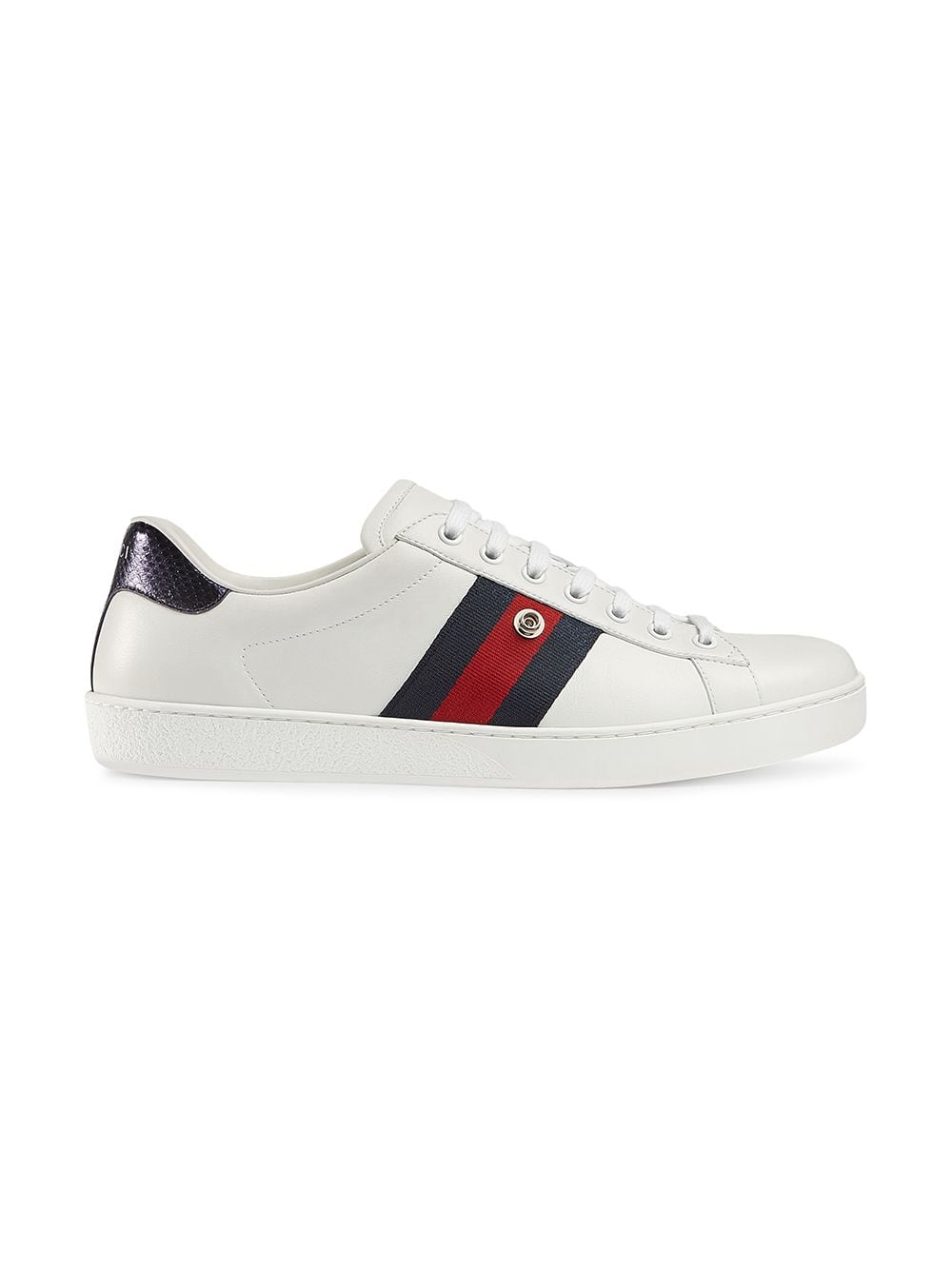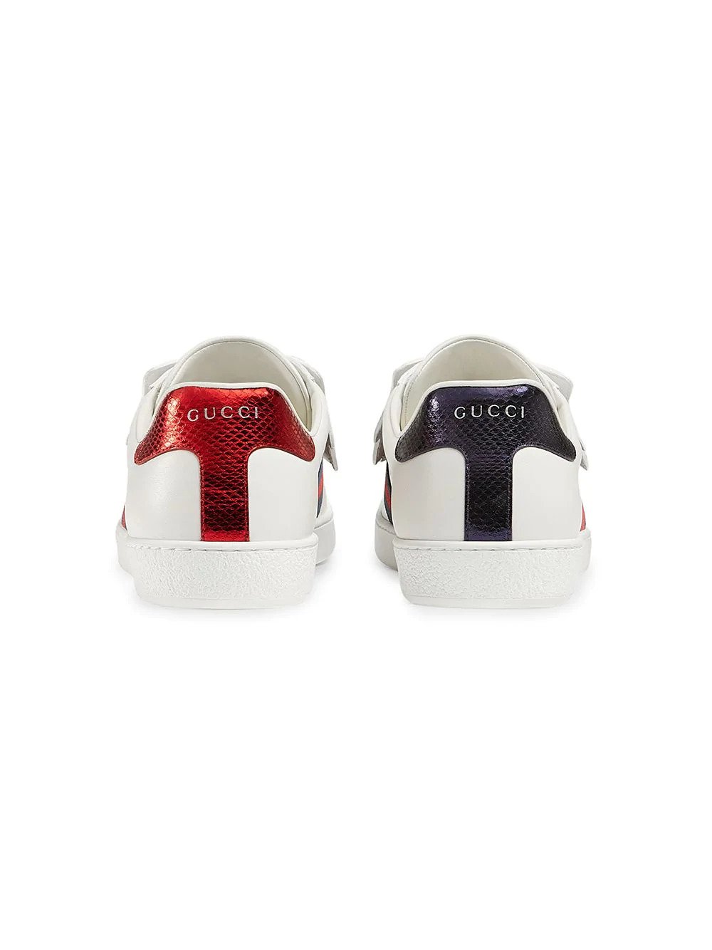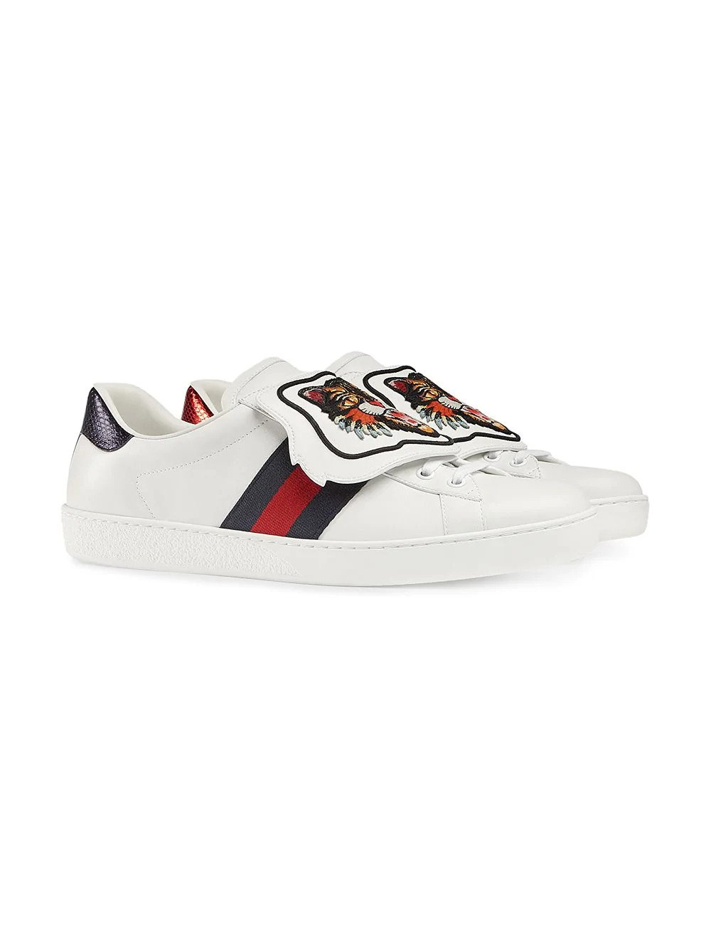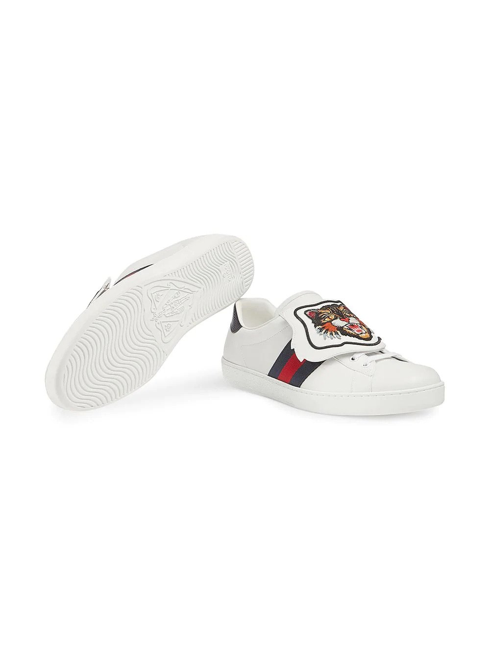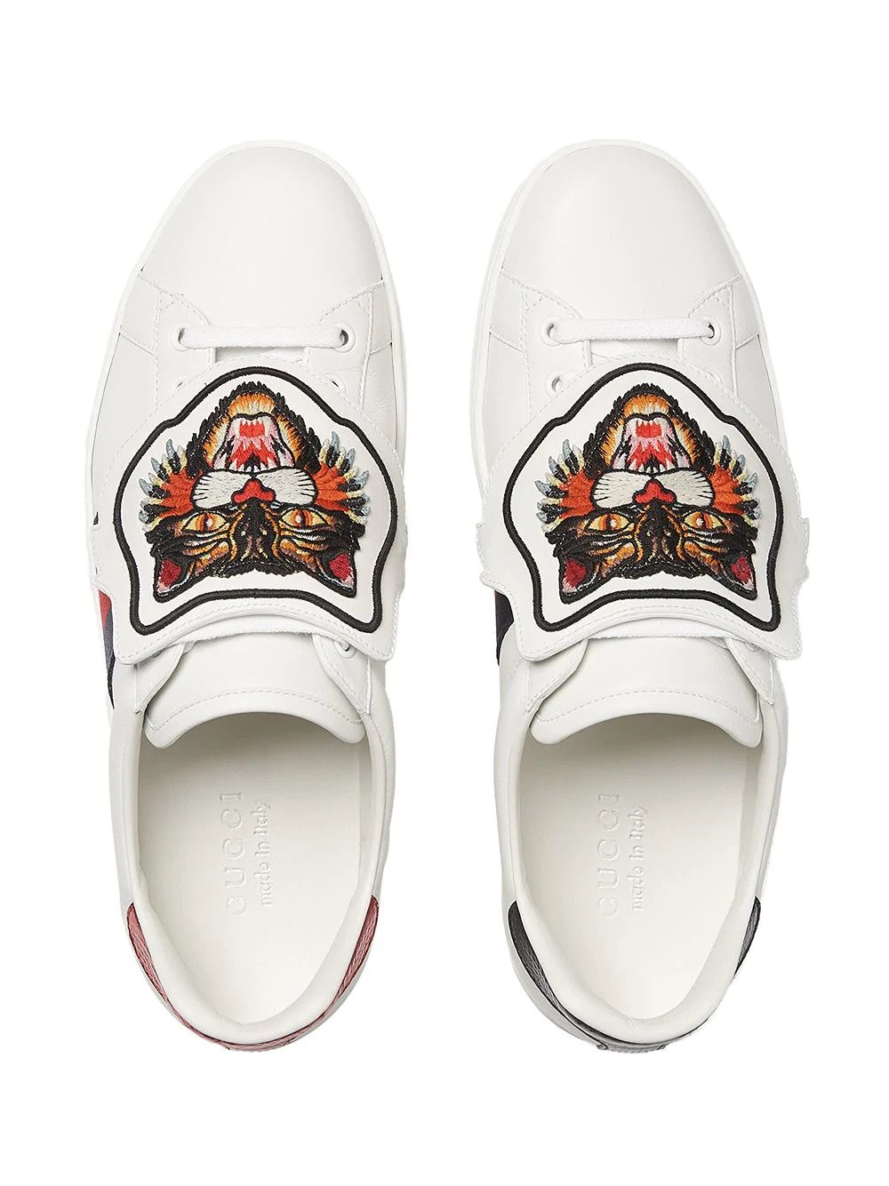 The Ace sneaker is reinvented with a design that features removable and interchangeable embroideries, allowing for multiple design combinations and a unique form of self expression. The leather pieces can be secured and removed using the metal snaps at the back. Each pair ships with a set of embroideries, which can be replaced with additional variations that are offered separately. White leather with blue and red Web detail on the sides. Removable embroidered angry cat appliqué. Red ayers snake detail on the back of one shoe and blue ayers snake detail on the back of the other shoe. Rubber sole. 5mm height. Please note: additional embroideries are available separately. Made in Italy.