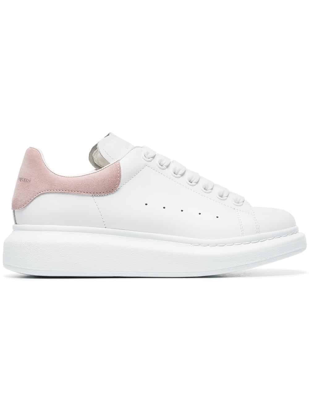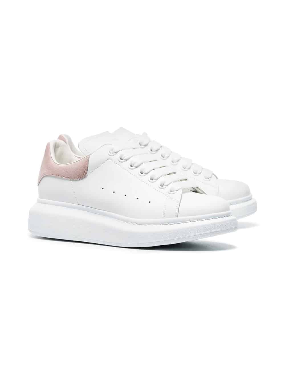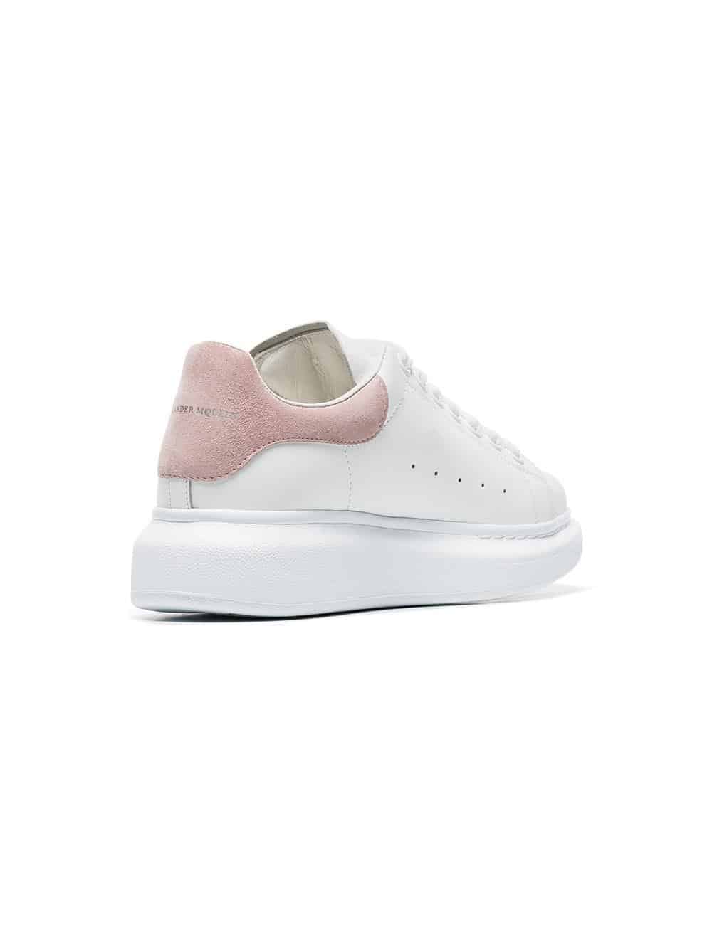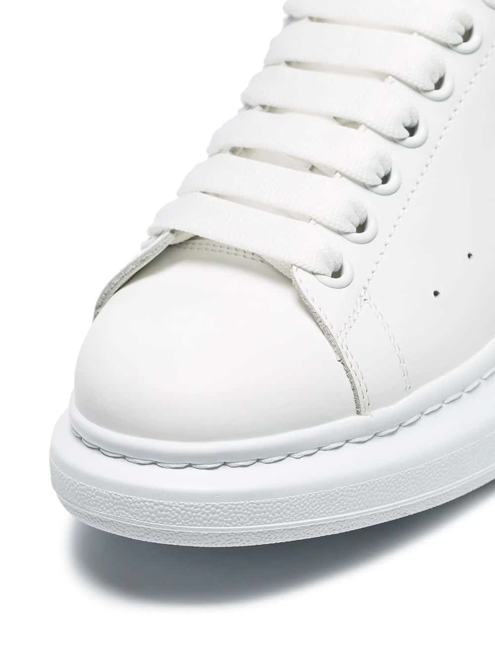White smooth calf leather lace-up sneaker with rounded toe and trimmed with patchouli suede heel detail. Large flat laces and Alexander McQueen signature on tongue and heel counter. Oversized rubber sole.[/vc_column_text][/vc_column][/vc_row]
