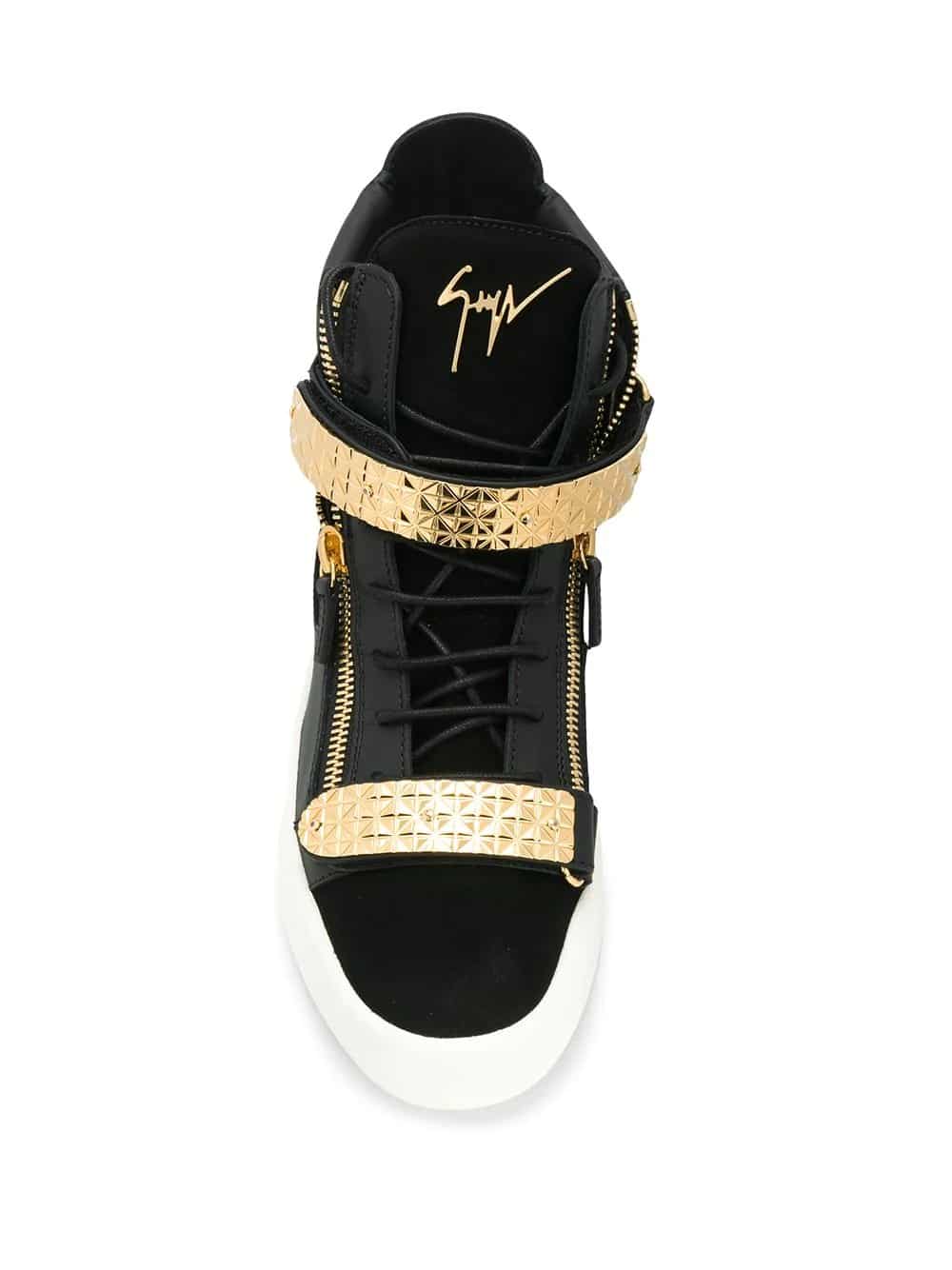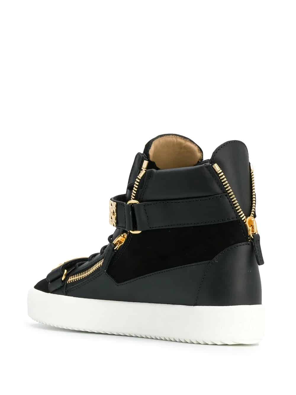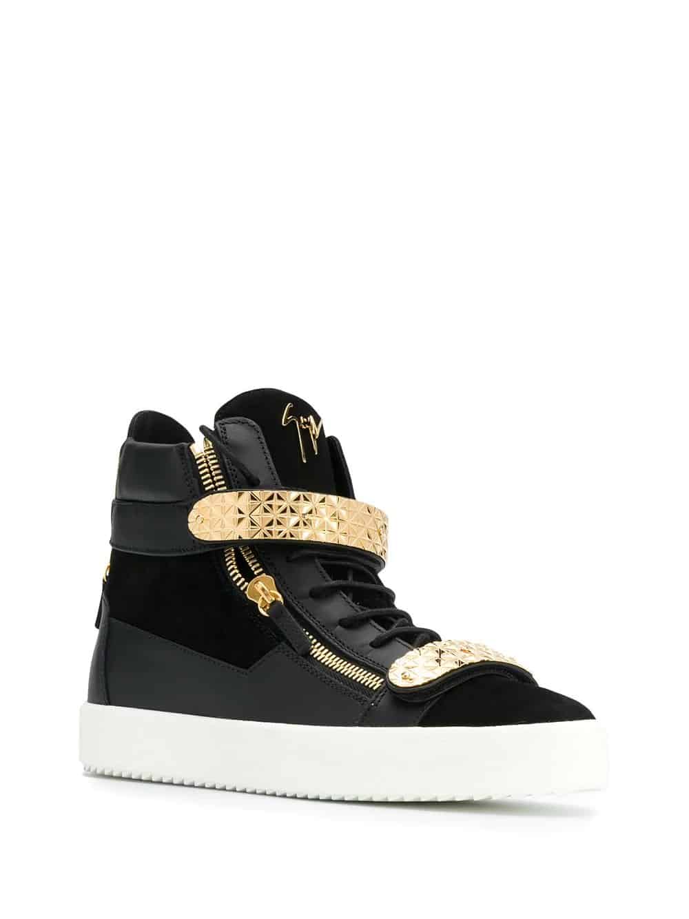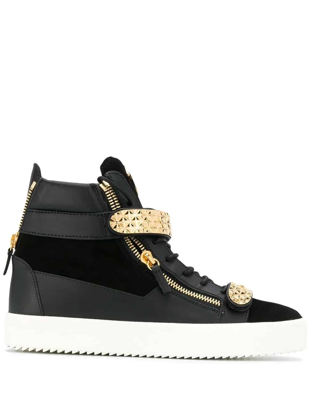 Guiseppe Zanotti Design jewellery draws inspiration from the red carpet with opulent crystal details and in-house formed plate metal work. These black and gold-tone Archer Dual sneakers are crafted from leather and suede and feature a round toe, a flat sole, a logo patch at the tongue, an ankle length, a branded insole, a lace-up front fastening, metal plates and side zip detailing.