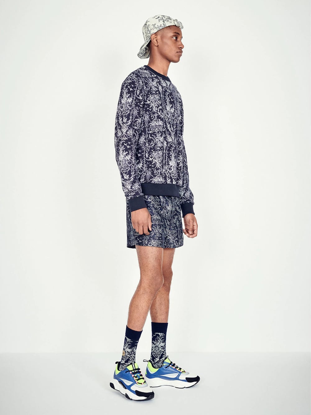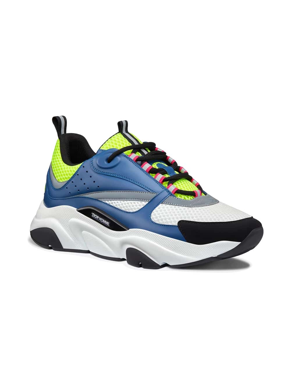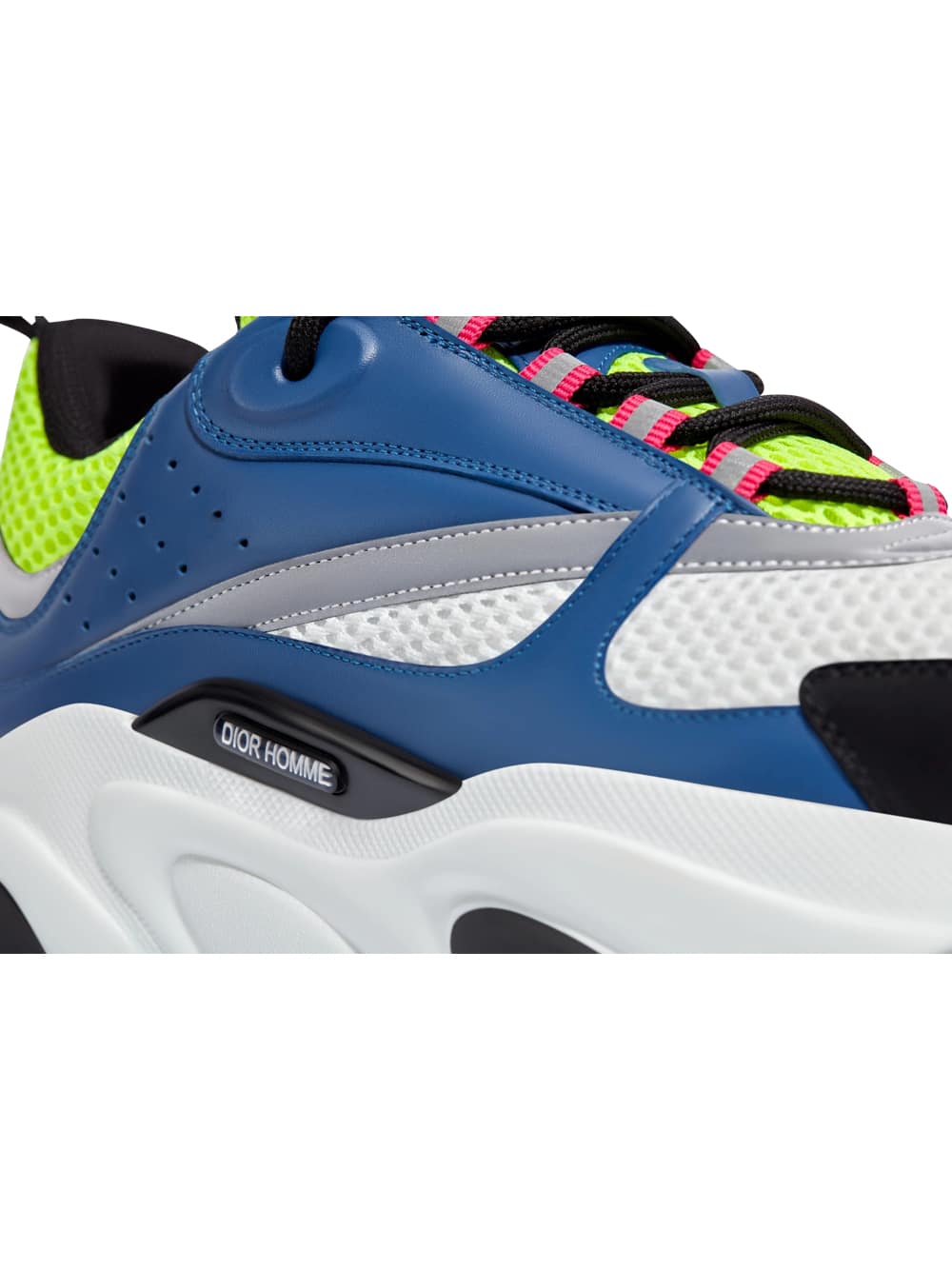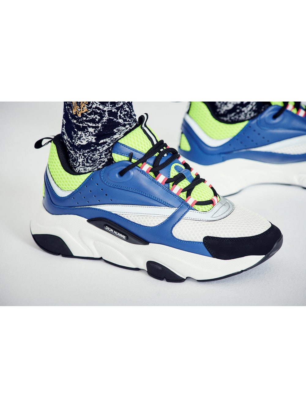“B22” sneaker in yellow and white technical knit and blue and black calfskin, white and black rubber sole.