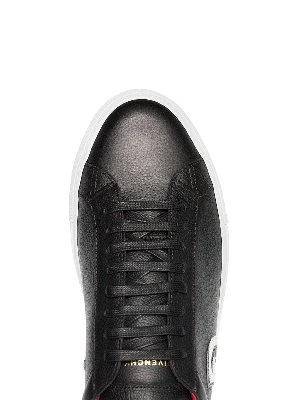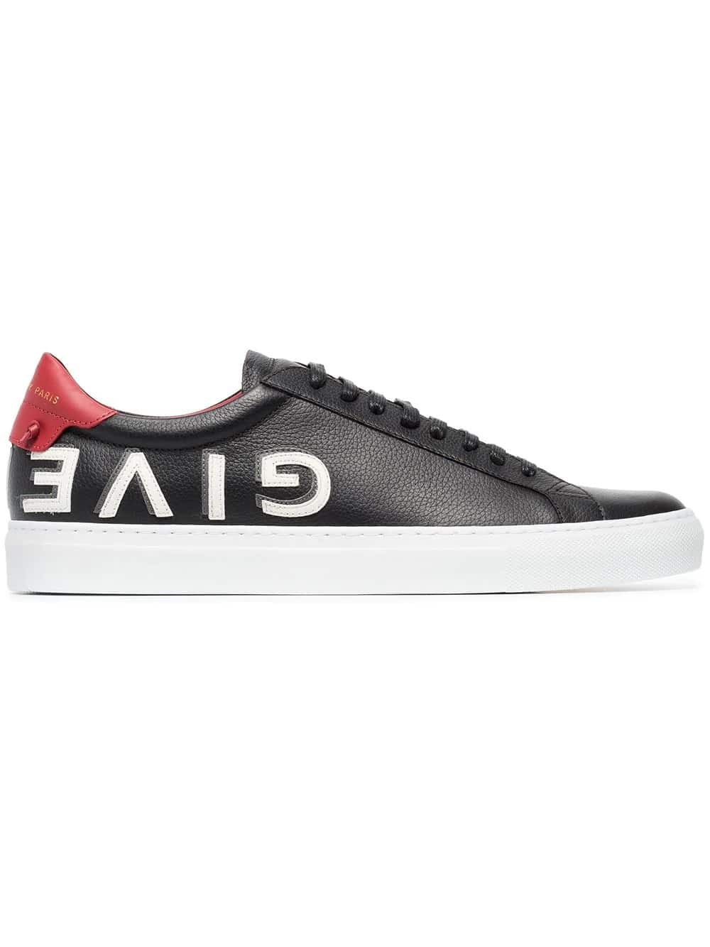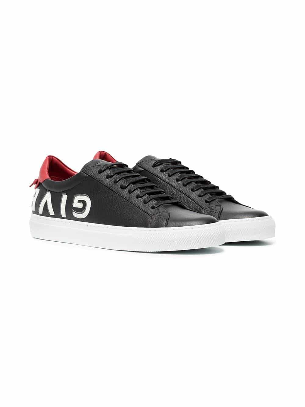 In keeping with the labels idiosyncratic values, these Givenchy Urban Street sneakers riff on the classic tennis shoe. Designed with a low top silhouette and presented in black, red and white; these Urban Street sneakers benefit from a round toe, a lace-up front fastening, logo embossing at the tongue and heel, a signature knot detail and a white rubber sole.