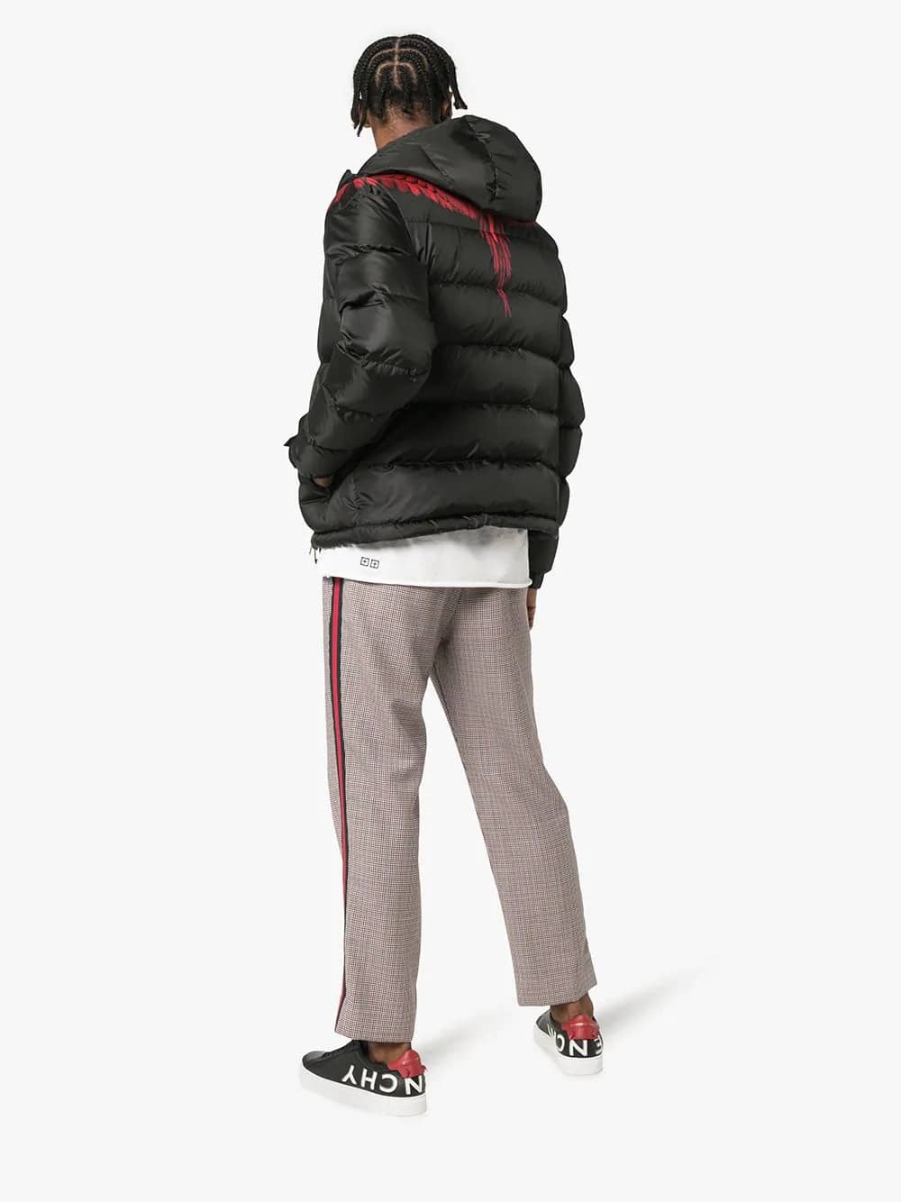 The model is also styled with: Gucci Houndstooth wool mohair track pants, Ksubi white vague tShirt, Marcelo Burlon County Of Milan wings down jacket.