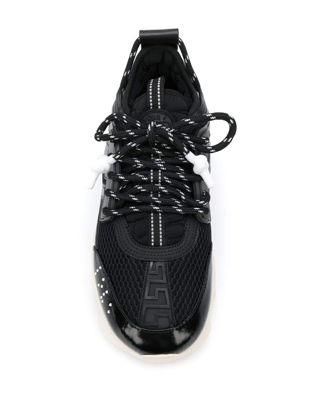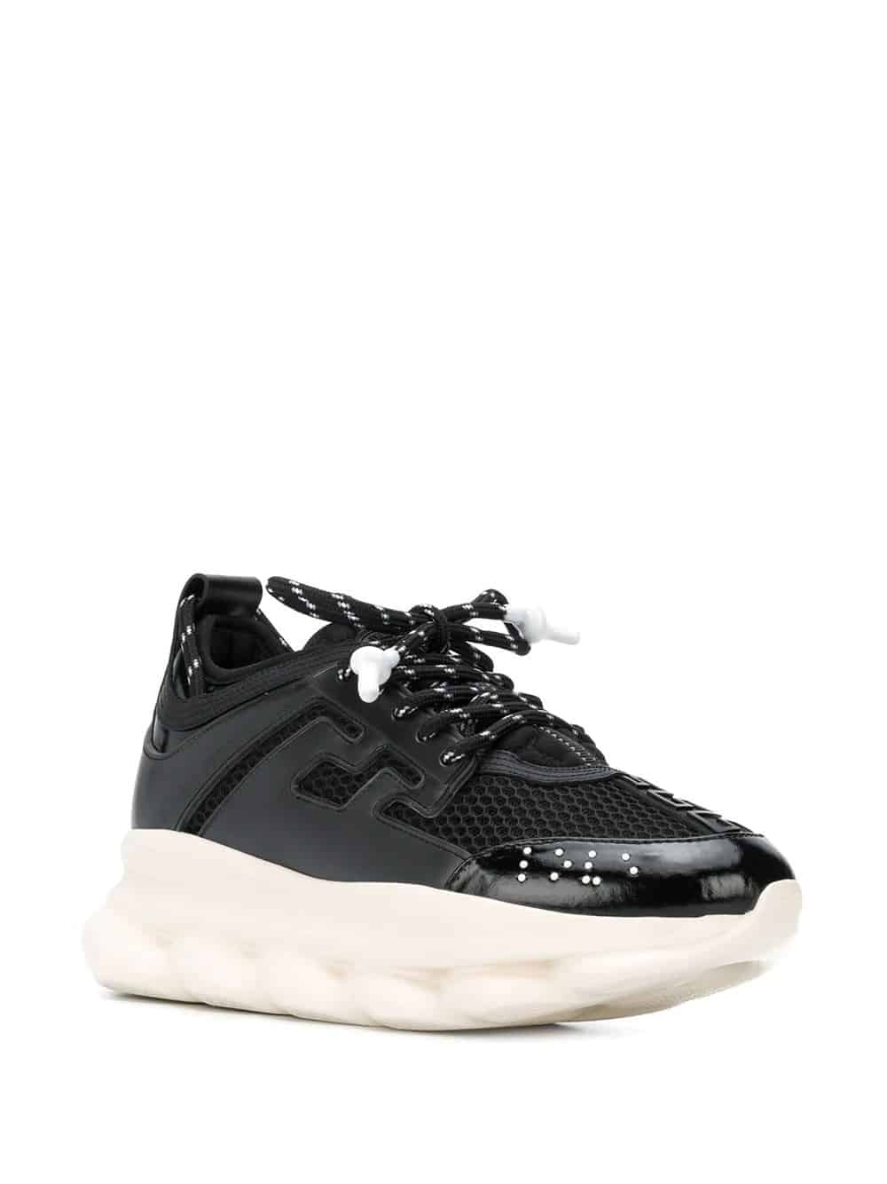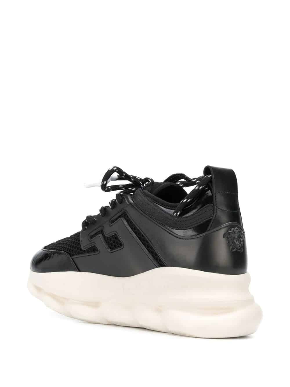 Since its founding in 1978, Versace has been synonymous with luxury fashion. Iconic prints and characteristically glamorous designs sit alongside sleek, modern ideas. These black chain reaction sneakers feature a round toe, contrasting panels, stitched panels, a lace-up front fastening, a logo patch at the tongue, a pull tab at the rear, a Medusa head logo embellishment and a platform sole.