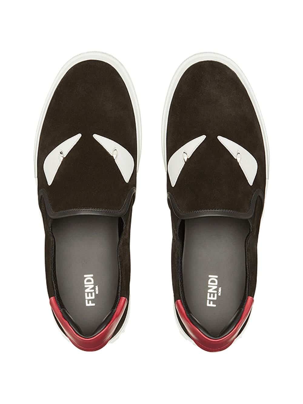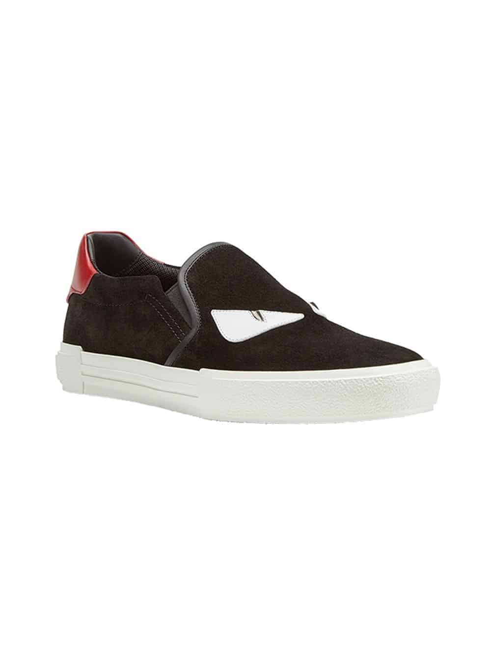 Lighting bolts, monster faces and pops of primary hued shearling punctuate the classical Italian cordwaining of the house of Fendi. These black leather embellished slip-on sneakers from Fendi feature a round toe, a slip-on style, a branded insole, a white rubber sole, a contrasting red heel counter and white inlays with metal studs at the front to recreate the Bag Bugs eyes.