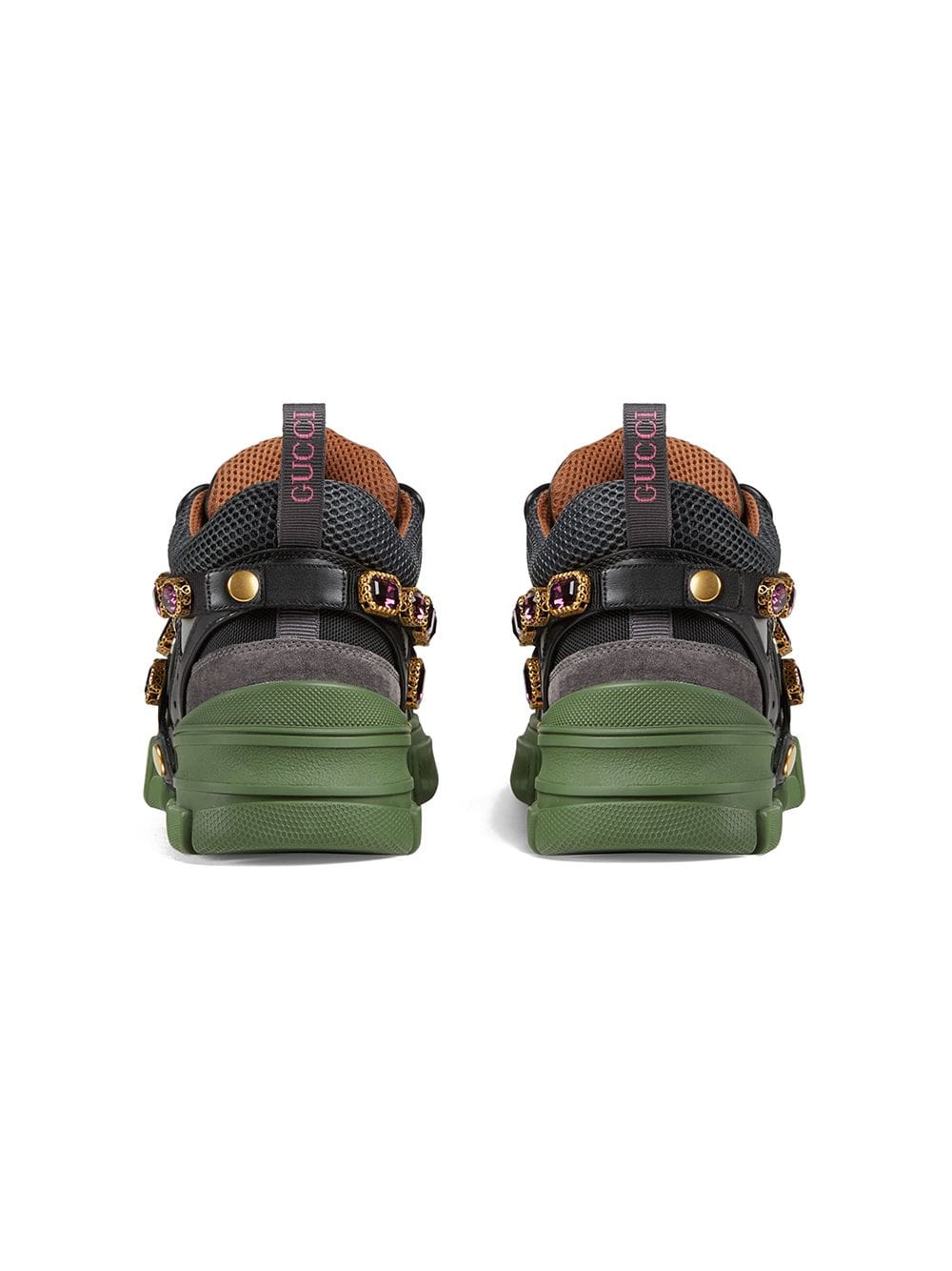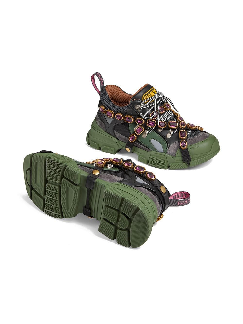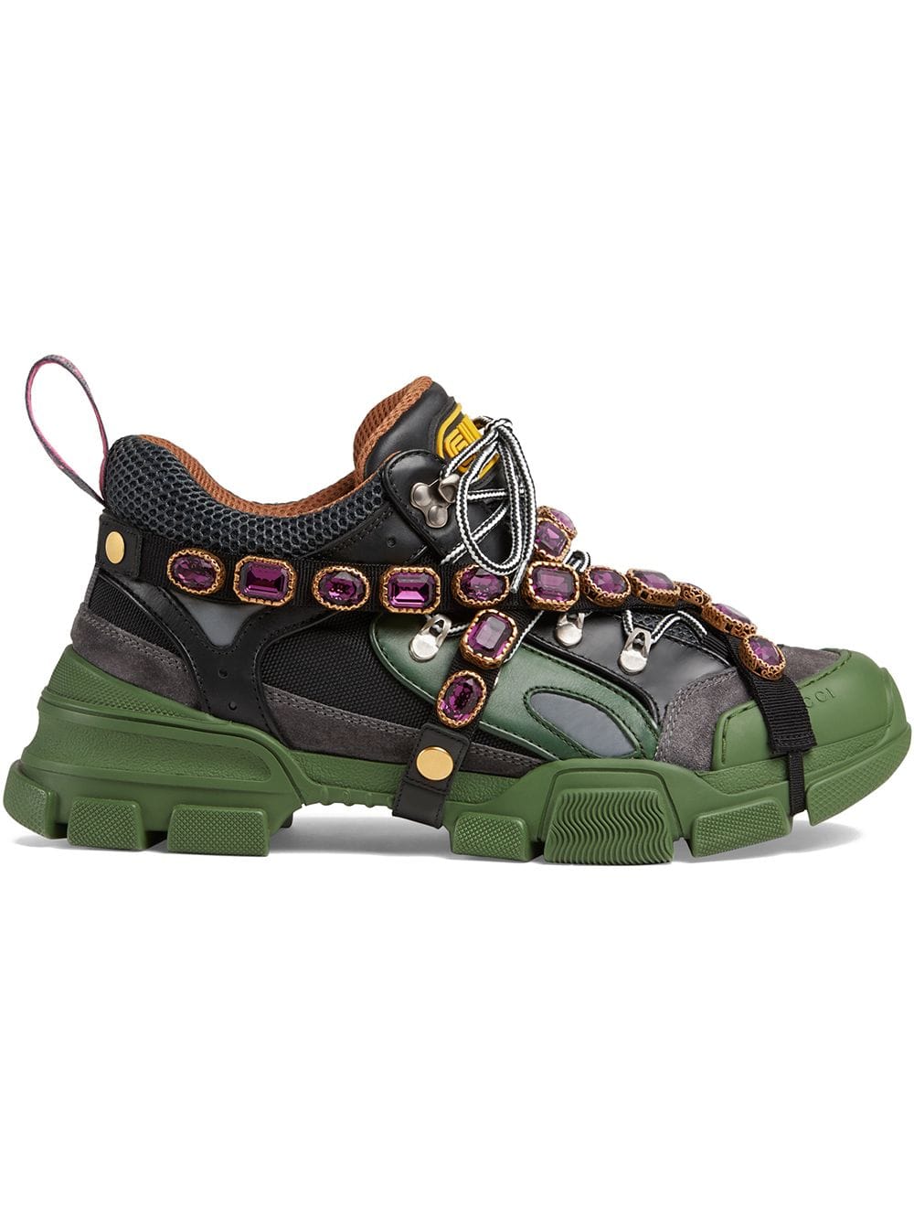 Sparkling crystals are embroidered onto a removable elastic strap, wrapping around the sneakers and resulting in a kaleidoscope effect. Inspired by the hiking world, this shoe line combines an oversize design with dream-like details. Featuring a dynamic mix of materials – rubber, suede, leather and technical canvas – the accessory is defined by the Gucci patch with the graphic font of SEGA, a fixture in the colorful arcades and coin-op game rooms of the ’80s. Green and black leather, grey suede and black technical canvas. Men’s. Removable elastic ribbon with crystals. Rubber Gucci patch in SEGA font, used with permission of Sega Holdings Co., Ltd.. Perforated padded ankle detail. Rubber lug sole. Gucci Team loop. 70mm height. Made in Italy. For the most comfortable fit please select half a size down.