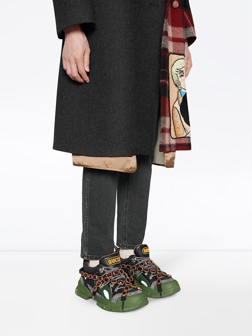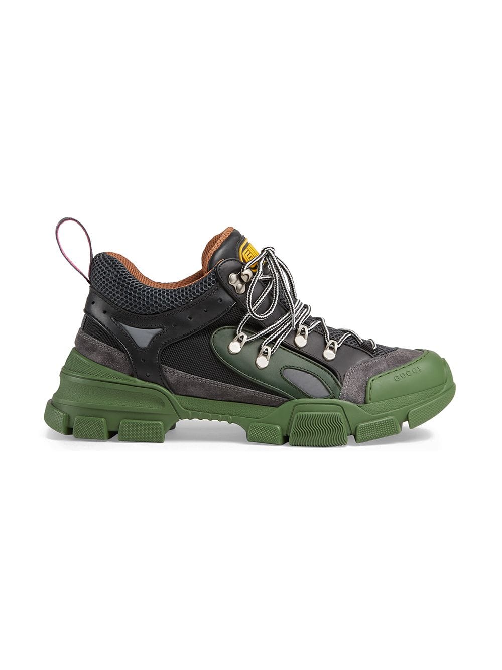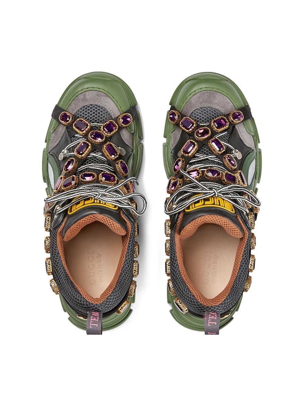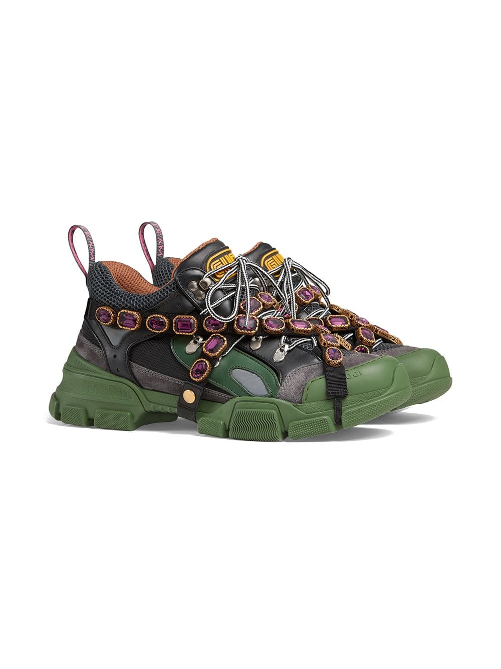 Sparkling crystals are embroidered onto a removable elastic strap, wrapping around the sneakers and resulting in a kaleidoscope effect. Inspired by the hiking world, this shoe line combines an oversize design with dream-like details. Featuring a dynamic mix of materials – rubber, suede, leather and technical canvas – the accessory is defined by the Gucci patch with the graphic font of SEGA, a fixture in the colorful arcades and coin-op game rooms of the ’80s. Green and black leather, grey suede and black technical canvas. Men’s. Removable elastic ribbon with crystals. Rubber Gucci patch in SEGA font, used with permission of Sega Holdings Co., Ltd.. Perforated padded ankle detail. Rubber lug sole. Gucci Team loop. 70mm height. Made in Italy. For the most comfortable fit please select half a size down.