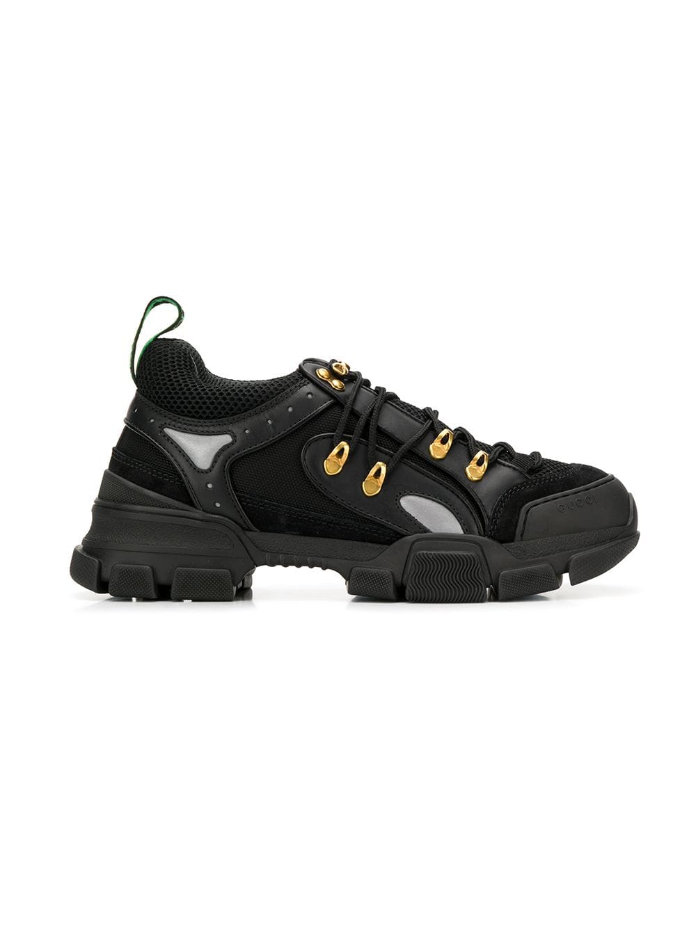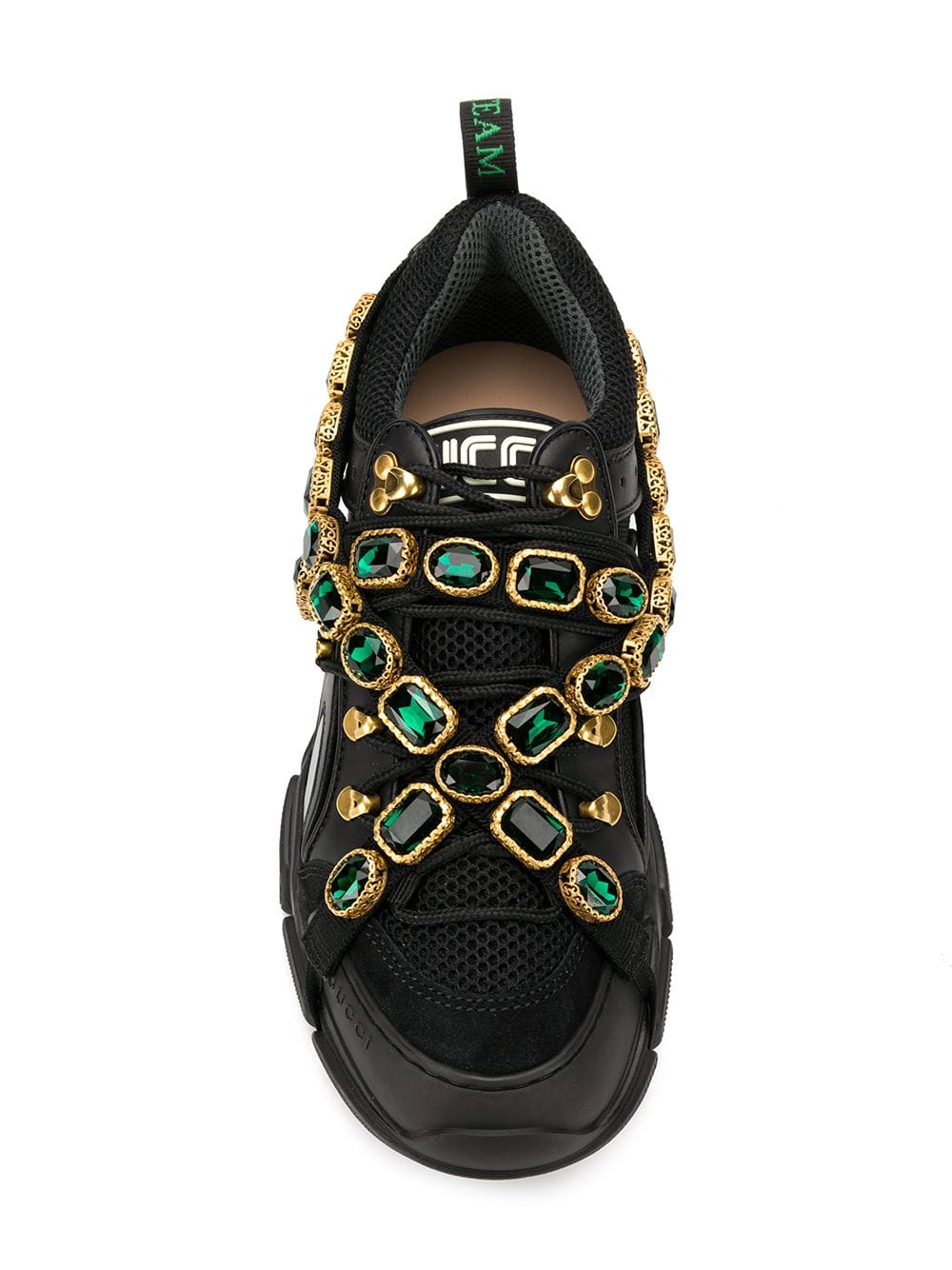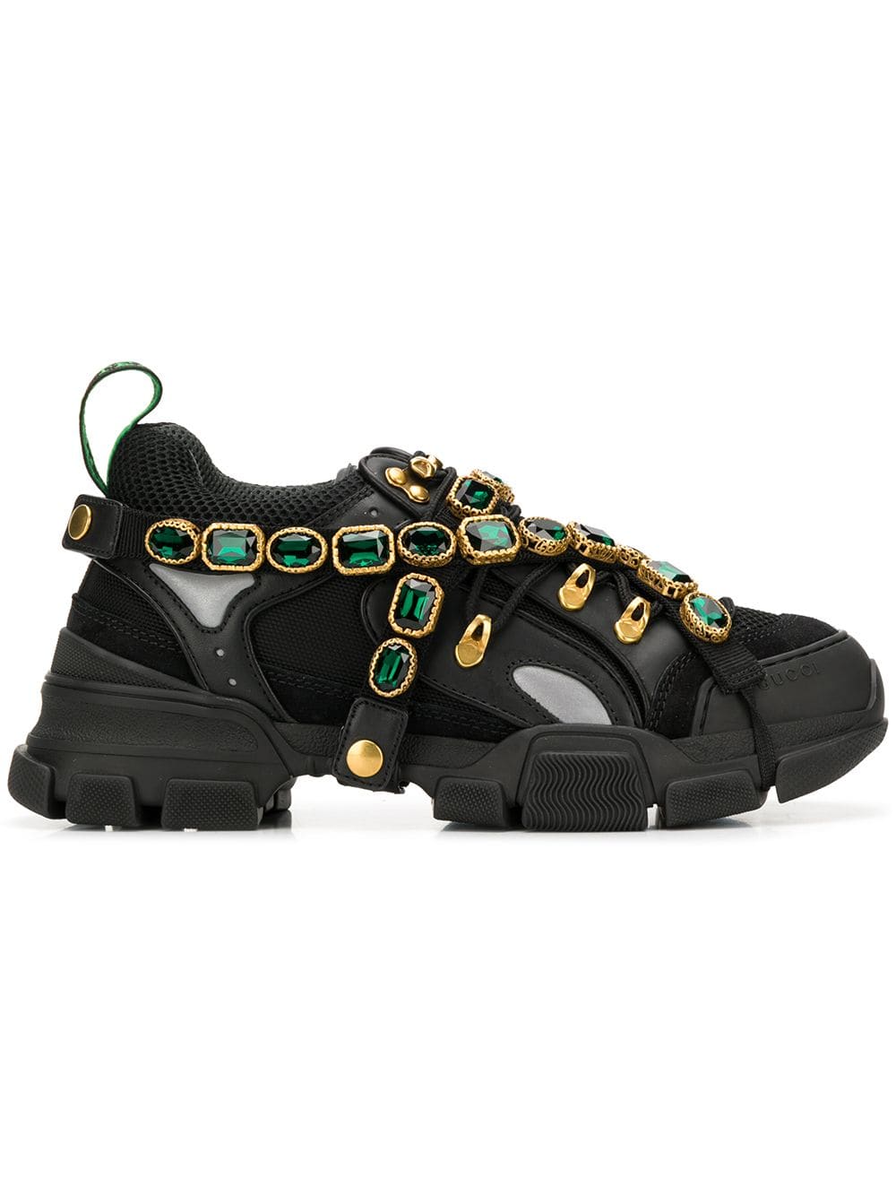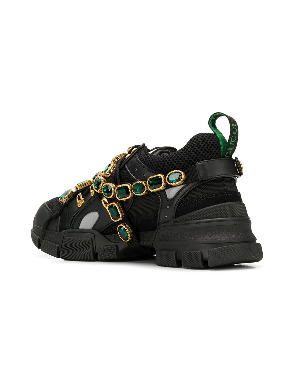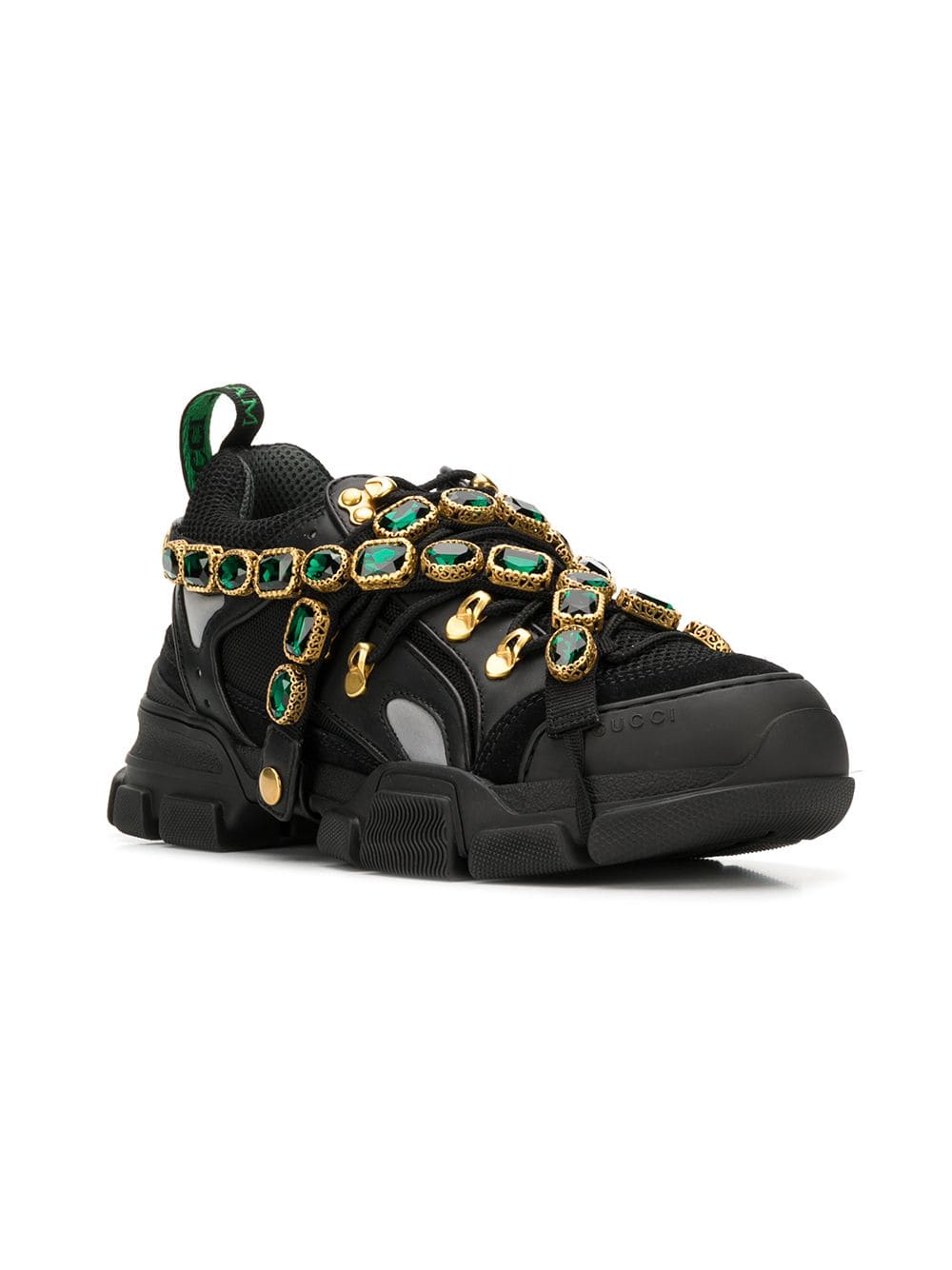 Multicolor crystals are embroidered onto a removable elastic strap, wrapping around the sneakers and resulting in a kaleidoscope effect. Inspired by the hiking world, this shoe line combines an oversize design with dream-like details. Featuring a vibrant mix of metallic leathers in different colors, the accessory is defined by the Gucci patch with the graphic font of SEGA – a fixture in the colorful arcades and coin-op game rooms of the ’80s. Black and grey leather. Removable elastic ribbon with crystals. Rubber Gucci patch in SEGA font, used with permission of Sega Holdings Co., Ltd. Perforated padded ankle detail. Rubber lug sole. Gucci Team loop. 55mm height. Made in Italy. For the most comfortable fit please select half a size down.