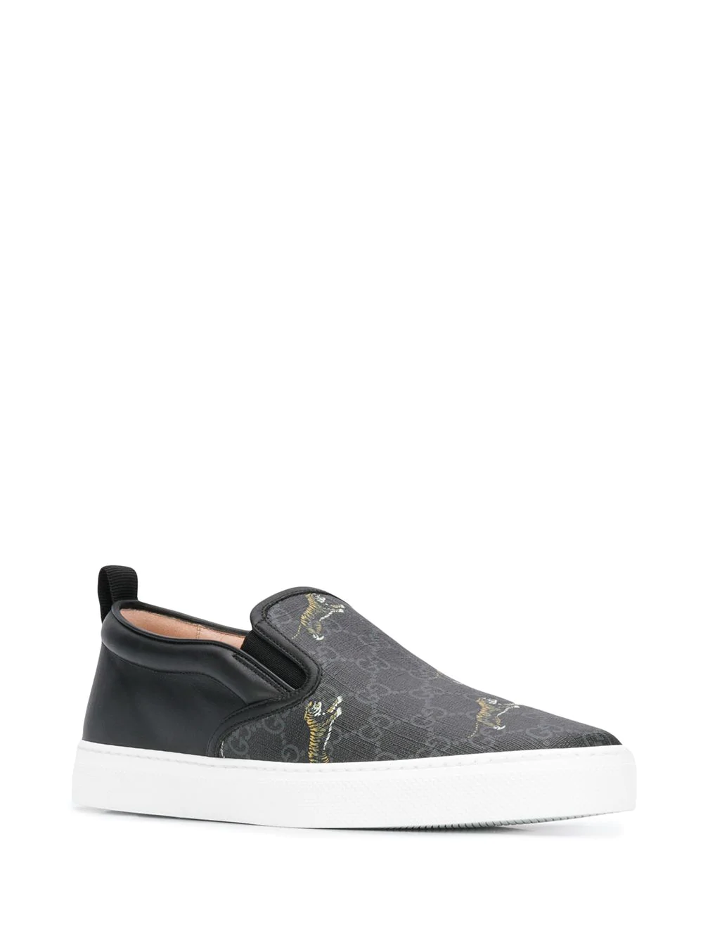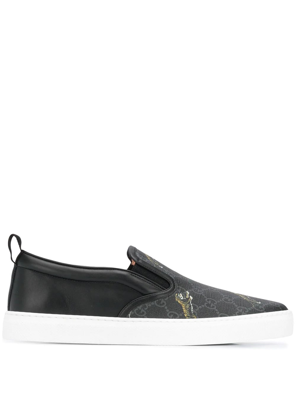 The Gucci collection is the pinnacle of Italian craftsmanship and attention to detail as seen in these black leather GG print tiger sneakers. Featuring a round toe, a slip-on style, a brand embossed insole, a pull tab at the rear and a white rubber sole.