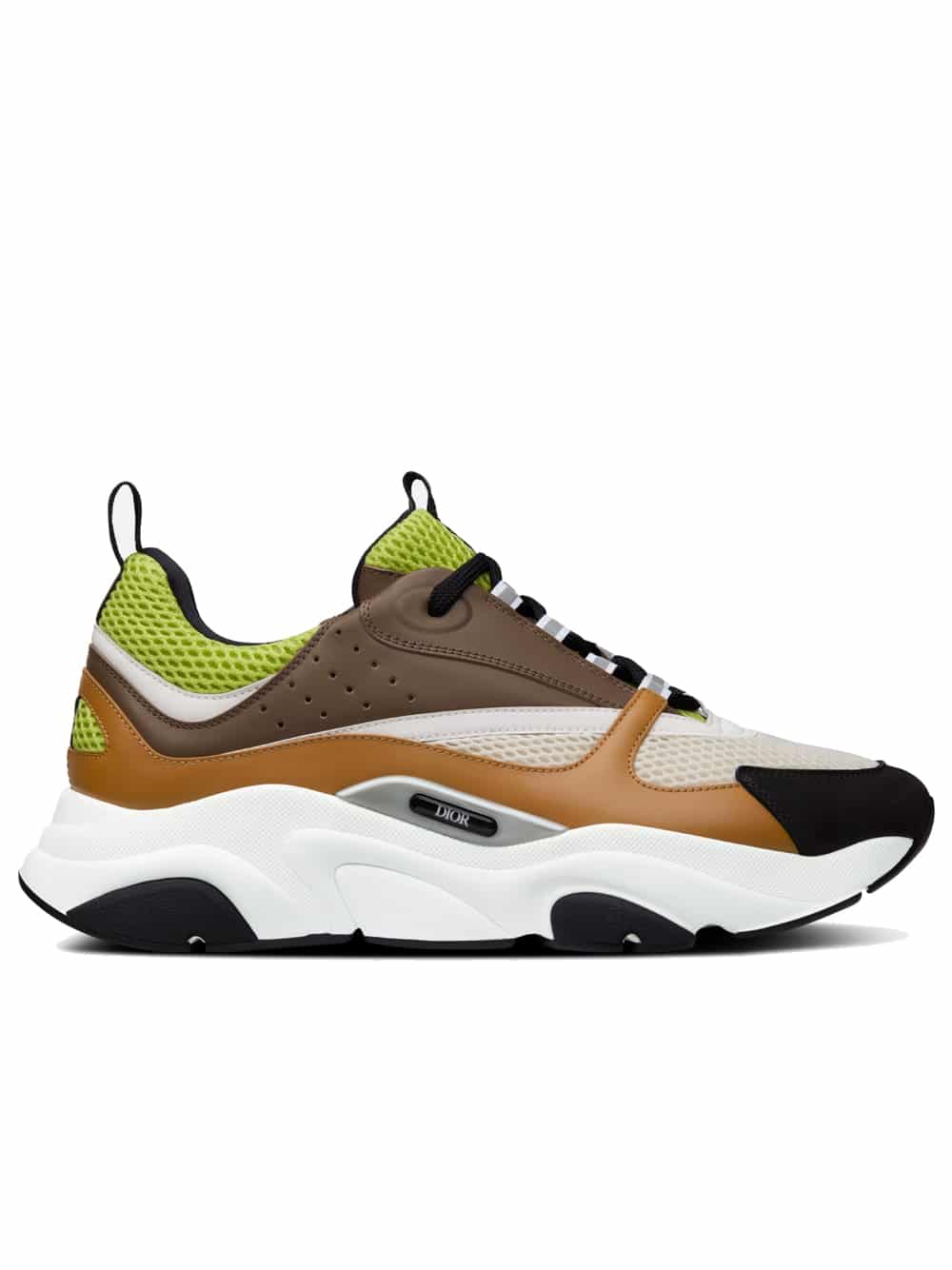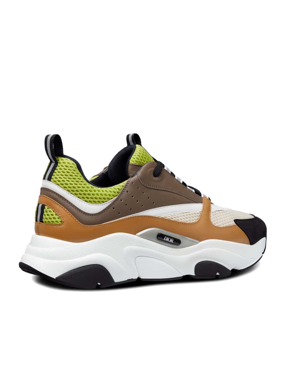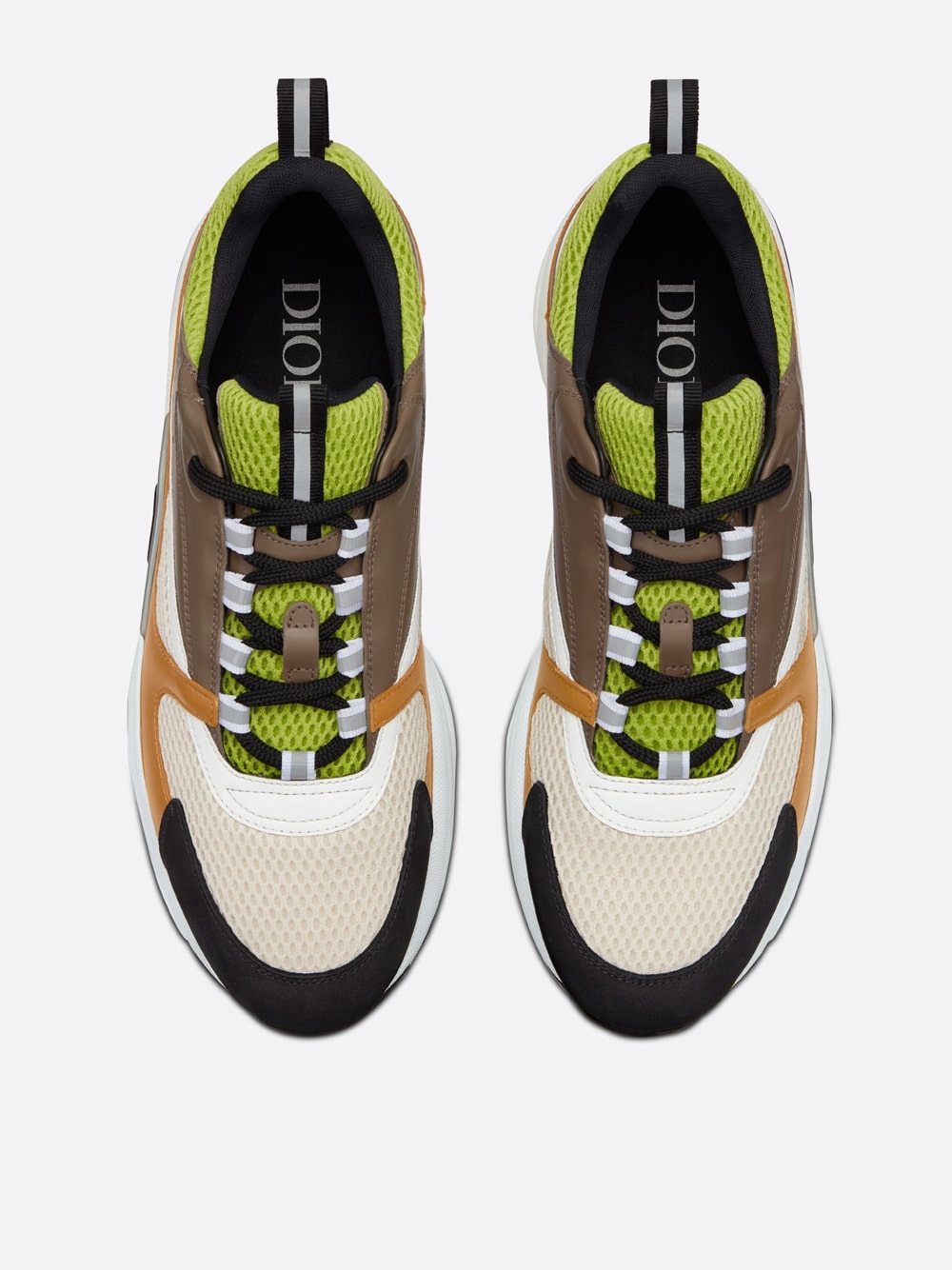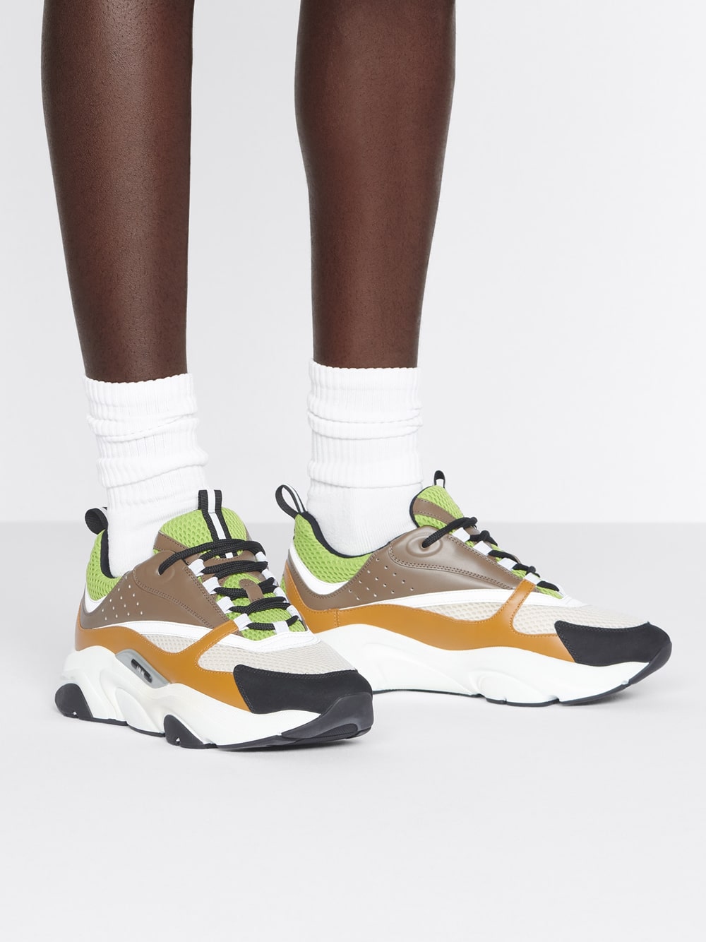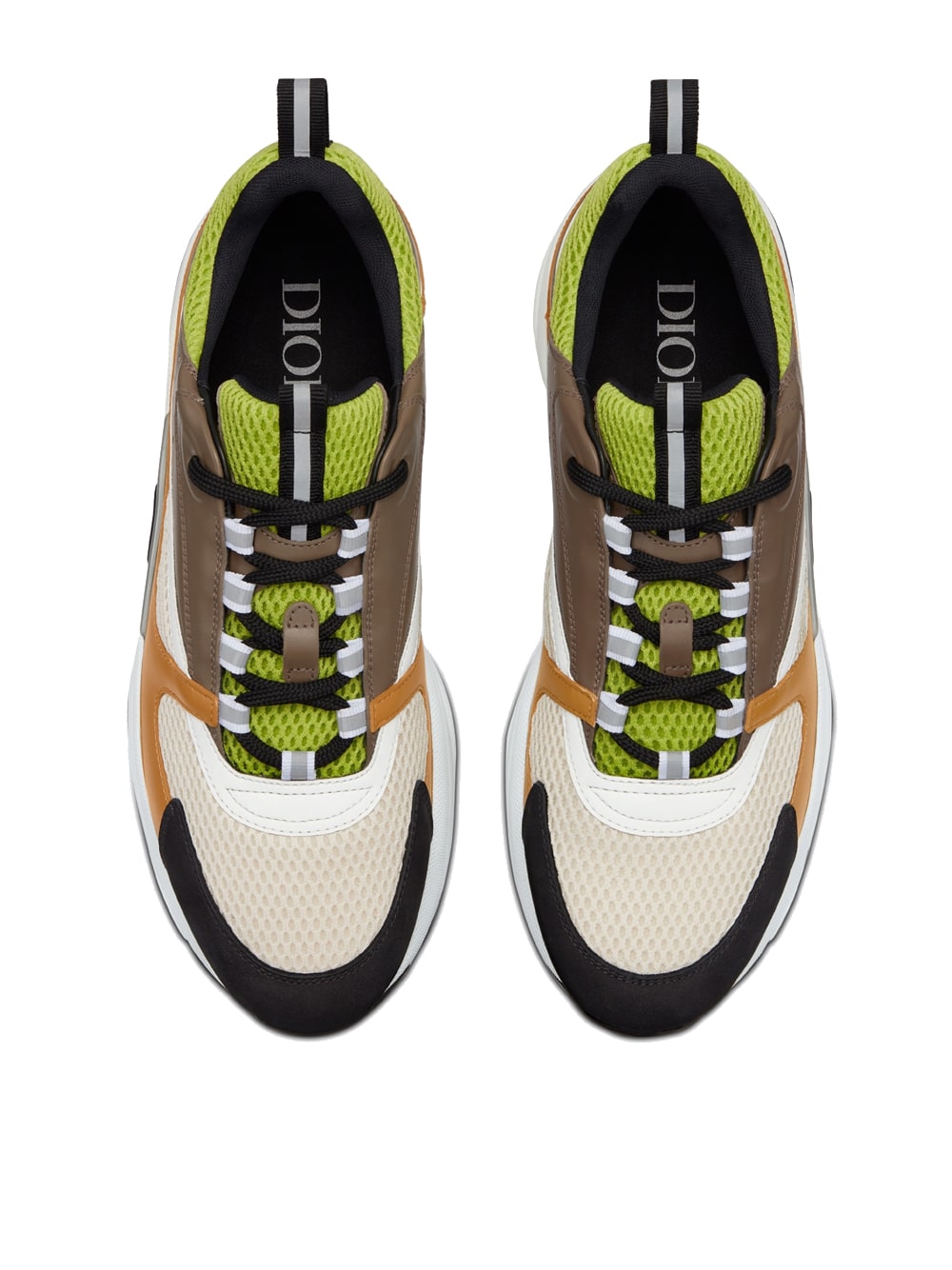 The B22 sneaker reimagines the chunky sneaker through a retro lens. Combining different materials and textures, including ebony and camel smooth calfskin and green and white technical mesh, it has a bold, sportswear aesthetic. Round laces and a raised ‘DIOR’ signature on the side complement the thick, sculpted, white rubber sole. The sneaker can be worn with any relaxed outfit for a sporty and contemporary silhouette.