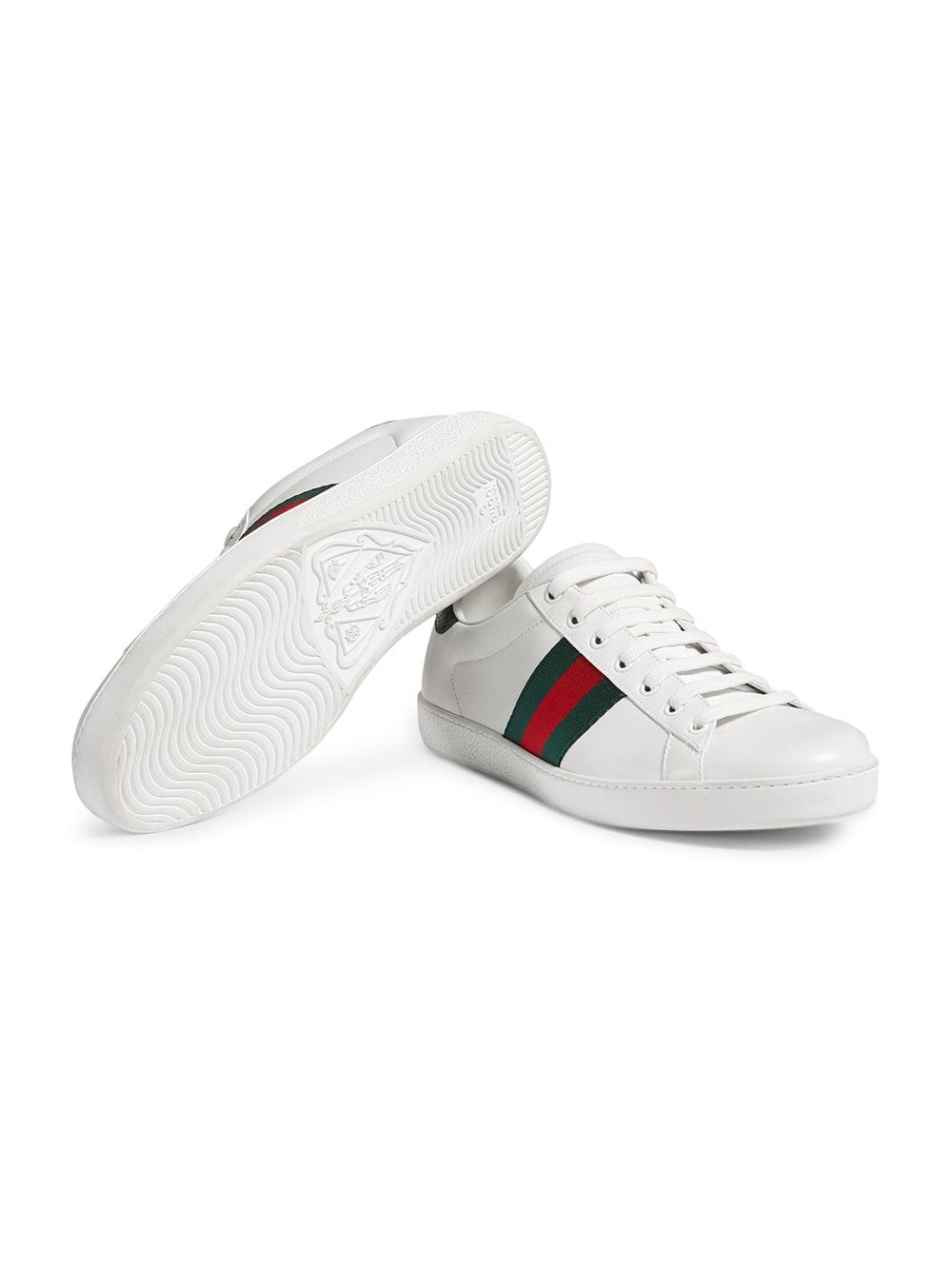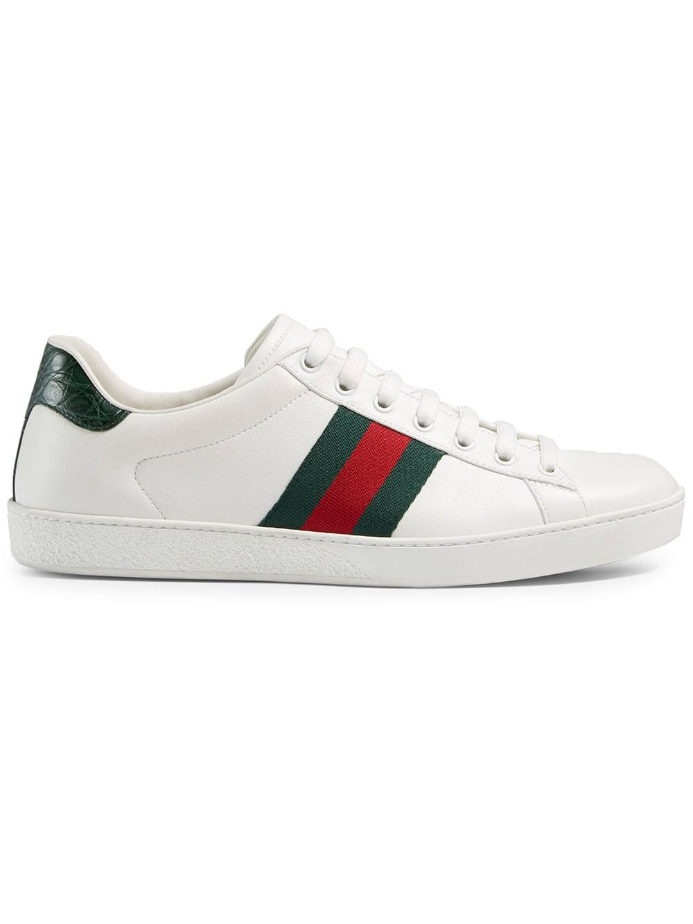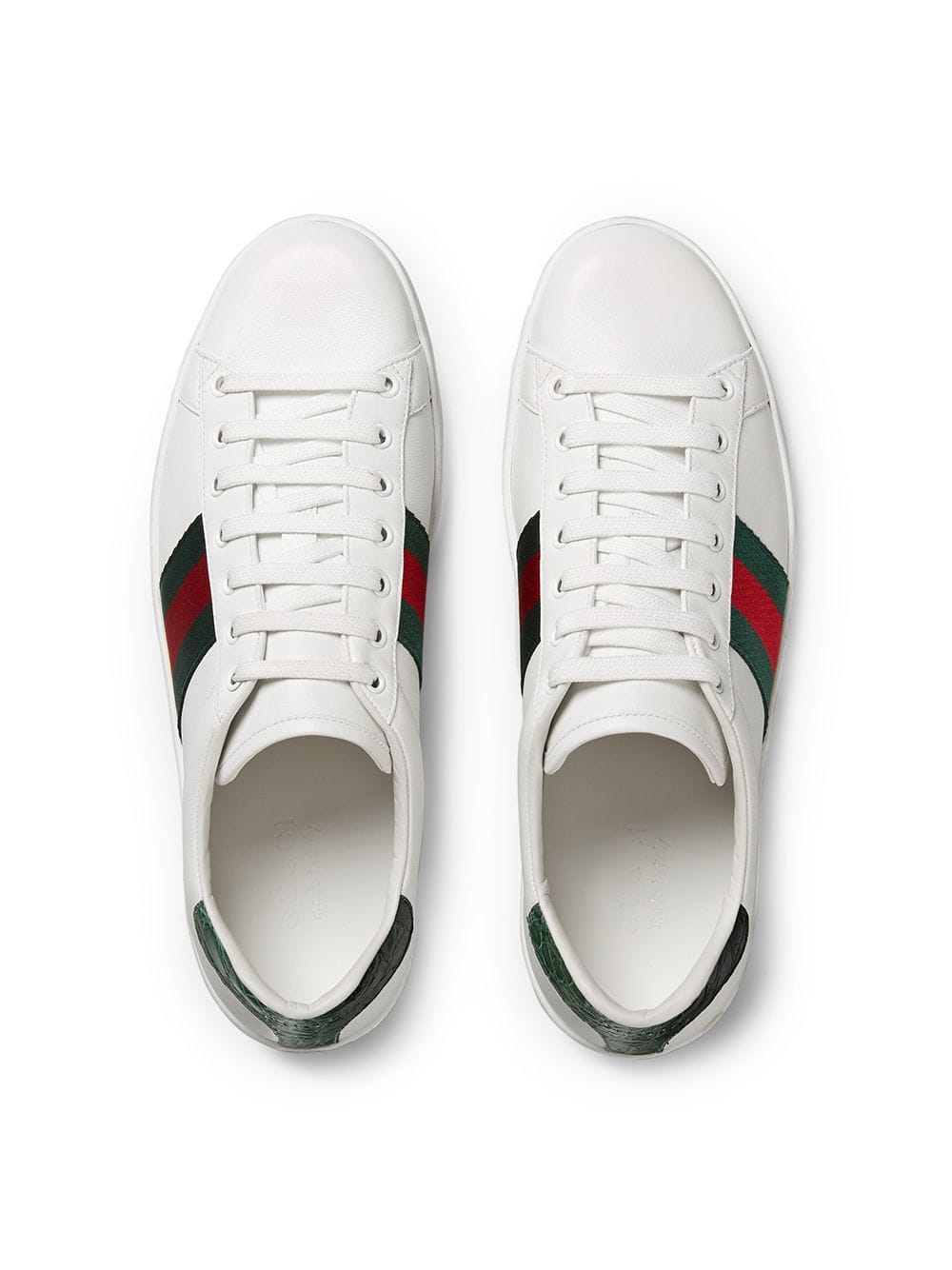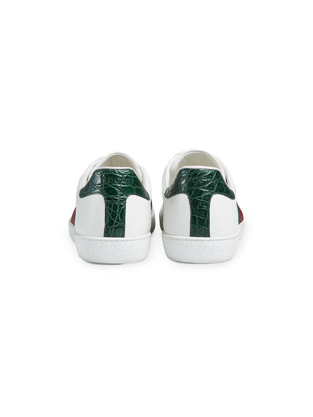 White leather with green and red Web. Green crocodile detail at the back. Rubber sole. .25″ height. Made in Italy.