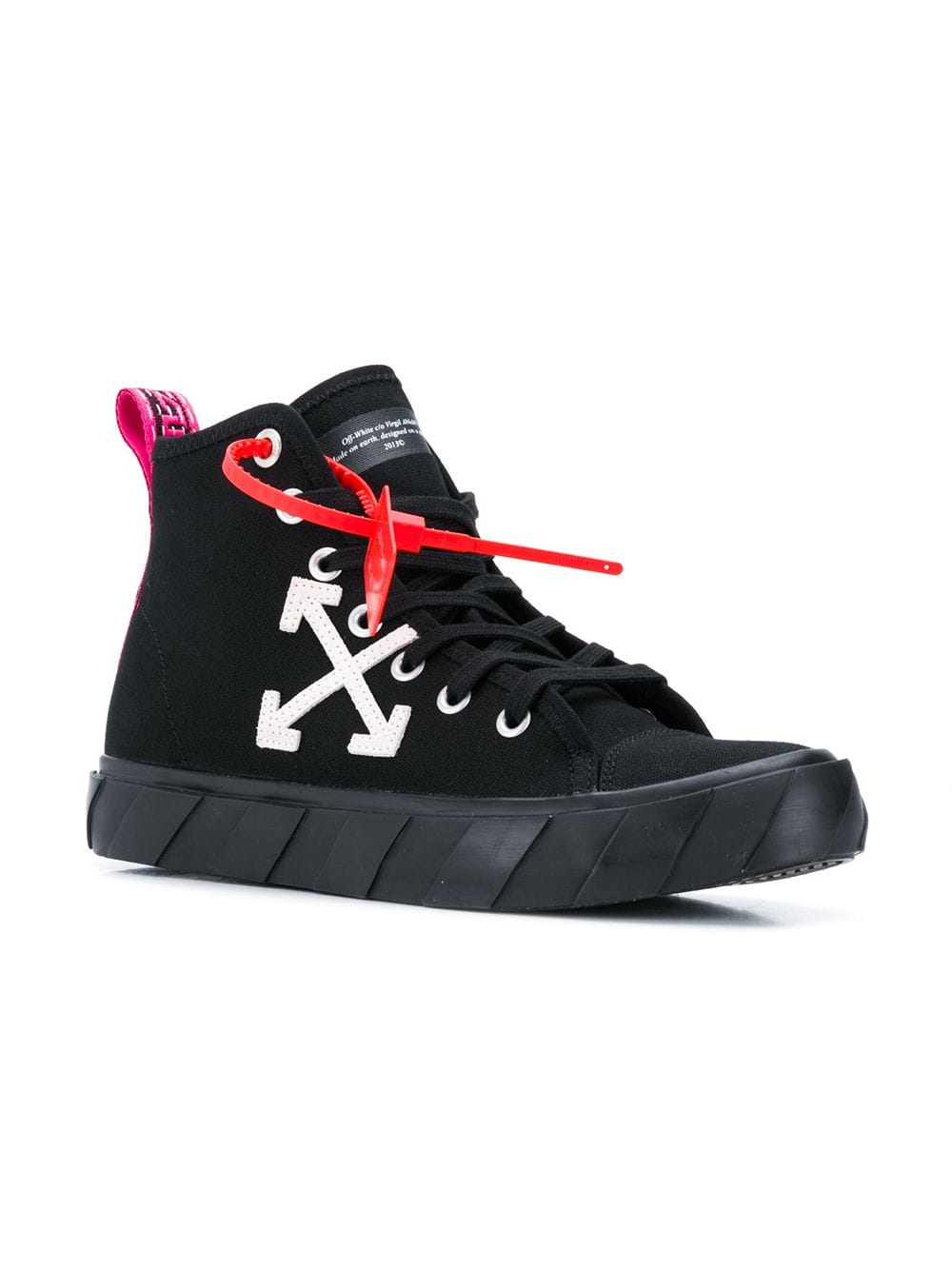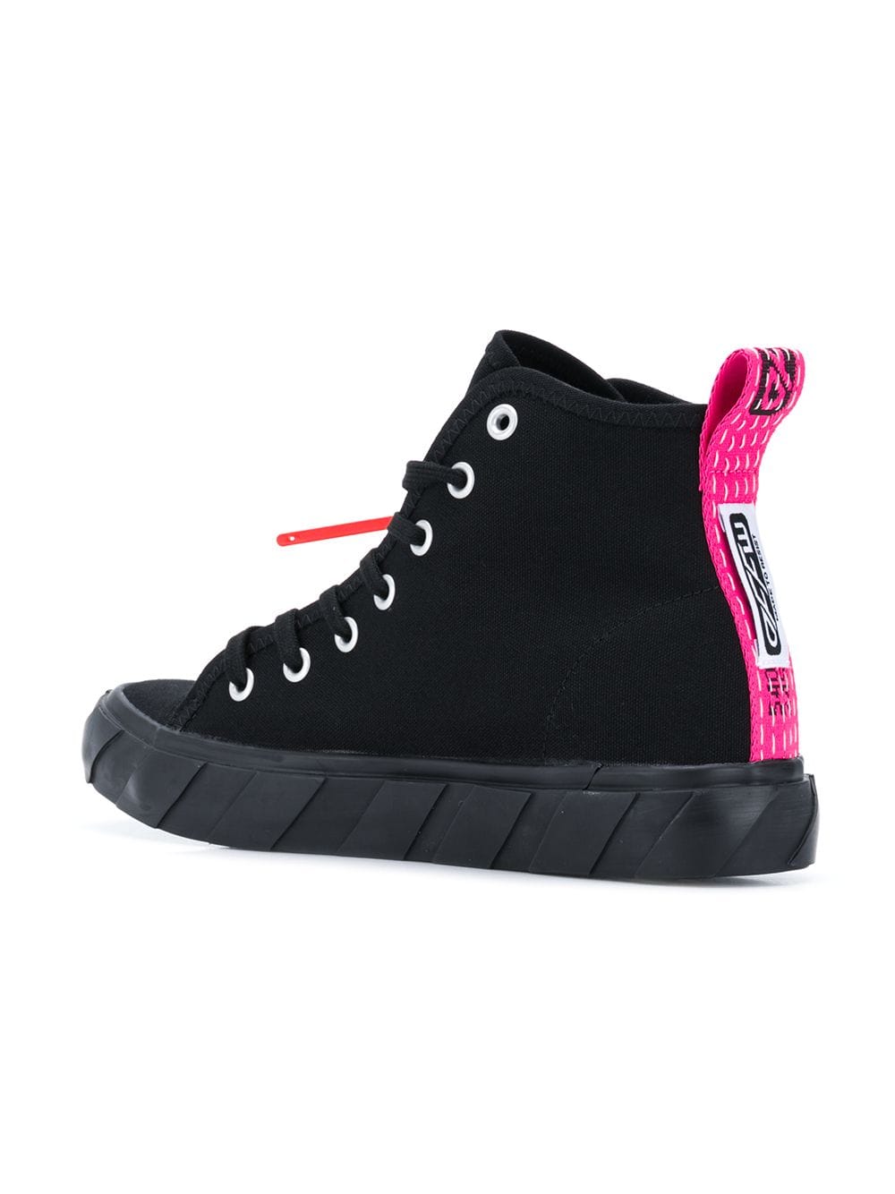 Headquartered in Milan, the youth-driven label Off-White is committed to redefining the meaning of streetwear within high-fashion. These black and white hi-top logo sneakers are crafted from cotton and feature a round toe, a flat rubber sole, a pull tab at the rear, a lace-up front fastening, side logo branding and a tag detail.