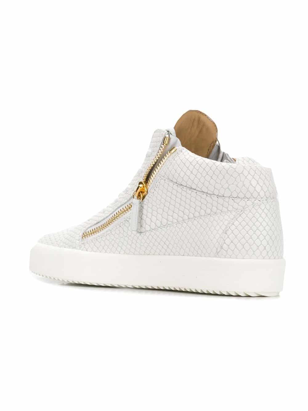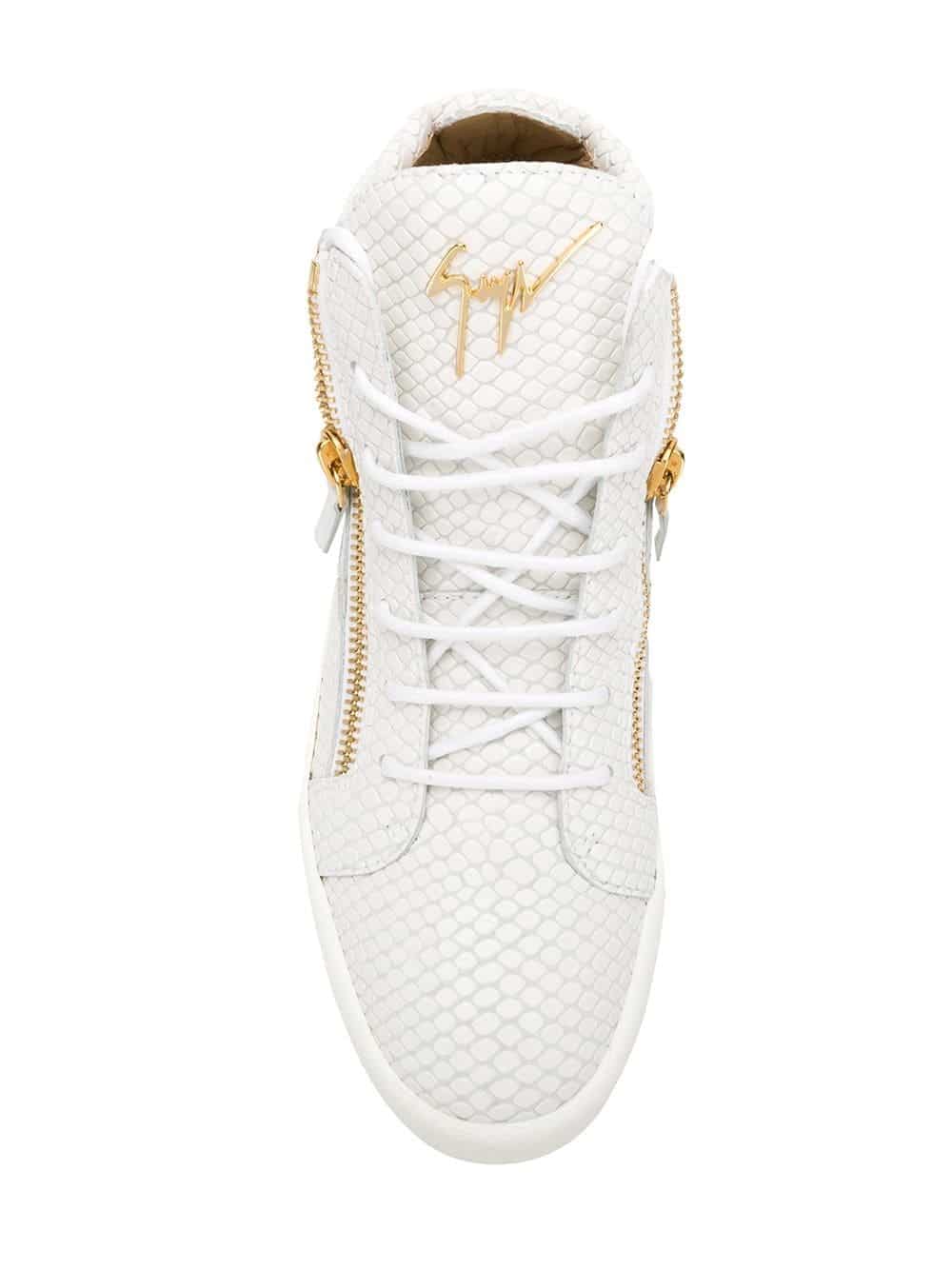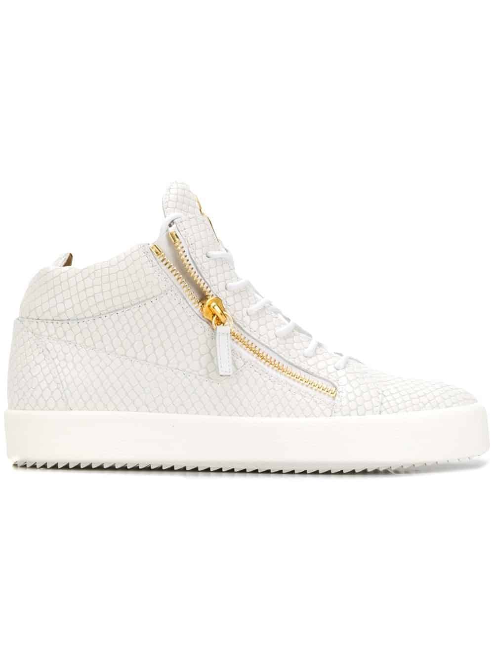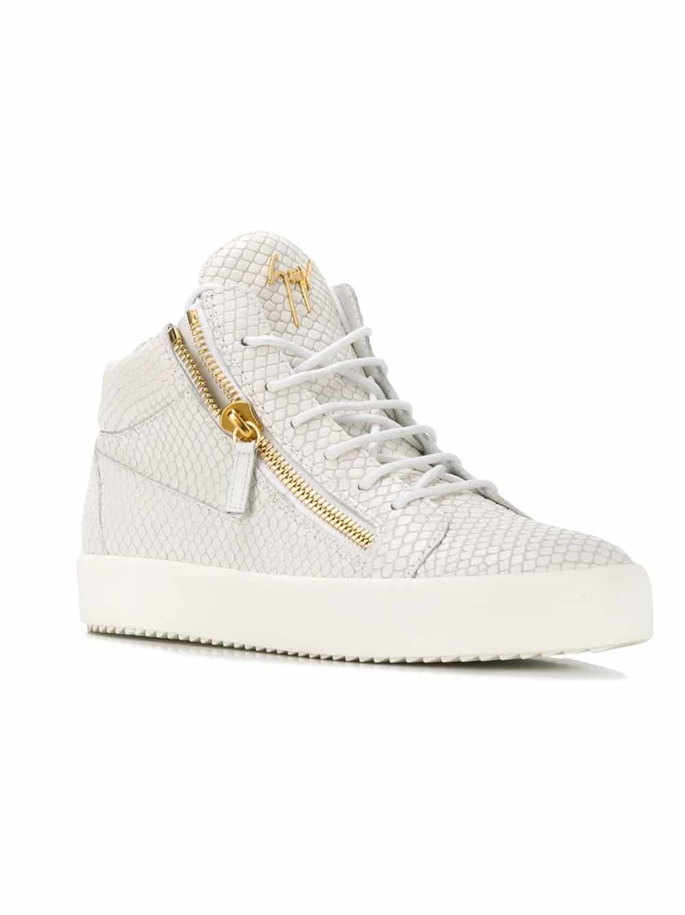 Known for his perfectly crafted urban cool sneakers, Giuseppe Zanotti creates street-wear pieces that are the height of sports luxury. These white leather Kriss hi-top sneakers from Giuseppe Zanotti Design feature side zip details, a gold-tone logo plaque, a lace fastening, a white rubber sole, an oversize tongue and a textured leather detail.