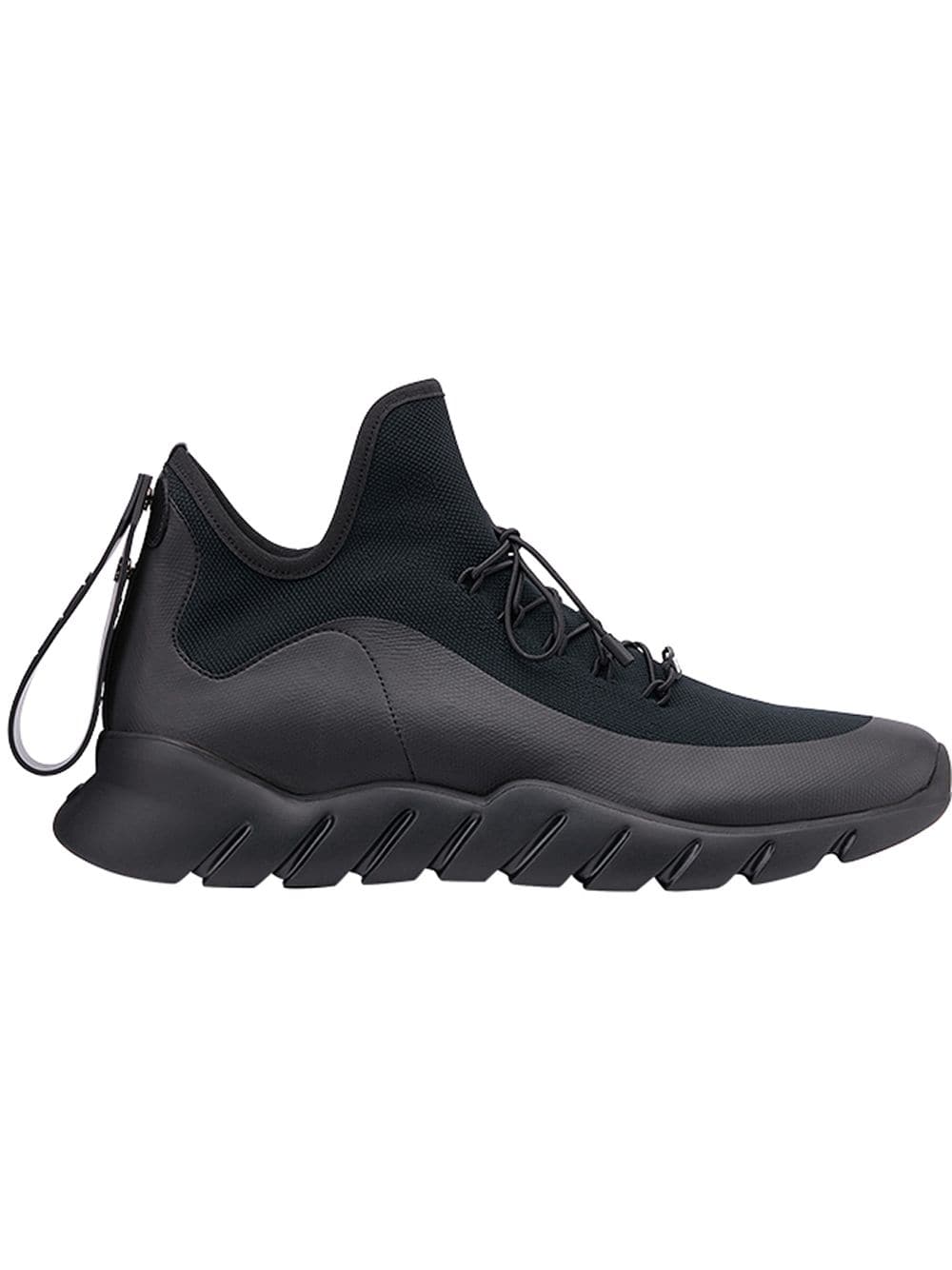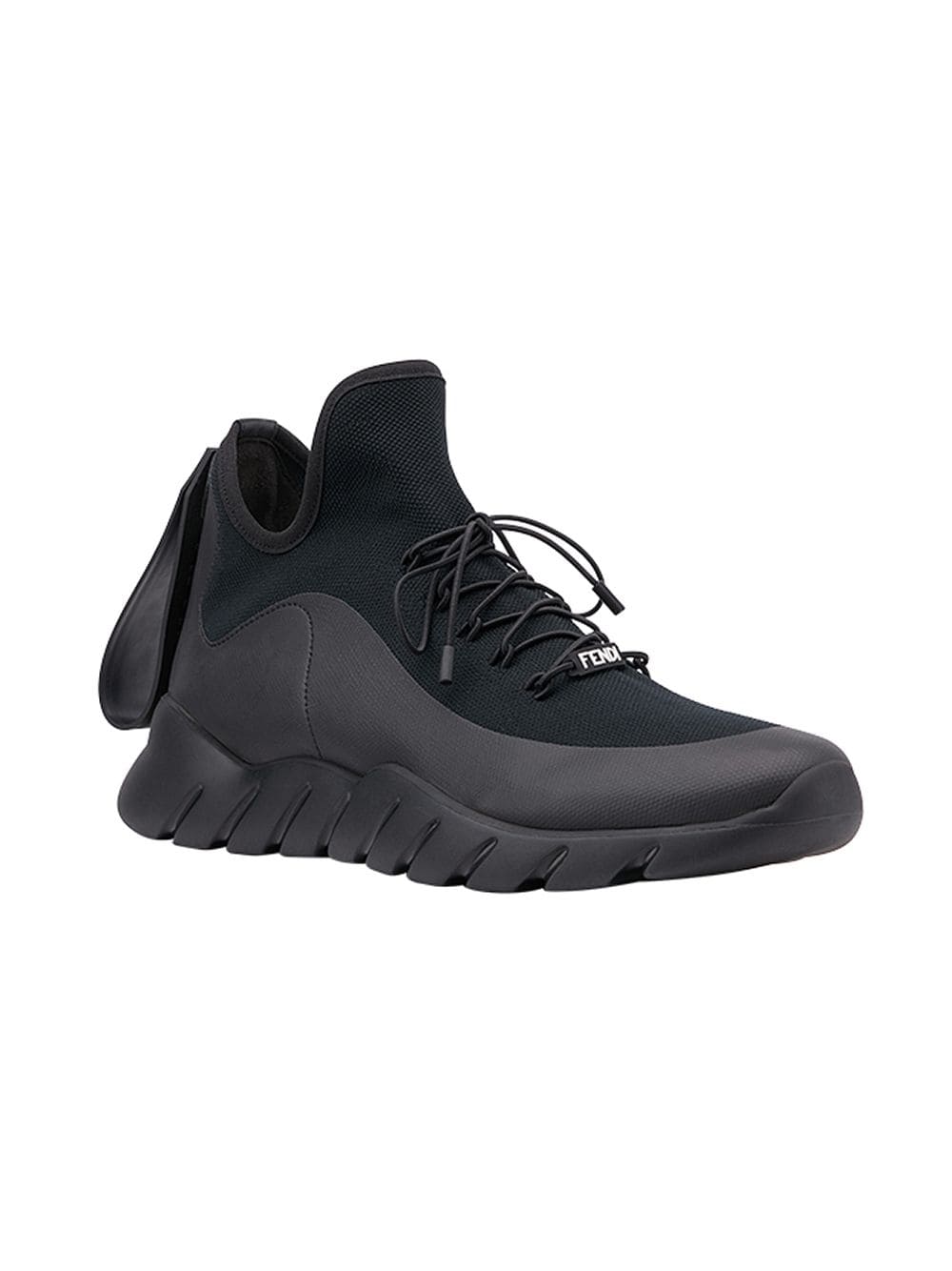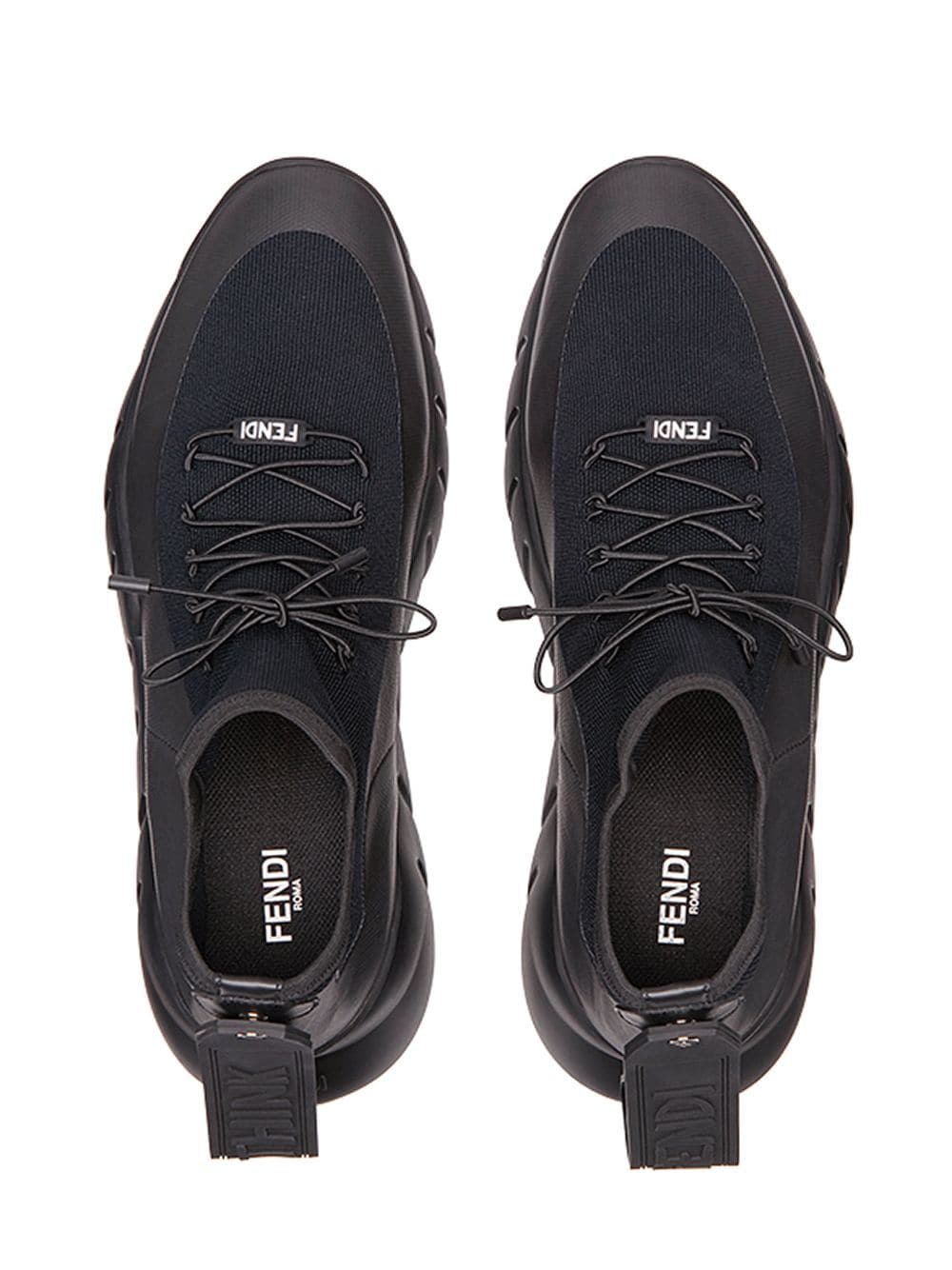 Fendi footwear takes heritage Roman cordwaining technique and traditional forms, imbibing lasts with the lively mode of the maison. Sock knitted uppers are combined with geometric sporty soles for a futuristic take on fashion forward footwear. These black calf leather lace-up sneakers from Fendi feature an almond toe, a lace-up front fastening, an oversize tongue, a branded insole and a ridged rubber sole.
