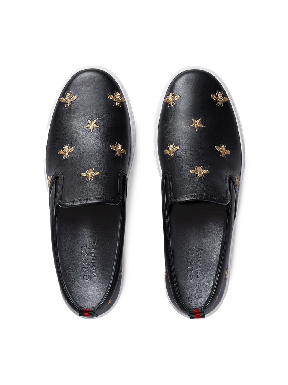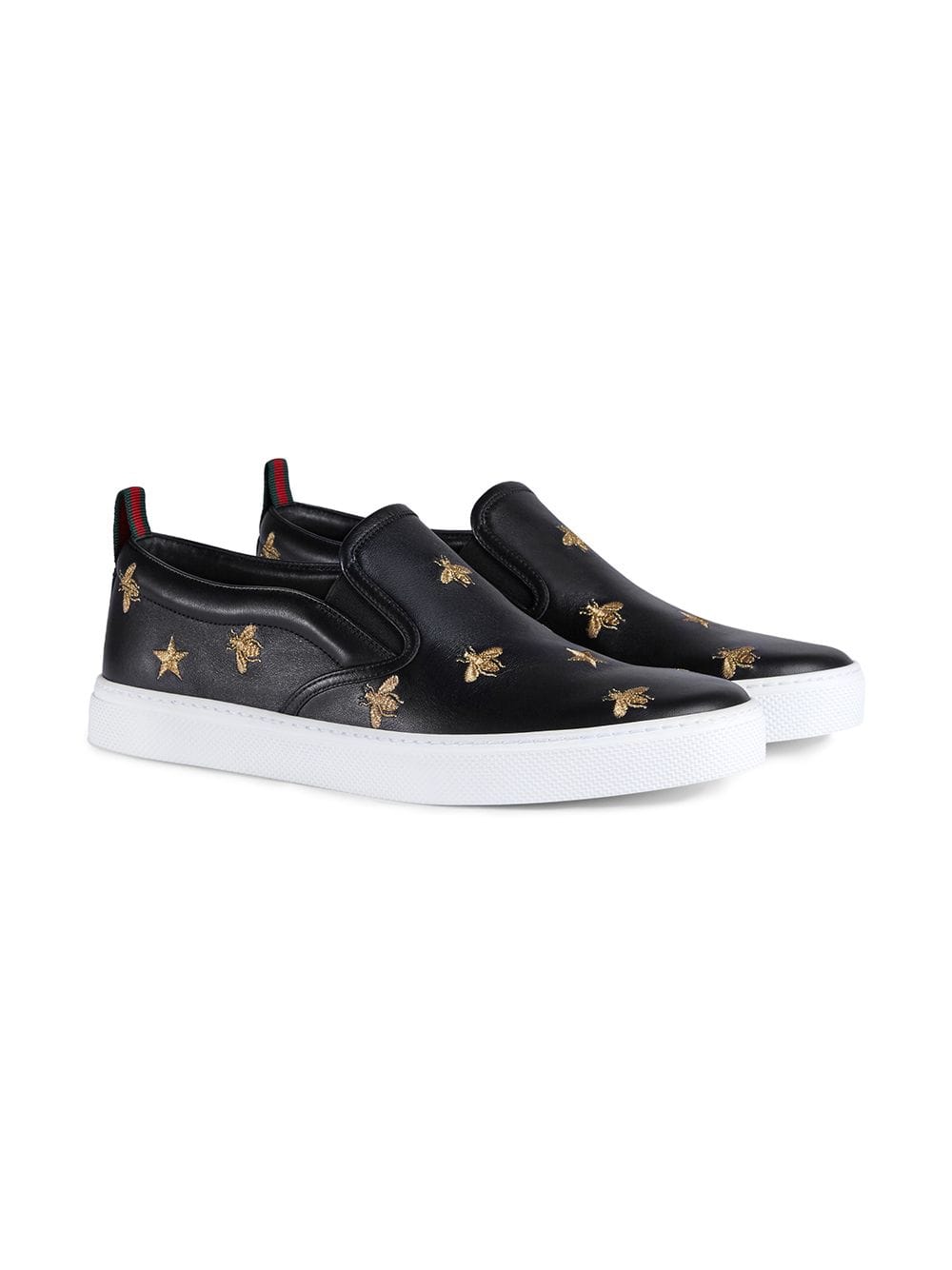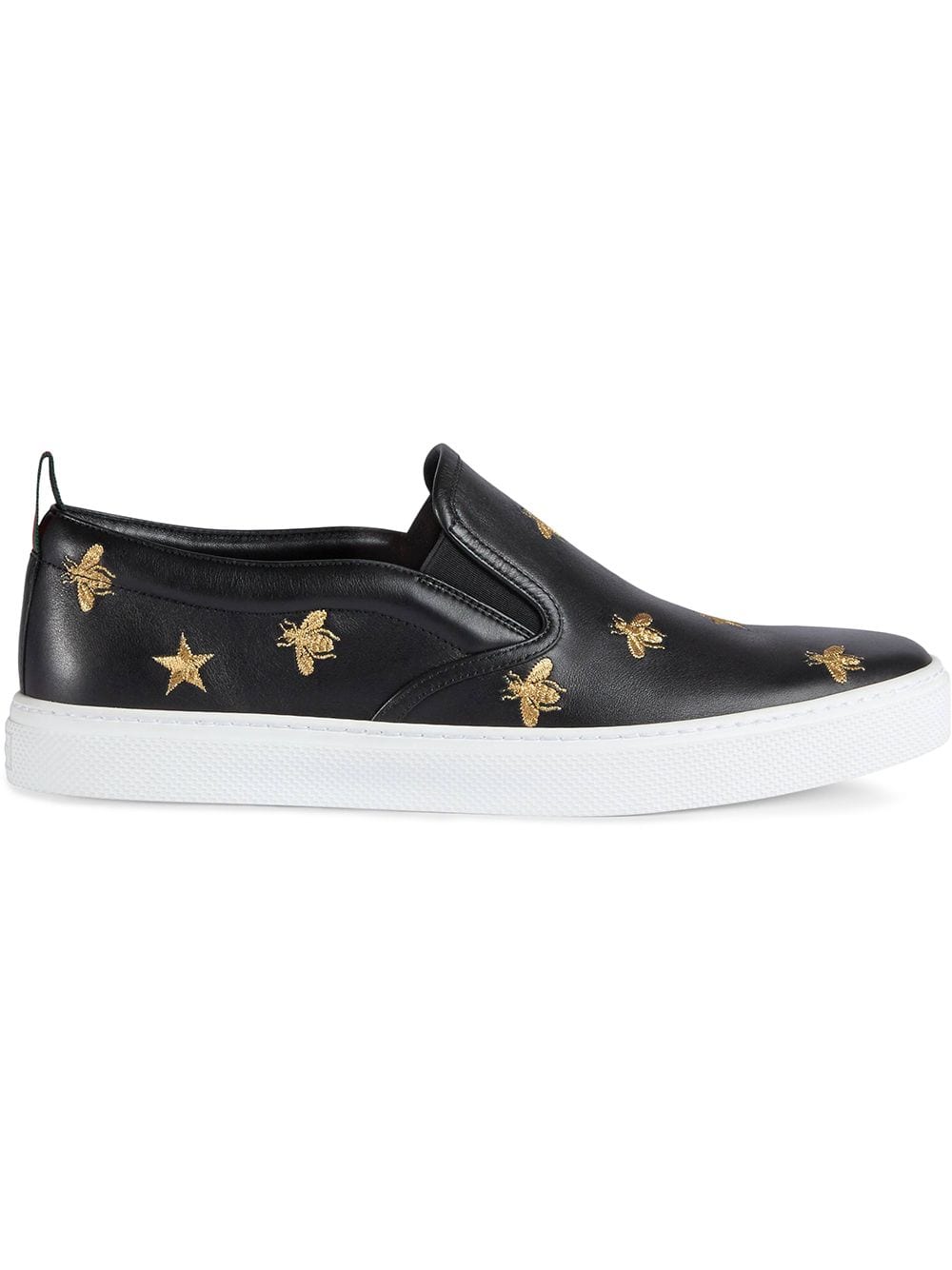 A slip-on sneaker embroidered with gold thread-embroidered bees and stars, two of Alessandro Michele’s signature details. Men’s. Black leather with gold thread-embroidered bees and stars. Green and red Web grosgrain detail. Rubber sole. Elastic inserts. .2″ height. Made in Italy.