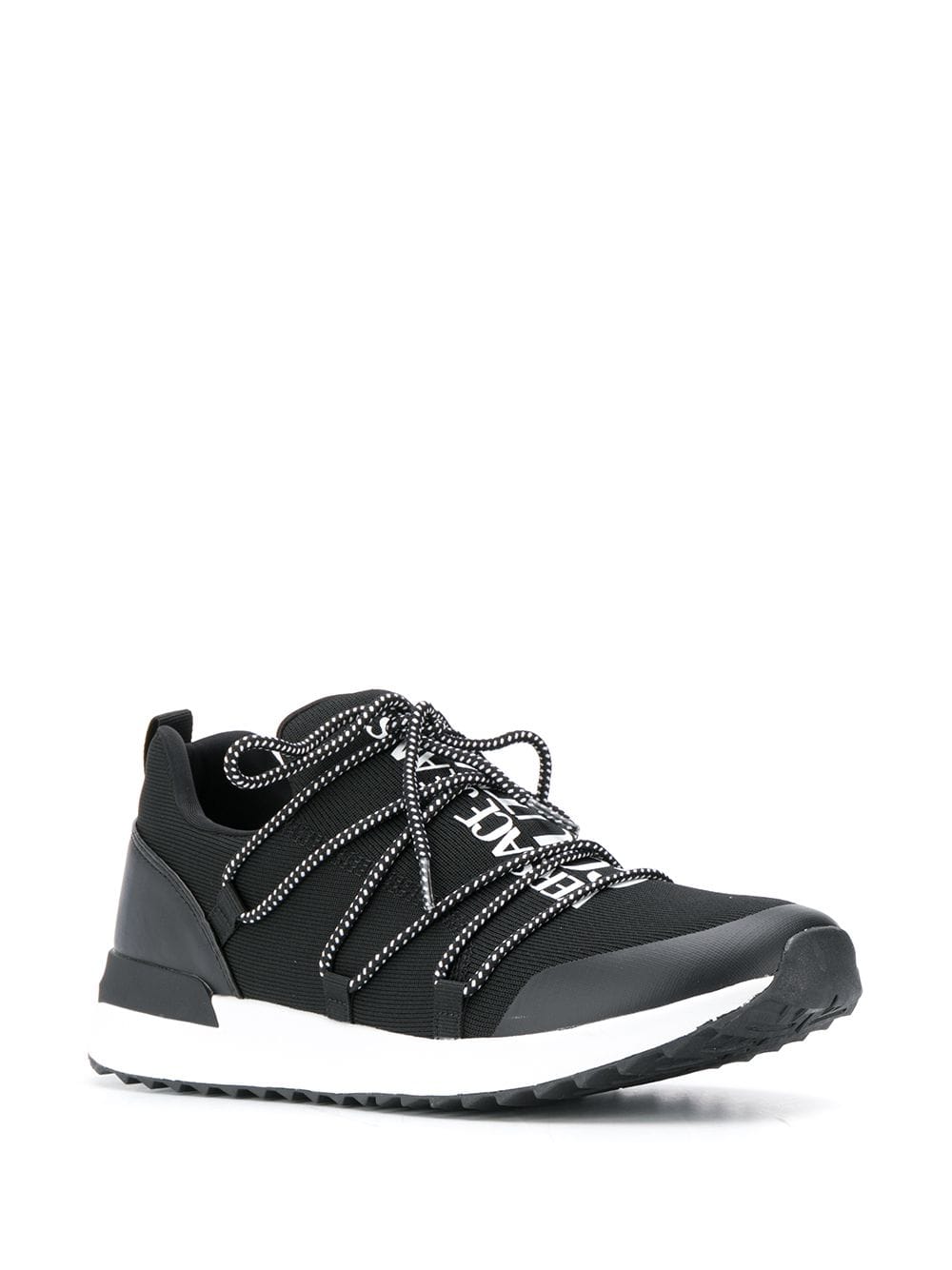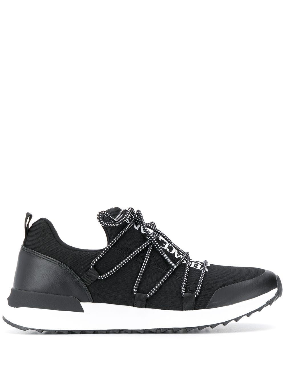 Versace goes beyond utilising the actual brand name to represent their rich Italian heritage and contemporary design ethos through instantly-recognisable house codes, as seen in these black logo lace-up sneakers. Featuring a round toe, a pull tab at the rear, mesh panels, a ridged rubber sole, a white lettering logo print and leather accents.