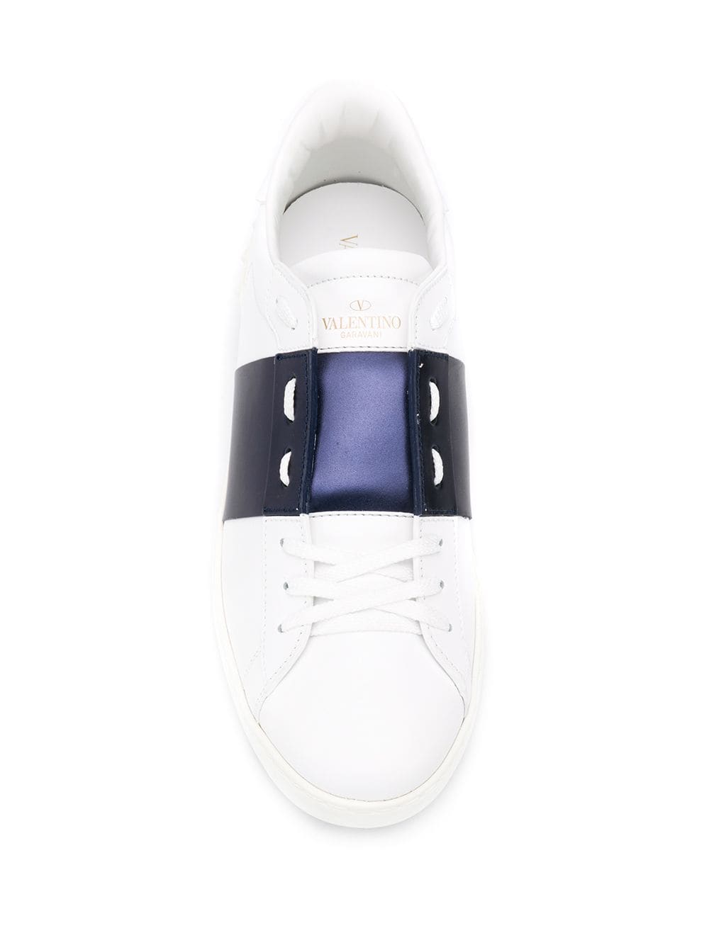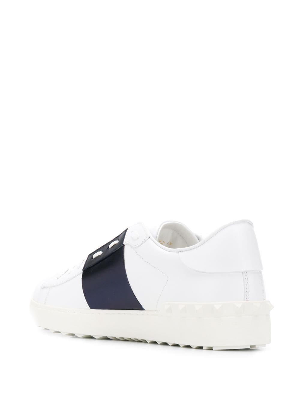 Add a sophisticated edge to off-duty looks with these white and dark blue leather Valentino Garavani low-top colour-block Rockstud sneakers. Featuring a lace-up front fastening, a round toe, a brand embossed tongue, a branded insole, stitching details, a white textured flat rubber sole, a dark blue horizontal stripe at the tongue and white signature Rockstud details.