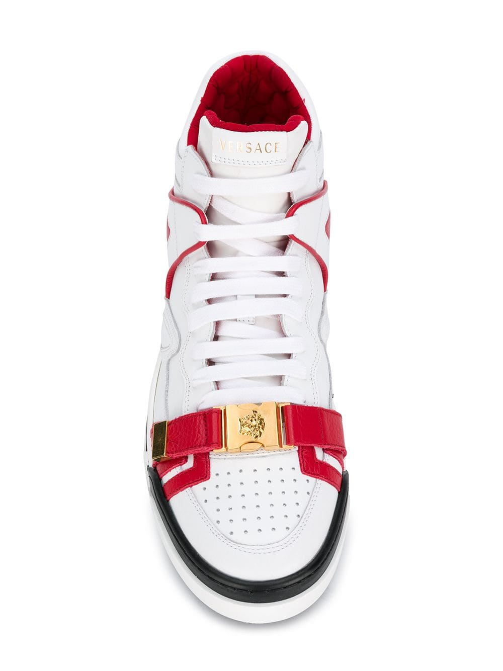 Donatella Versace continues to celebrate her late brother Gianni through the brand?s AW18 collection, drawing inspiration from archival prints and original runway designs. Expect a combination of iconic house motifs and retro elements with more a modern interpretation. Crafted in Italy, these white and red calf leather and leather Medusa mid-top sneakers from Versace feature a round toe, a Medusa detail, a lace-up front fastening, an ankle length, a brand embossed tongue and a flat rubber sole.
