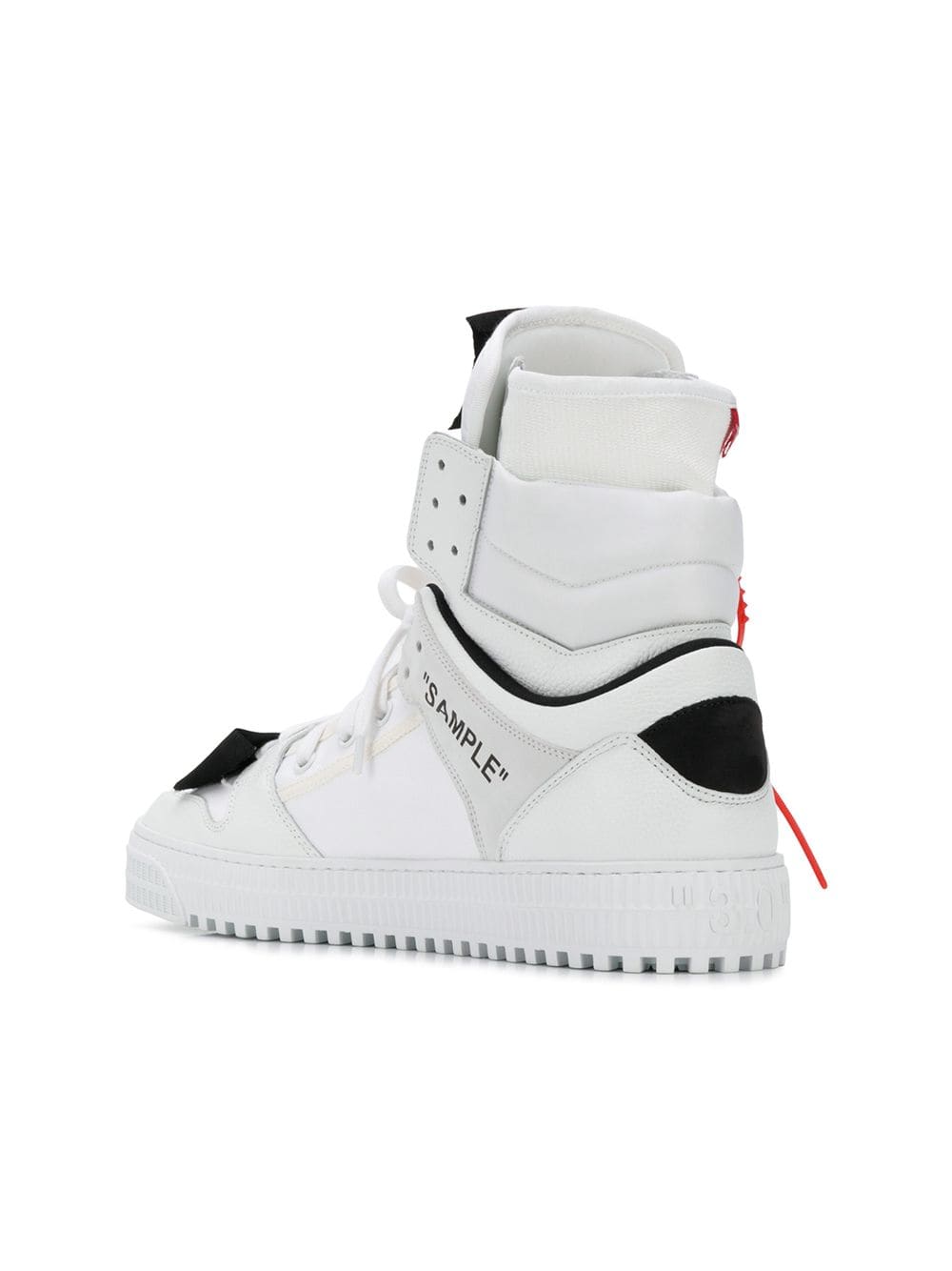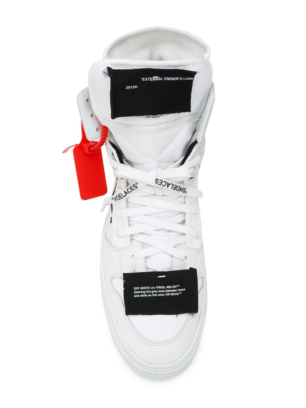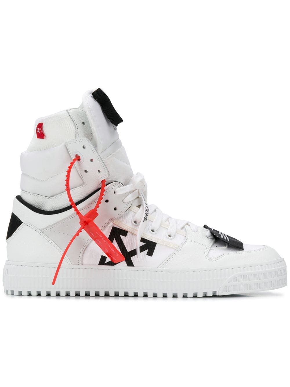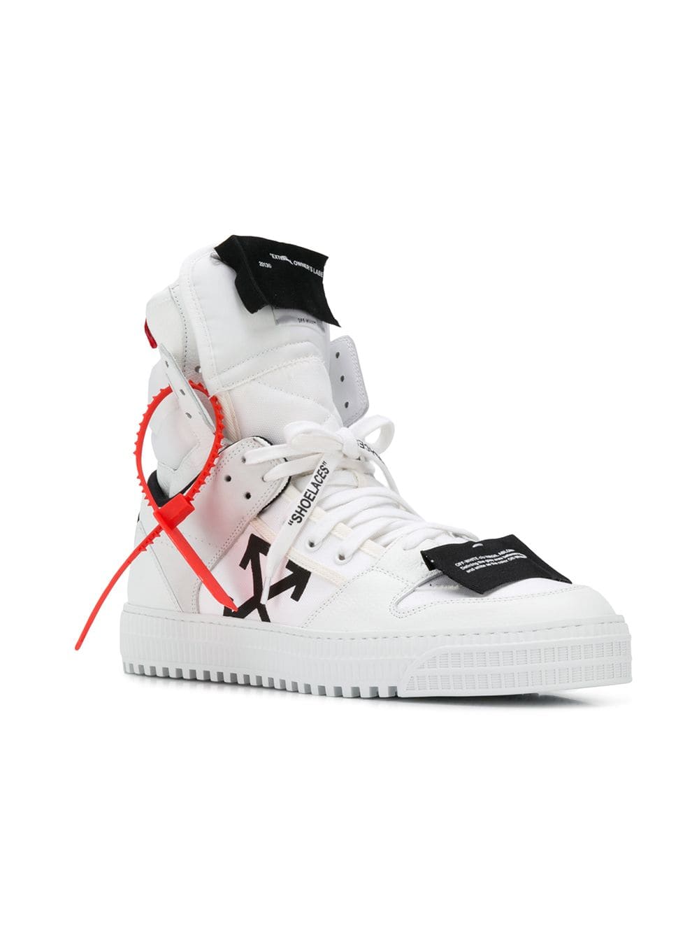 Founded in 2013 by DJ and fashion designer Virgil Abloh, the Milan based fashion label Off-White was conceived to link the gap between streetwear and high fashion. These white leather and cotton Off court sneakers feature a round toe, a lace-up front fastening, a front logo patch, a logo patch at the tongue, an ankle length, a side embossed logo stamp and a white rubber sole.