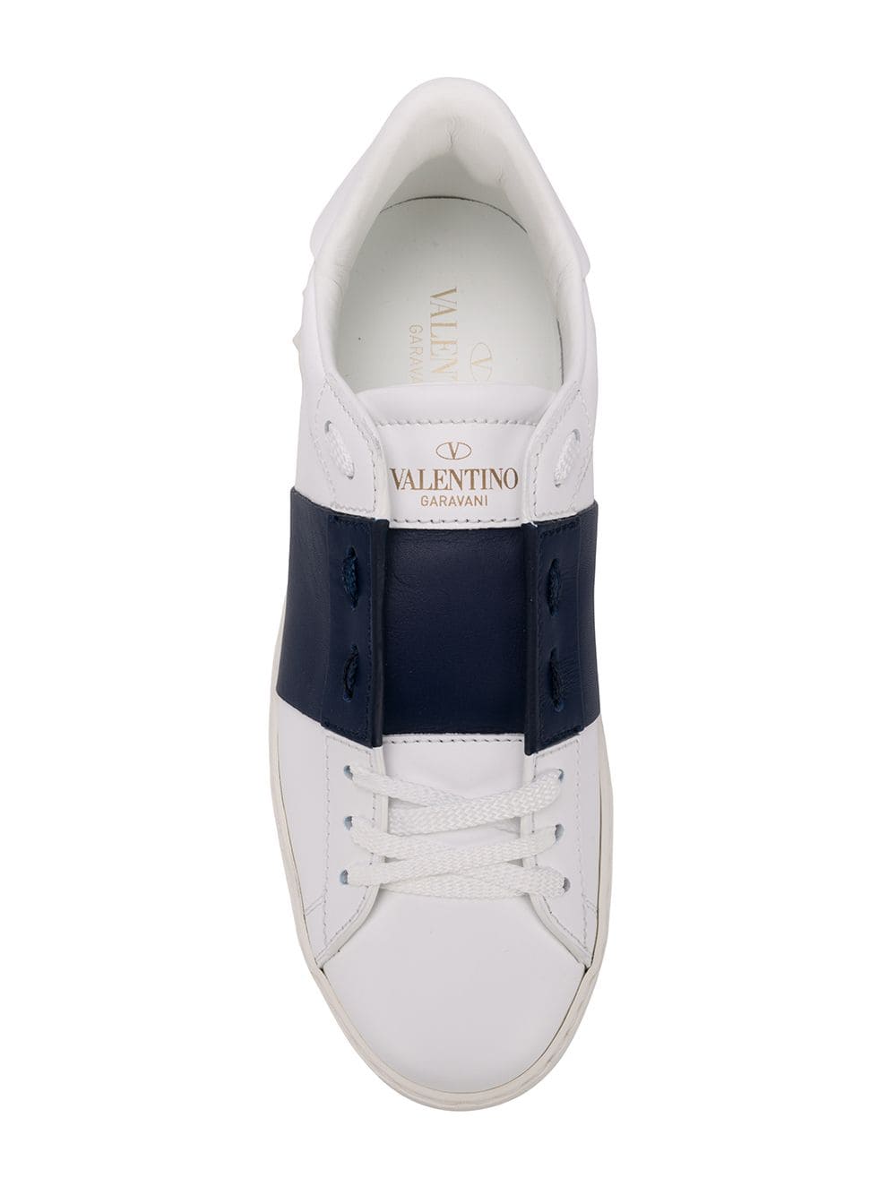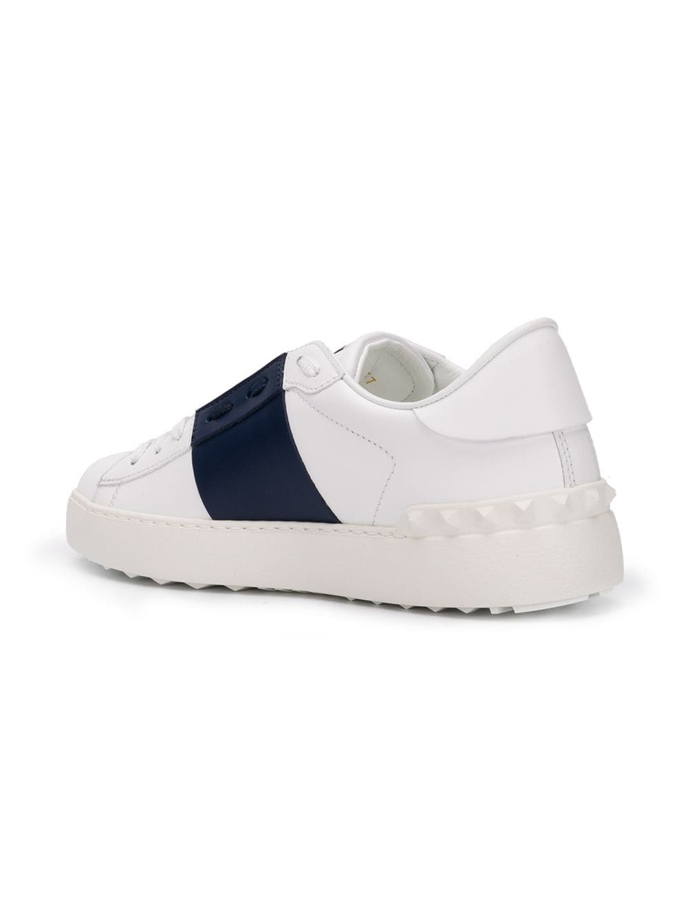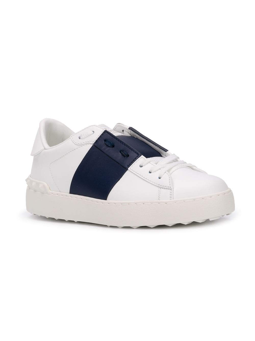 Valentino updates their signature Open sneakers for 2018 with a contrasting blue stripe across the upper for a new subtle pop of colour. Crafted from luxury Italian leather and leather, these pristine white Open sneakers feature a round toe, a lace fastening, a branded insole, a ridged rubber sole and are decorated with the classic Rockstuds embellished in a tonal white to the heel counter for a contemporary take on a classic style.