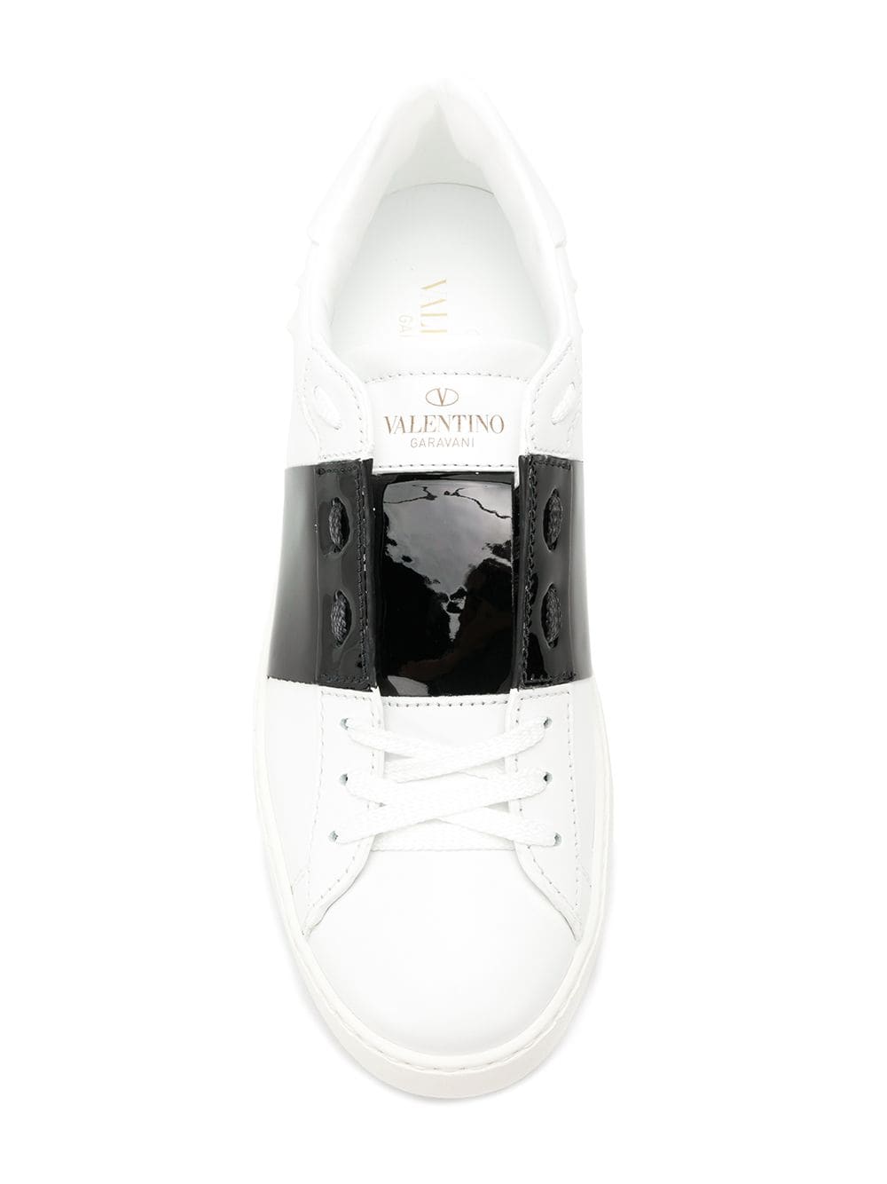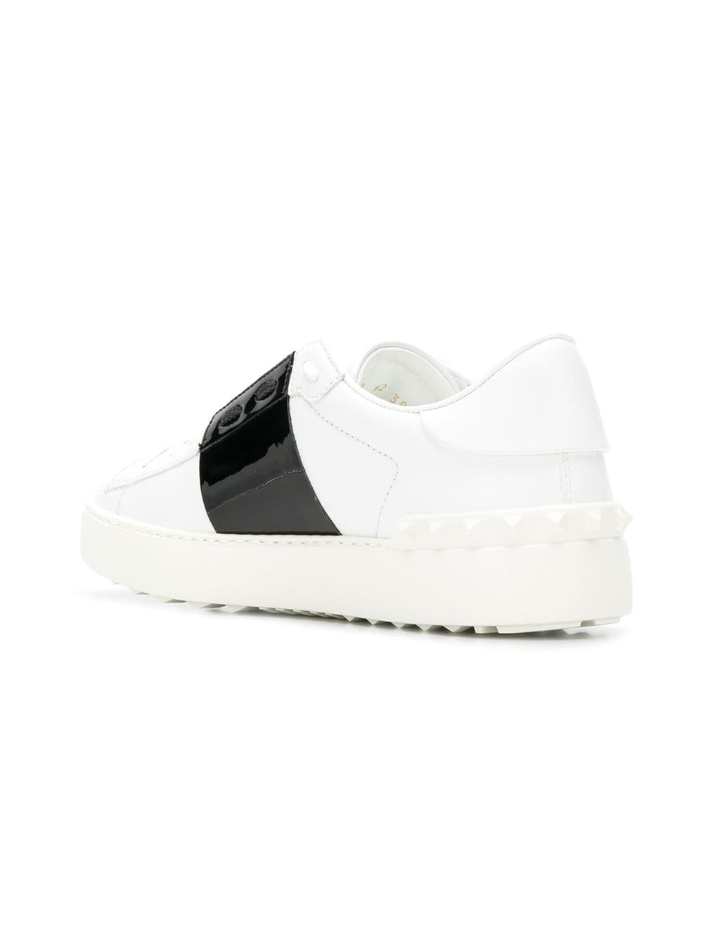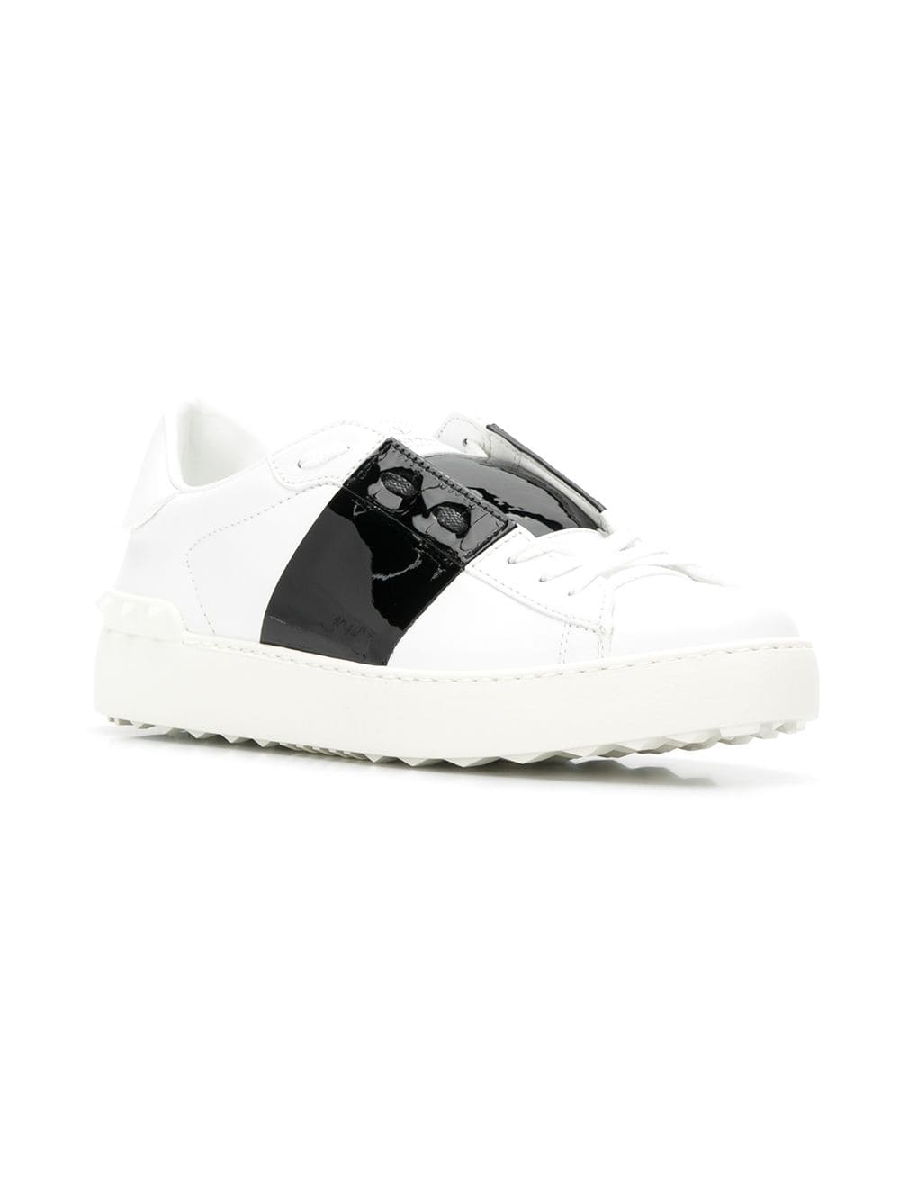 Luxury Italian fashion house Valentino is famed for its classic designs infused with its own signature modern edge and Rockstud details, as showcased through these white and black open sneakers. Crafted in Italy from patent leather and leather, they feature a round toe, a slip-on style, a lace-up front fastening, a brand embossed tongue, a branded insole, Rockstud embellishments and a rubber sole.