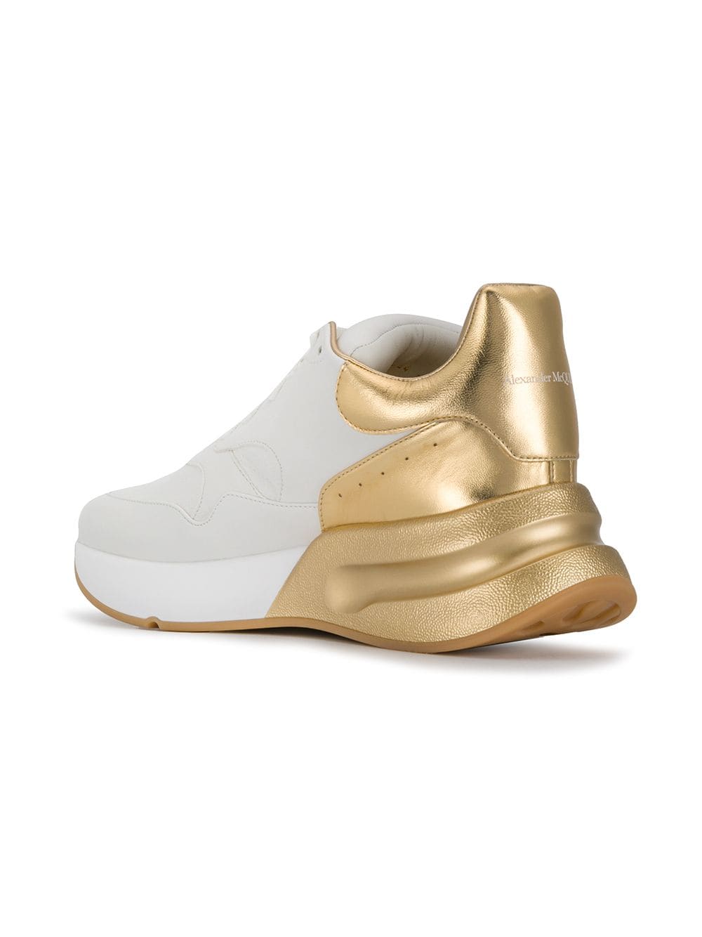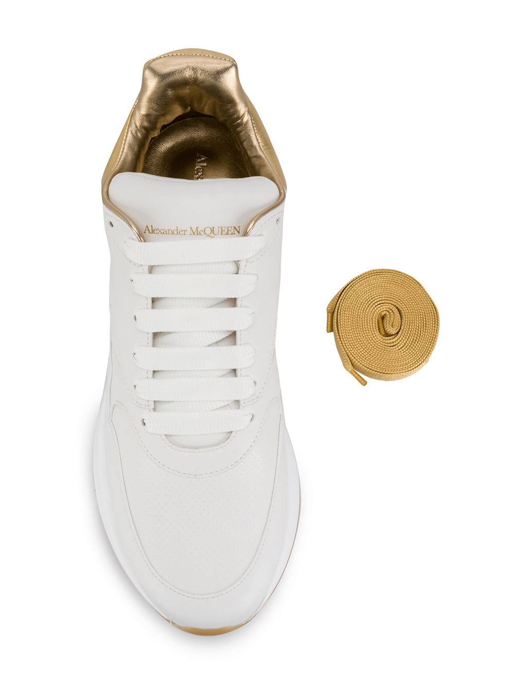 Combining smooth white leather and a contrasting gold-toned heel counter, these sneakers from Alexandre McQueen’s SS19 collection are far from ordinary. Expertly crafted in Italy, this pair features a round toe, a lace-up front fastening, a printed logo at the tongue, a printed logo to the rear and a ridged rubber sole.