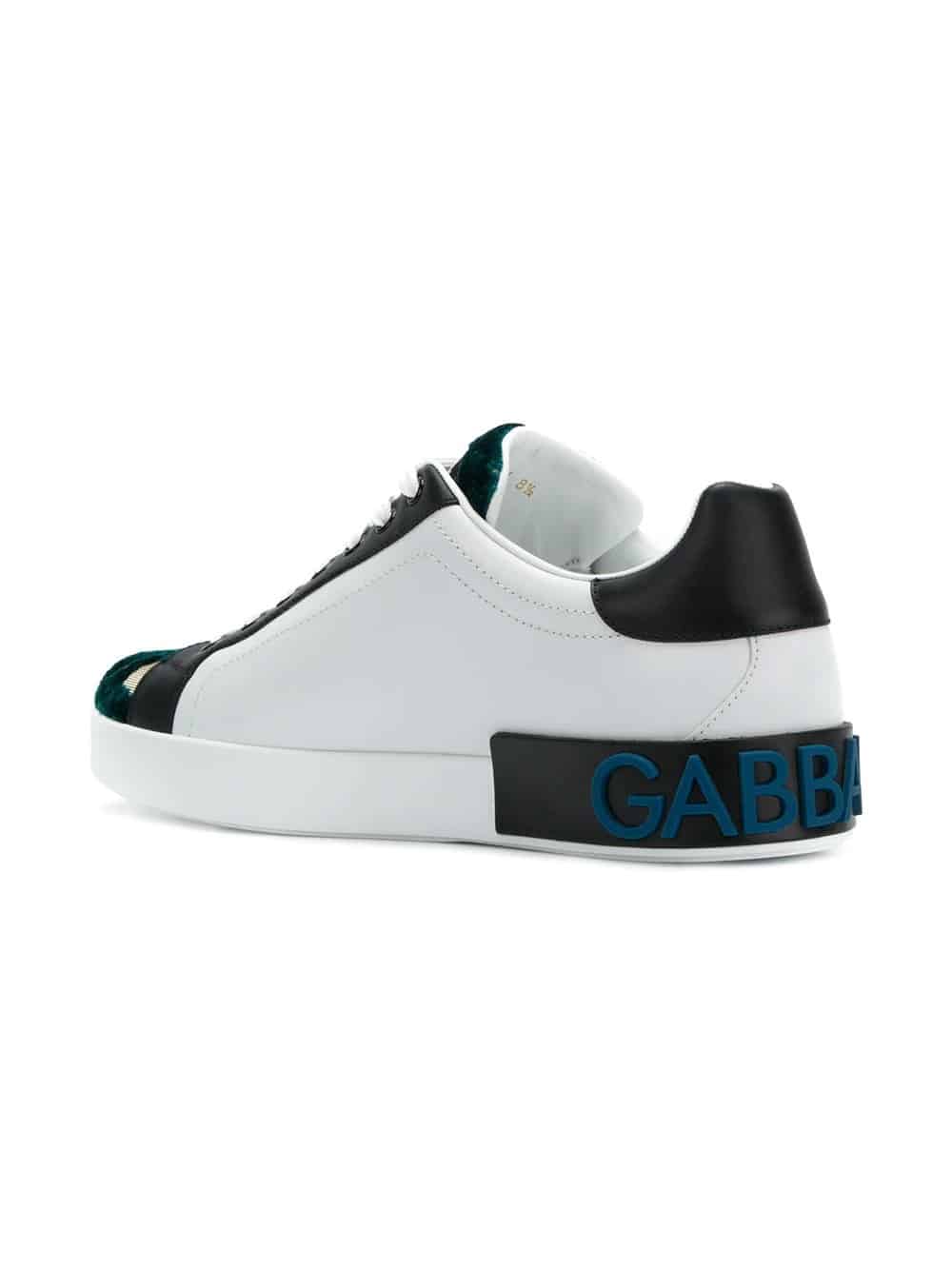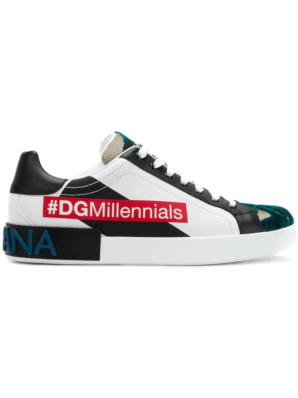 Dolce & Gabbana update their signature Portofino sneakers with a unique branded and colour block design for Spring Summer 2018. Crafted from luxury Italian leather, these sneakers feature a round toe, a lace fastening, a branded insole, a panelled forest green and mesh tongue with a logo patch, a contrasting black heel counter, a branded heel counter, a #DGMillennials red print to the side and a flat rubber sole.