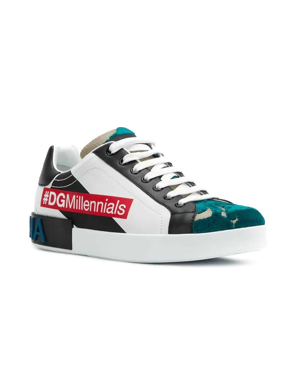 Dolce & Gabbana update their signature Portofino sneakers with a unique branded and colour block design for Spring Summer 2018. Crafted from luxury Italian leather, these sneakers feature a round toe, a lace fastening, a branded insole, a panelled forest green and mesh tongue with a logo patch, a contrasting black heel counter, a branded heel counter, a #DGMillennials red print to the side and a flat rubber sole.