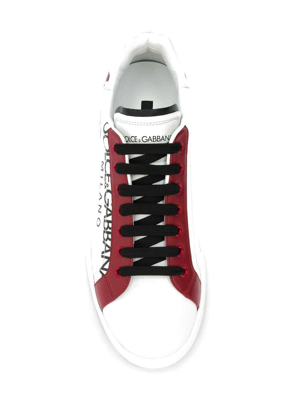 ‘Logomania’ – the trend that was born in the 1990s is now back in full force, with designers boldly showcasing their iconic branding across clothing and accessories. These white and red leather Portofino sneakers from Dolce & Gabbana are the epitome of the branding craze and feature a round toe, a lace-up front fastening, a logo patch at the tongue, a padded ankle, a leather lining, a branded insole, a contrasting crown print at the back and D&G printed logos to the side.