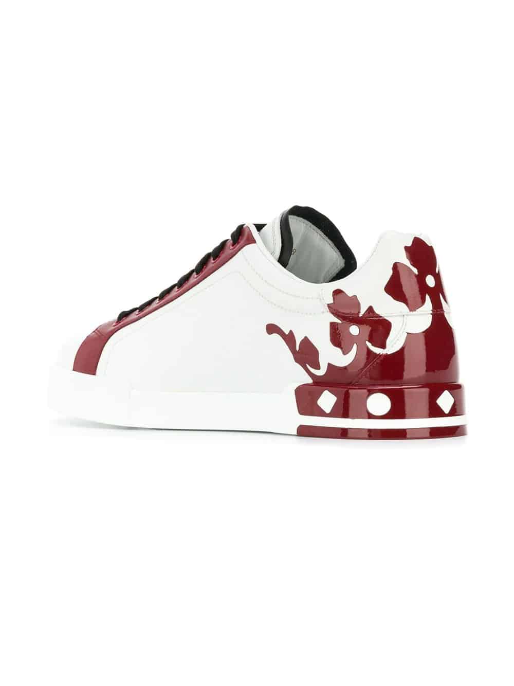 ‘Logomania’ – the trend that was born in the 1990s is now back in full force, with designers boldly showcasing their iconic branding across clothing and accessories. These white and red leather Portofino sneakers from Dolce & Gabbana are the epitome of the branding craze and feature a round toe, a lace-up front fastening, a logo patch at the tongue, a padded ankle, a leather lining, a branded insole, a contrasting crown print at the back and D&G printed logos to the side.