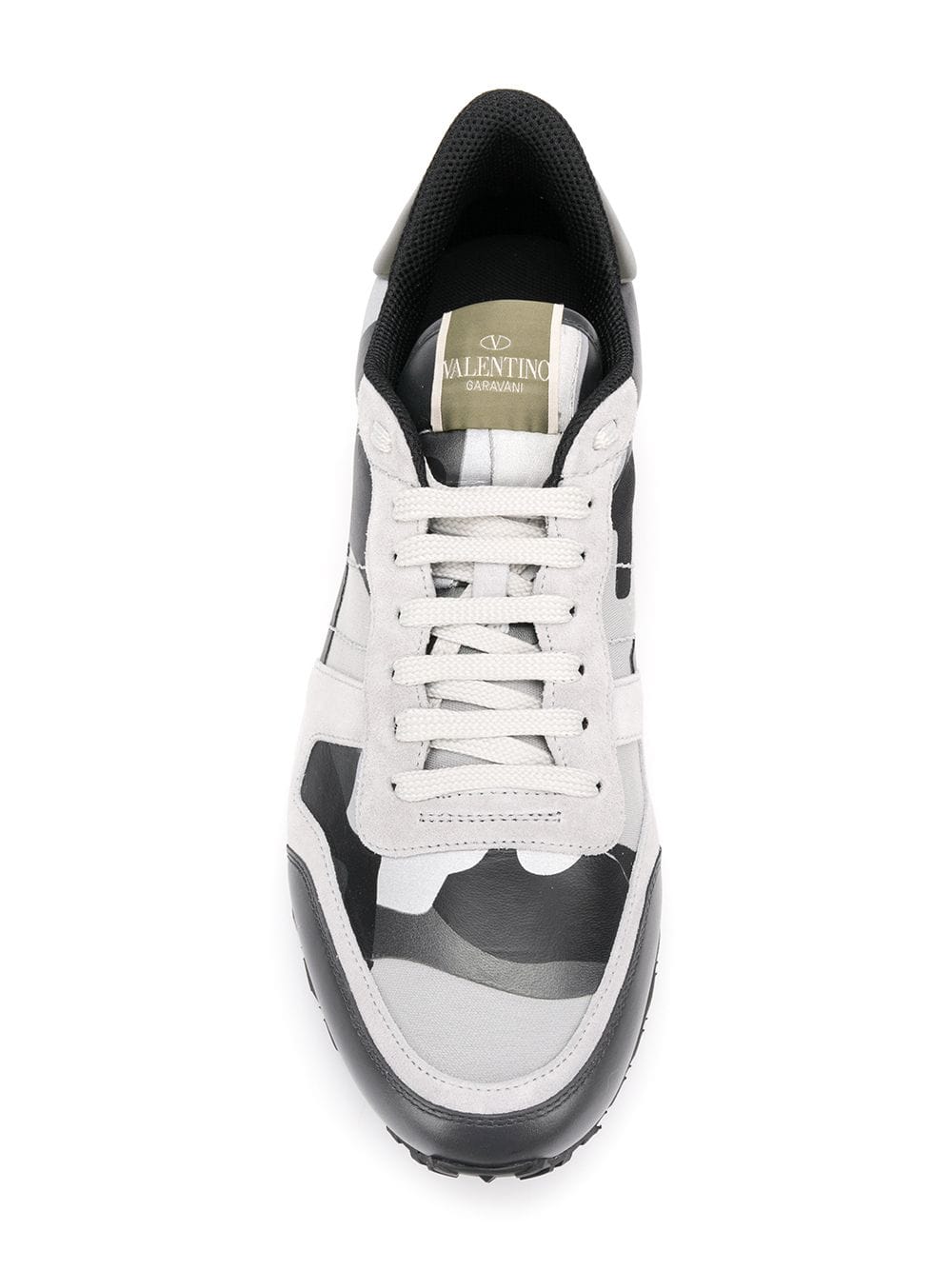 Luxury Italian fashion house Valentino is famed for its classic designs infused with its own signature modern edge and Rockstud details, as showcased through these grey, black and silver leather Valentino Garavani Rockrunner sneakers. Crafted in Italy, they feature a round toe, a lace-up front fastening, a logo patch at the tongue, a camouflage print, a branded insole, a padded ankle, Rockstud embellishments and a rubber sole.