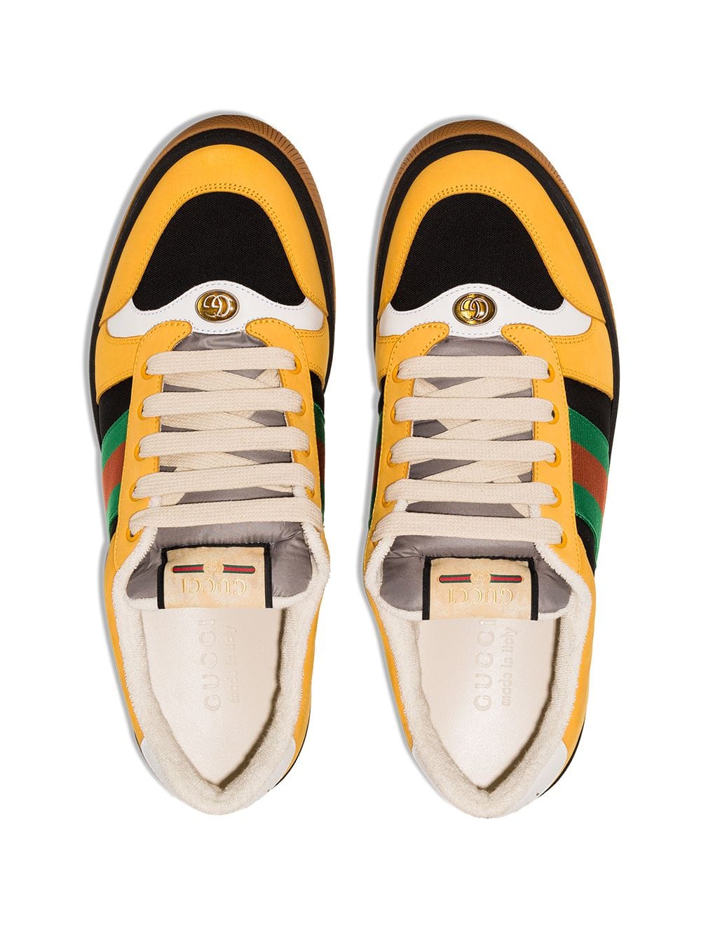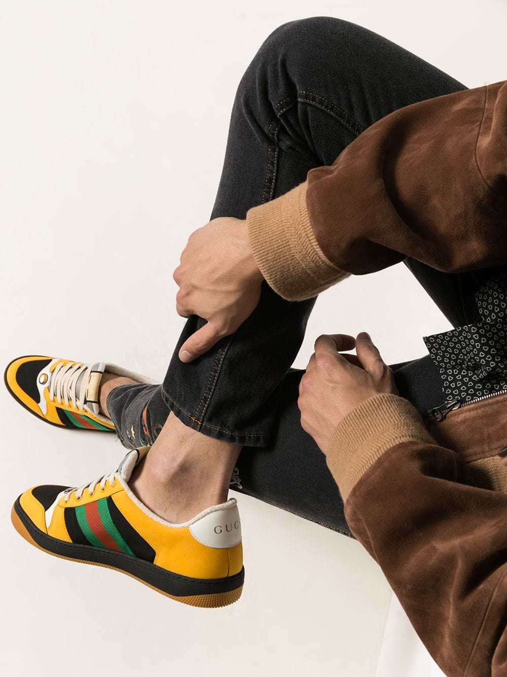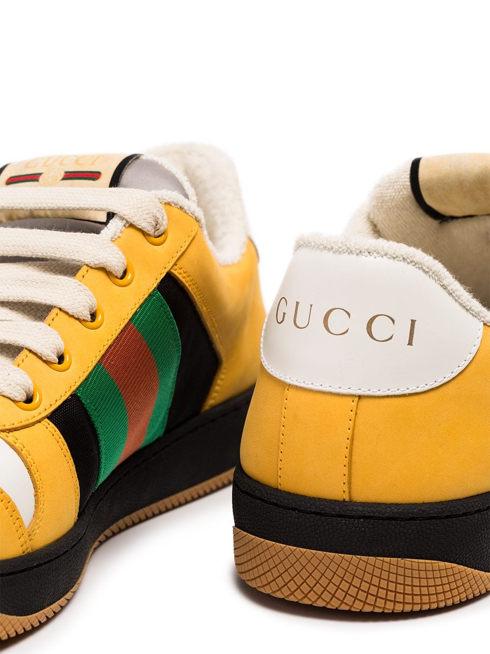 ‘Luxury means you show the way you dress with eccentricity. It’s almost like a new kind of jet set – instead of roaming around the world, you’re roaming with your clothes’ said Gucci’s creative director. These black and yellow leather Screener low-top sneakers from Gucci feature a round toe, a flat rubber sole, a lace-up front fastening, a striped pattern, a logo patch at the tongue and a contrasting heel counter.