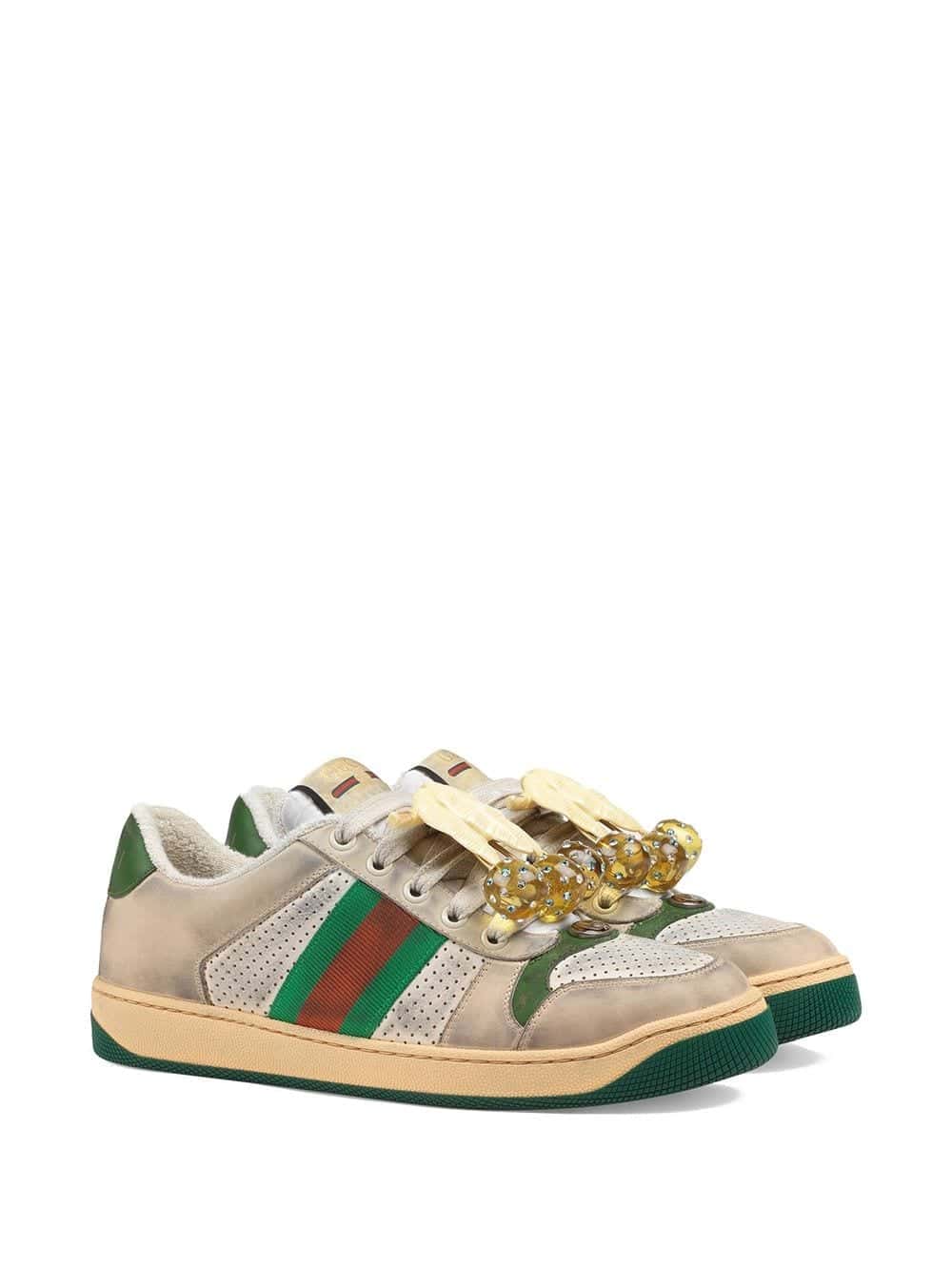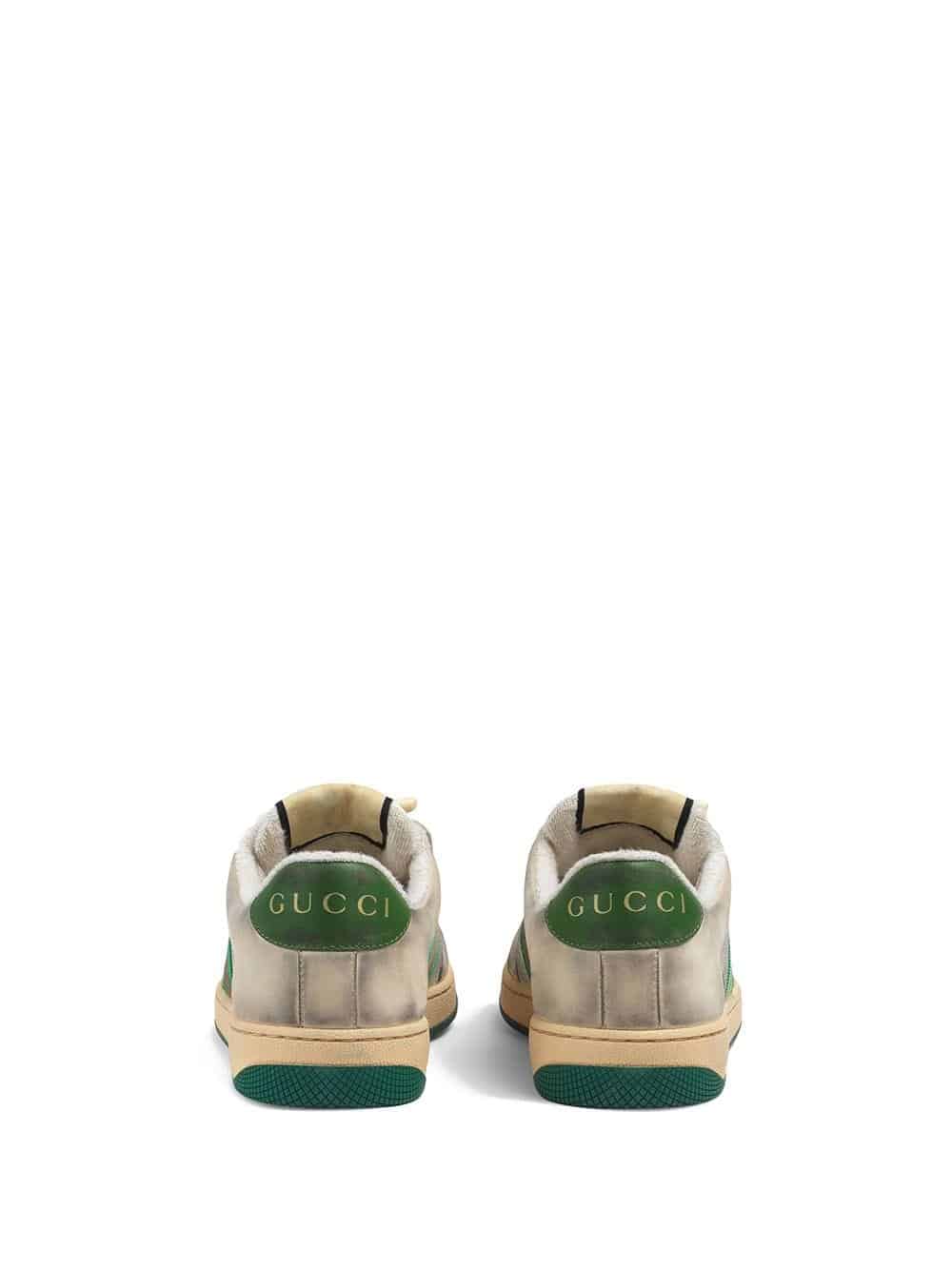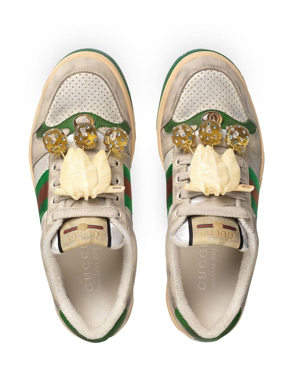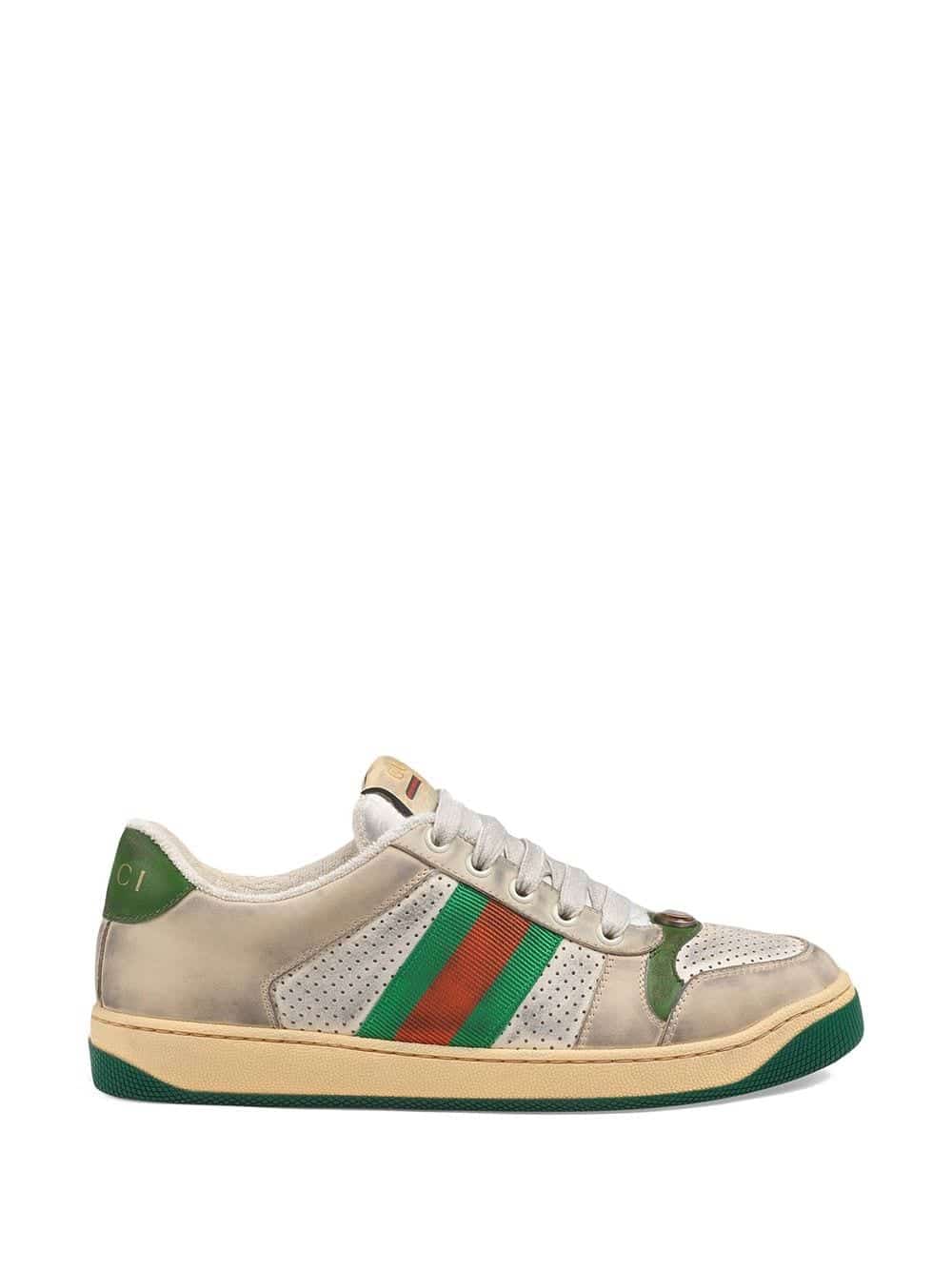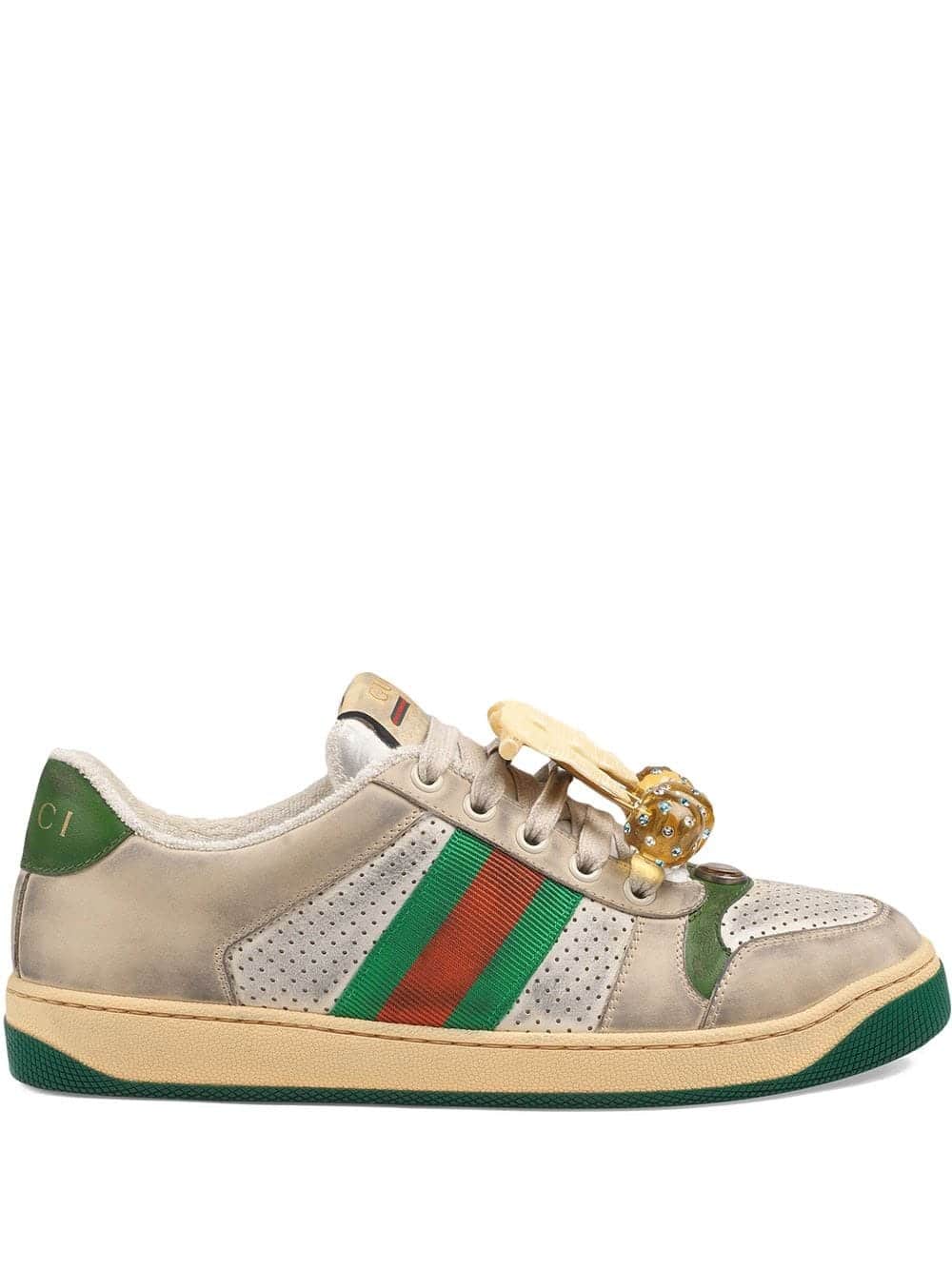 The Spring Summer 2019 collection continues to reference old school shapes and materials inspired by vintage sportswear. Influenced by classic trainers from the ’70s and named for the defensive sports move, these sneakers feature the Web stripe on the side and vintage Gucci logo, treated for an allover distressed effect. It has an unexpected layer with the removable cherries with crystals that further pushes the notion of bringing contrasting elements together in new ways. White perforated and off-white leather; Treated for a vintage, distressed effect; Removable cherries with crystals; Green and orange Web with vintage effect; Green leather details; Oval enameled detail with metal Double G; Label with Gucci vintage logo; Bi-color rubber sole; 3.5cm height; Made in Italy