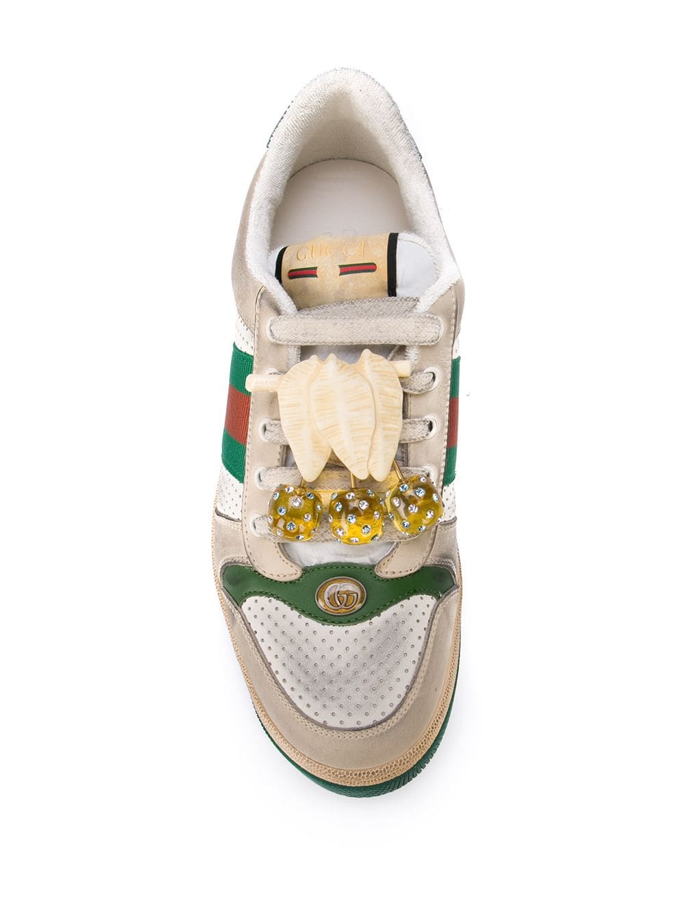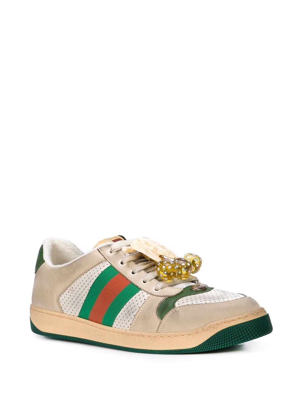 The Spring Summer 2019 collection continues to reference old school shapes and materials inspired by vintage sportswear. Influenced by classic trainers from the ’70s and named for the defensive sports move, these sneakers feature the Web stripe on the side and vintage Gucci logo, treated for an allover distressed effect. It has an unexpected layer with the removable gold-tone leaf and gemstone ball design that further pushes the notion of bringing contrasting elements together in new ways.