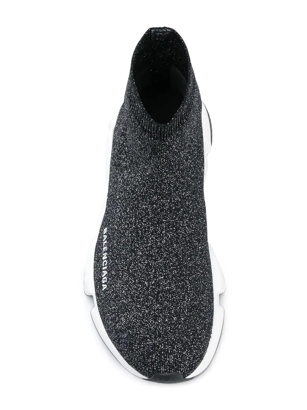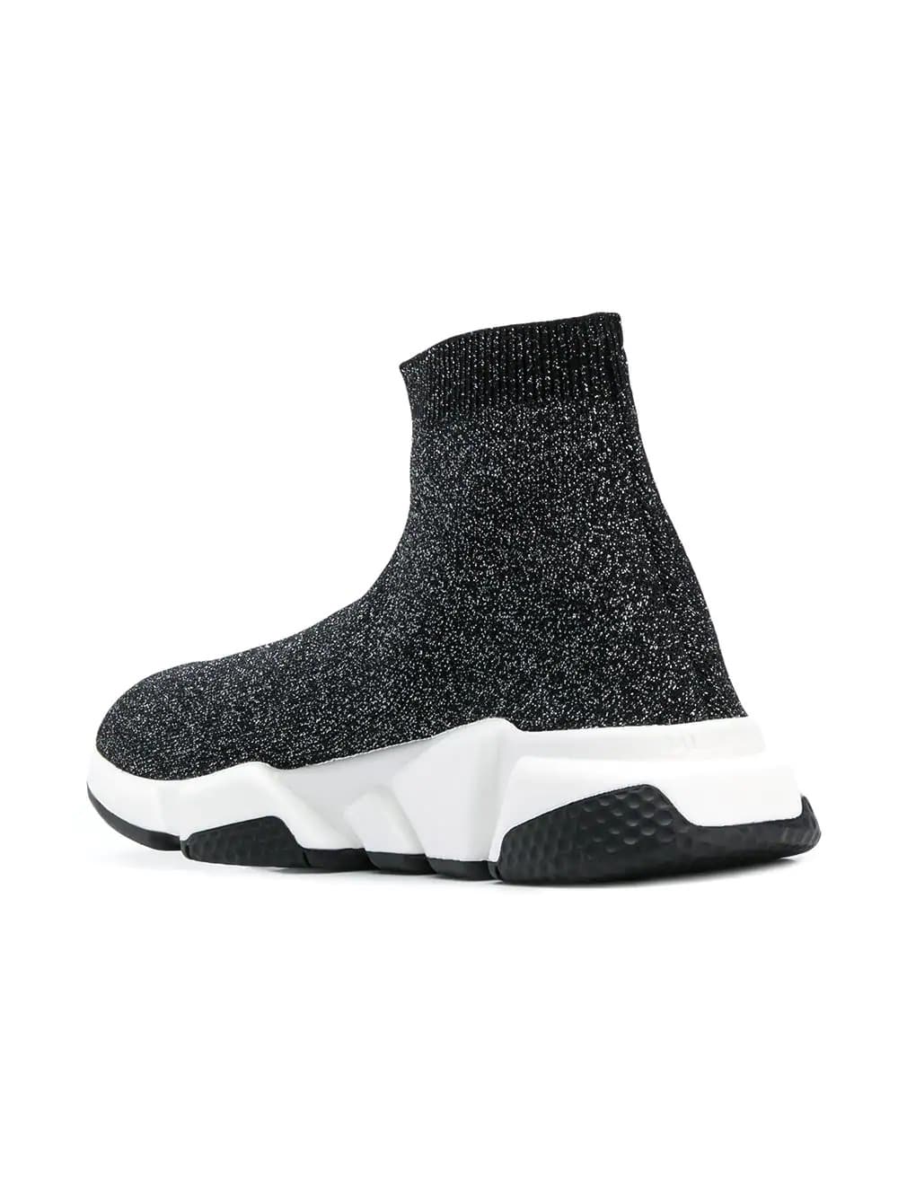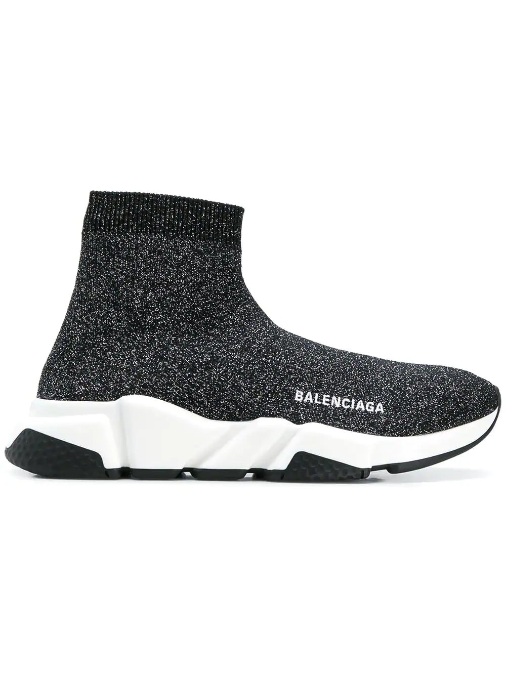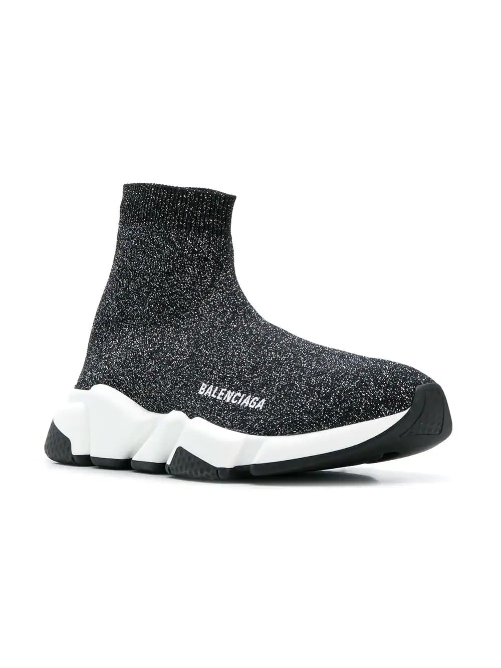 Demna Gvasalia captures the current streetwear mode for, ‘Generation-Z’ with hype driven pieces that garner critical acclaim at the Maison of Balenciaga. Crafted in Italy from a black lurex fabric, these Speed sneakers feature a sock-like upper with an almond toe, a logo to the outside, an ankle length and a ribbed ankle. They sit atop a chunky rubber sole with a white midsole.