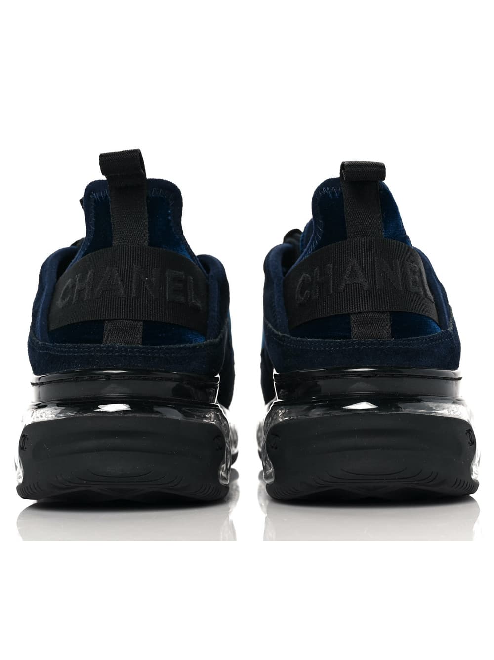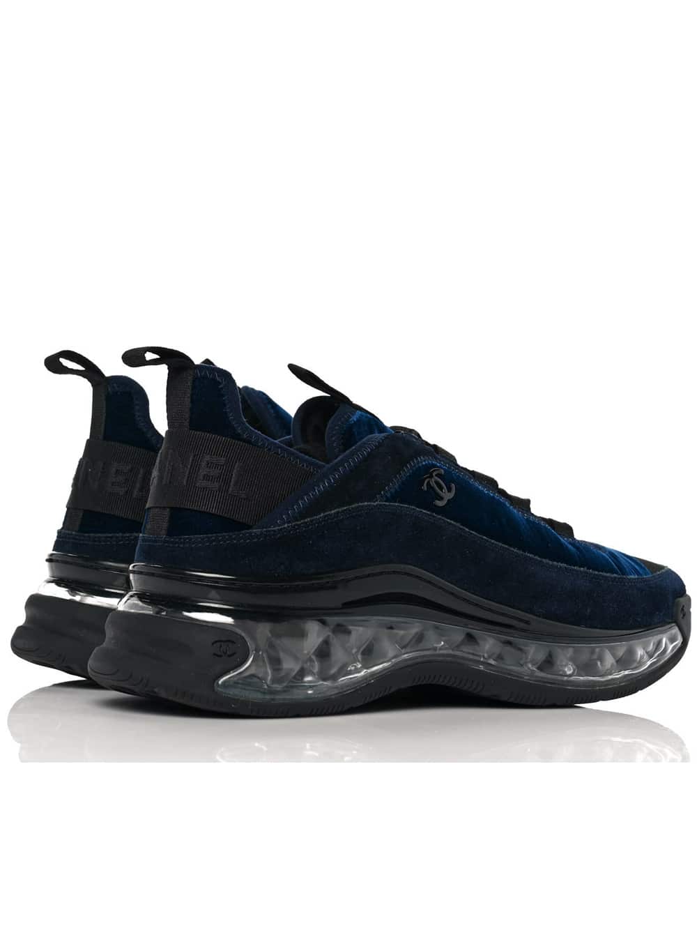 These are an authentic pair of CHANEL Suede Calfskin Velvet Grosgrain CC Sneakers size 39.5 in Navy Blue and Black. These stylish sneakers are crafted of blue velvet fabric, and suede leather with a black Chanel CC on each side.