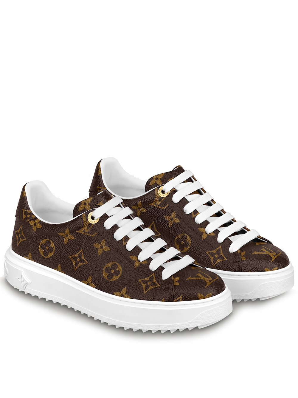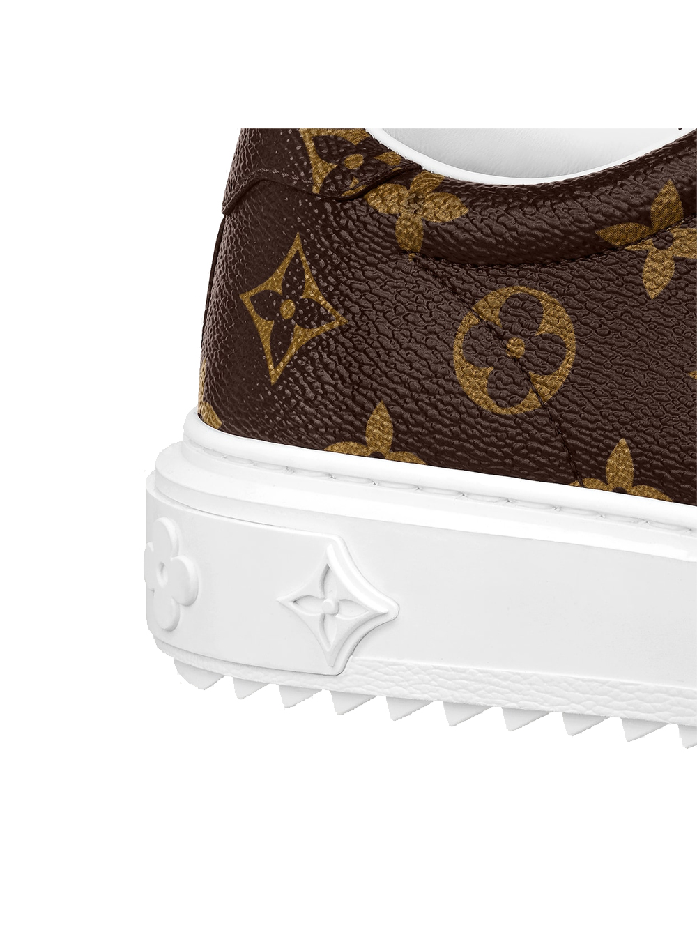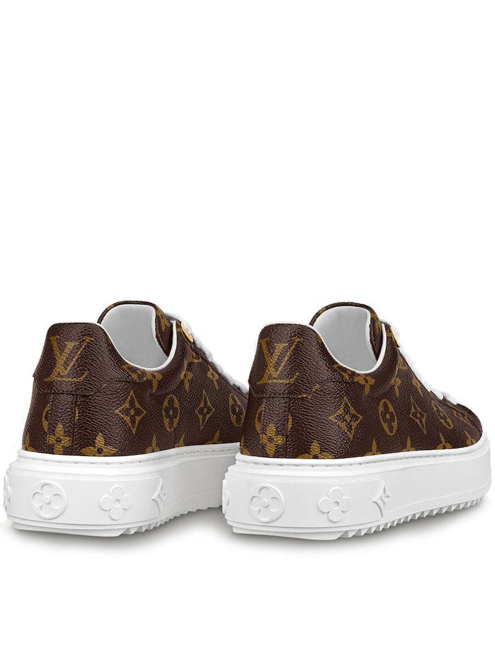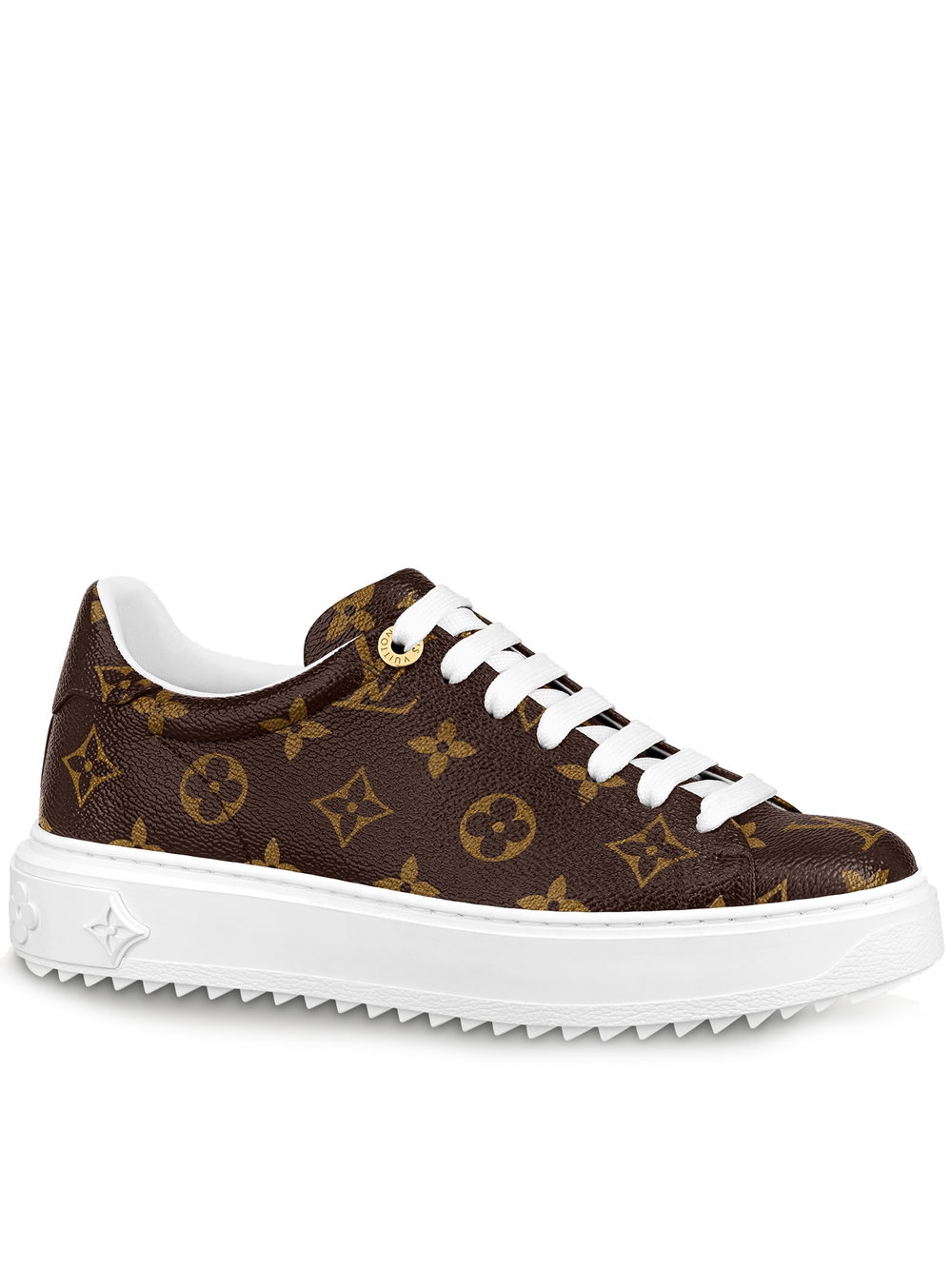 The Time Out sneaker is crafted from Louis Vuitton’s signature Monogram canvas. This model is characterized by its fashionable, elevated outsole in white rubber, which is debossed with a pattern of Monogram Flowers. Bright white laces complement this design, which is finished with two engraved, gold-tone eyelets.