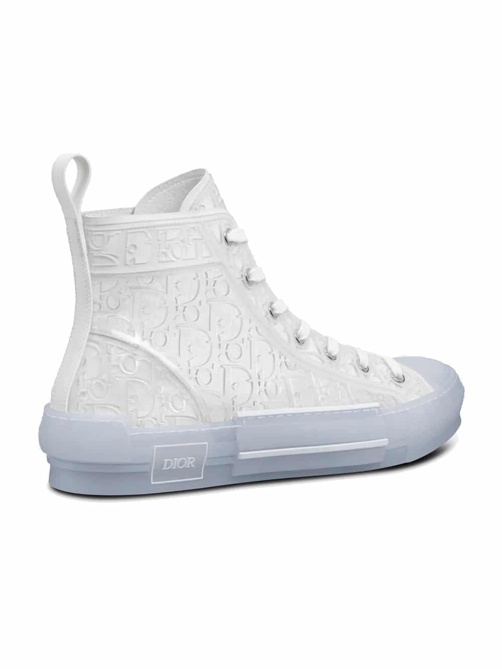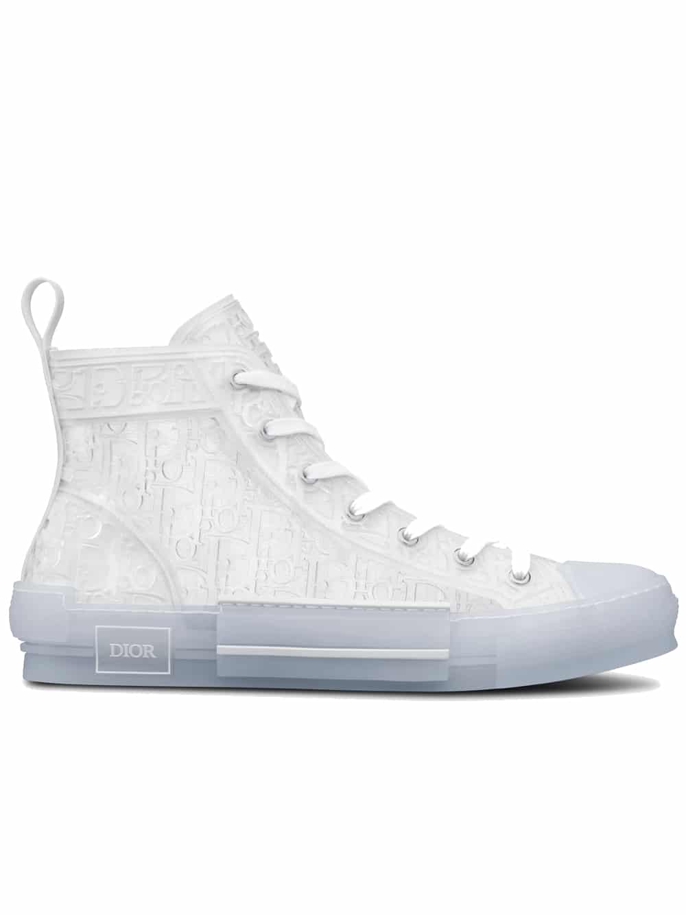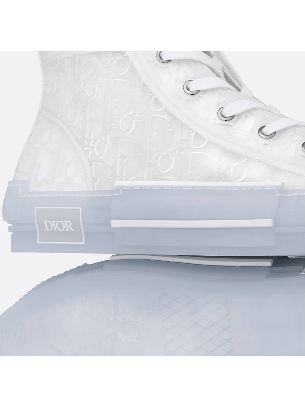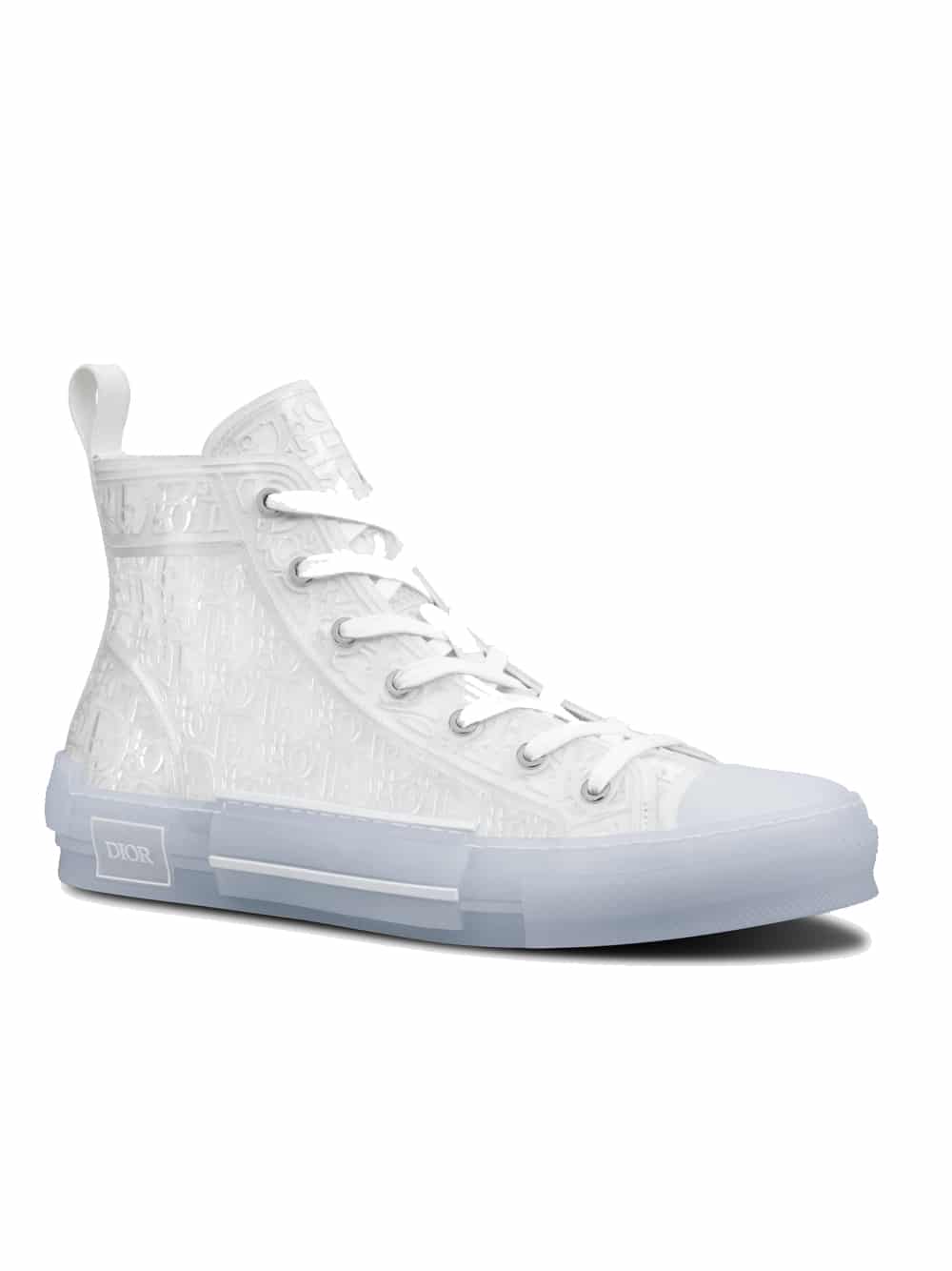 The B23 high-top sneaker offers a new variation in transparent canvas enhanced by the Dior Oblique motif created with injected white rubber for a raised effect. The style maintains timeless sneaker details such as eyelets and a lace-up front, a transparent rubber sole, a rounded and reinforced toe as well as a rear tab. Further enhanced by tonal details on the sides, including a ‘DIOR’ signature, the B23 sneaker pairs easily with any casual outfit.