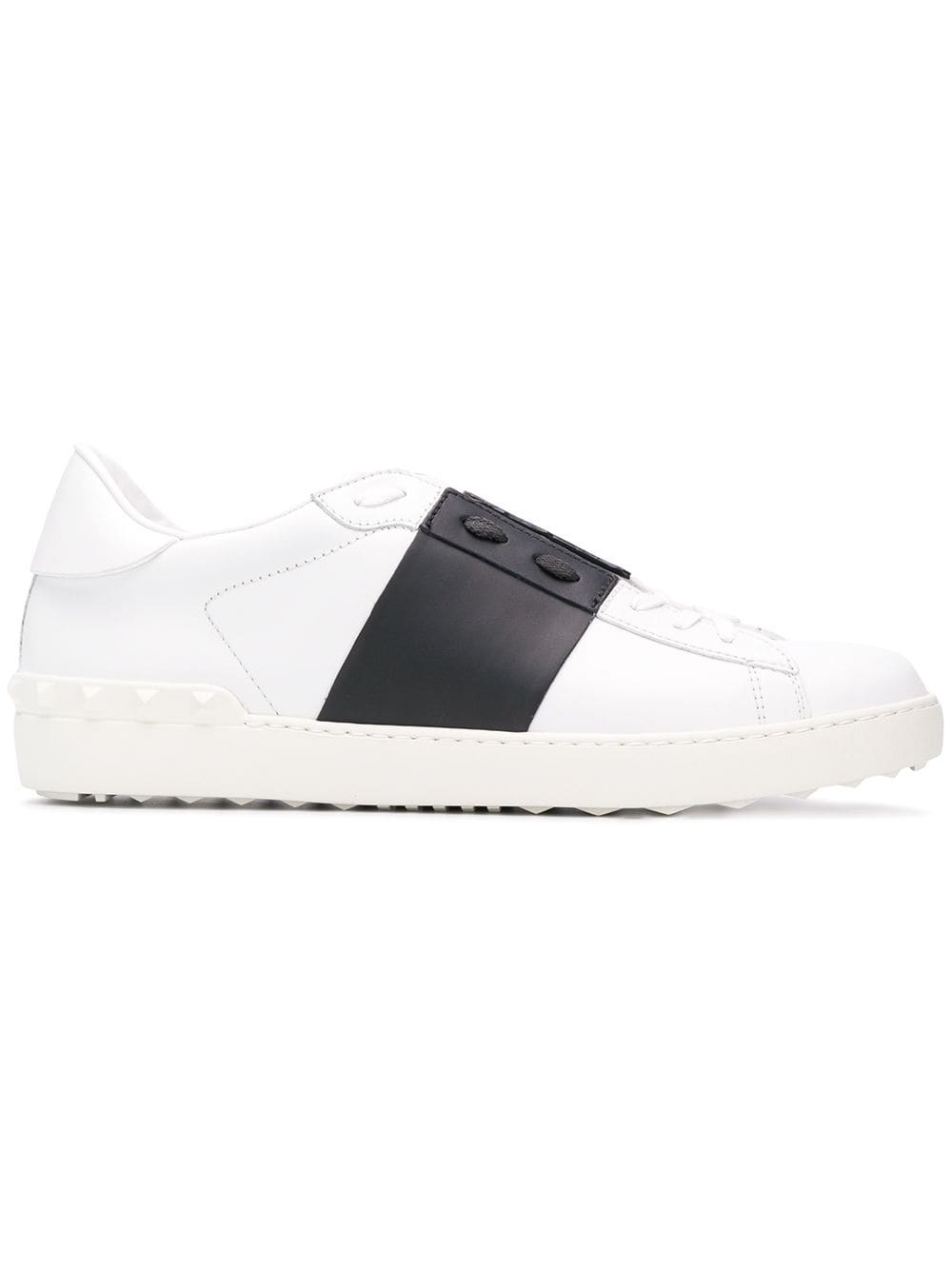 Valentino updates their signature Open sneakers for 2018 with a contrasting black panel across the upper for a new subtle pop of colour. Crafted from luxury Italian leather, these pristine white Valentino Garavani Open sneakers feature an almond toe, a lace fastening, a branded insole, a ridged rubber sole and classic Rockstuds embellishments in a tonal white hue to the heel counter for a contemporary take on a classic style.