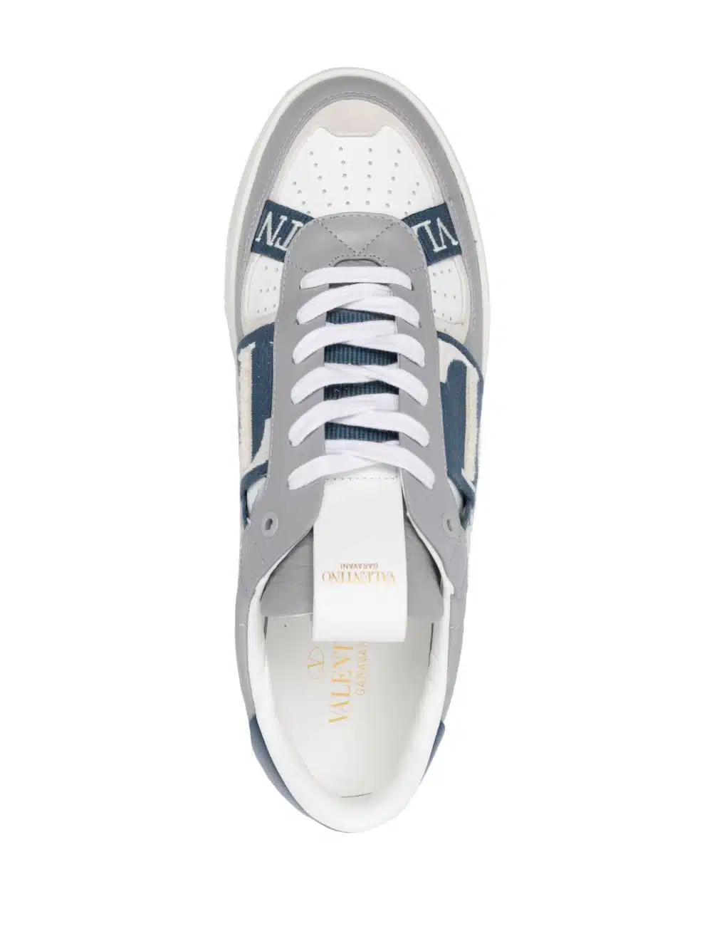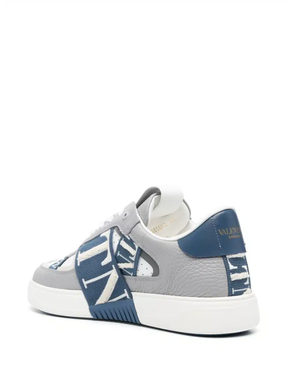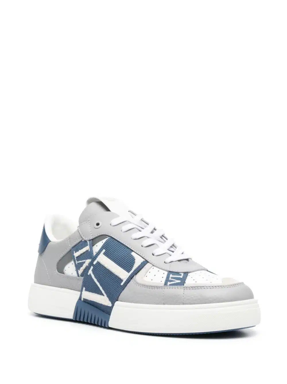 An ode to Valentino Garavani’s iconic moniker, these VL7N sneakers are accented with logo-embroidered grosgrain stripes along the front and sides. They’re crafted from panels of grey, blue and white leather with a perforated toe box and a flat rubber sole.