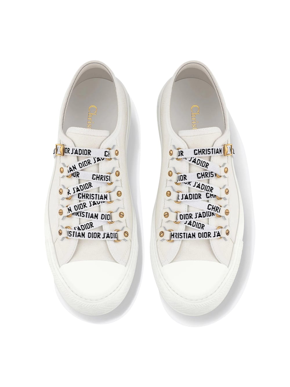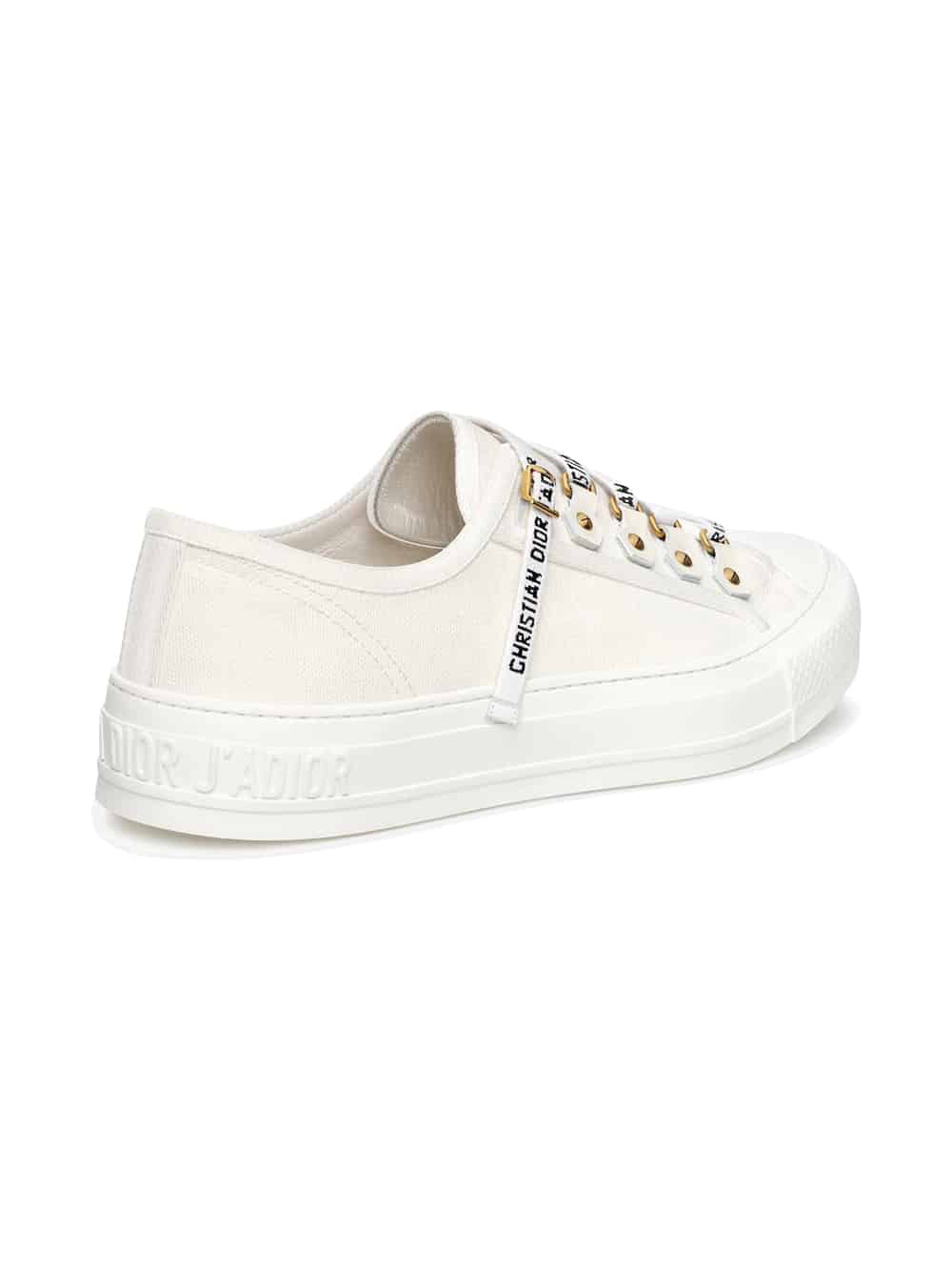 Low-top Sneaker in white canvas with “Christian Dior J’Adior” laces; leather inserts and metallic accessories with “Antique Gold” finish, rubber sole with logo
