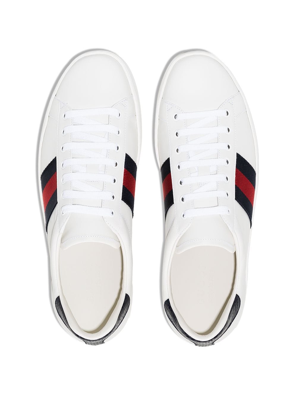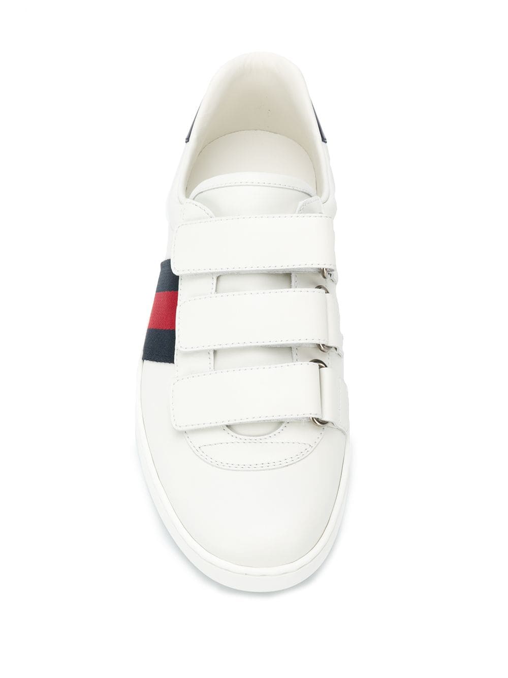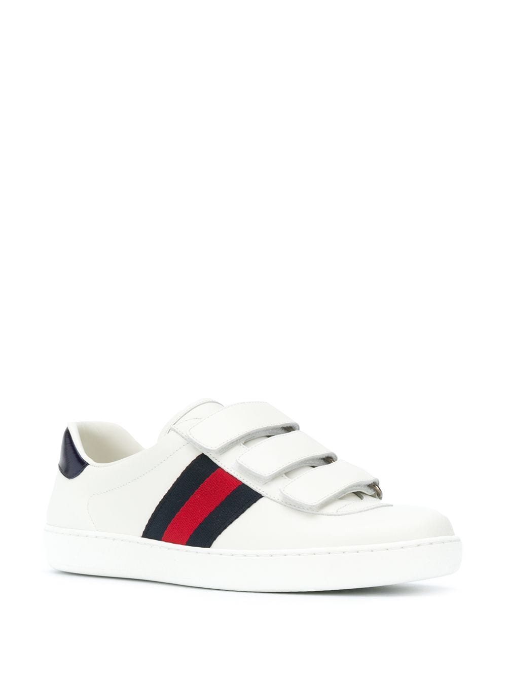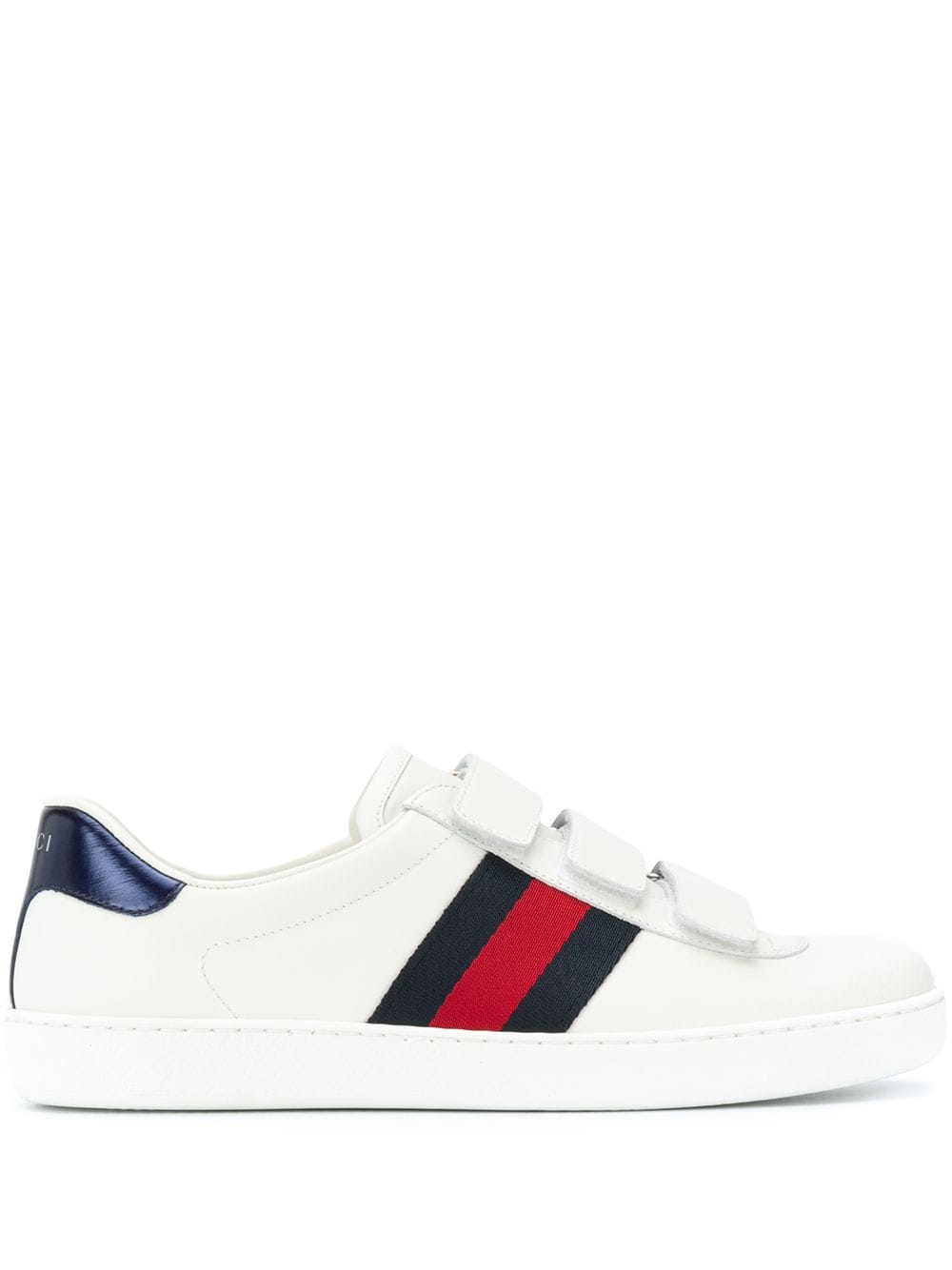 Since when were webbed feet in fashion? Sporting Gucci’s iconic navy and red Web striped trim, these branded sneakers are a signature. Featuring a round toe, a touch strap fastening, a contrasting logo embossed heel counter and a rubber sole.