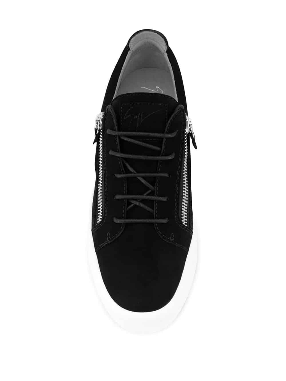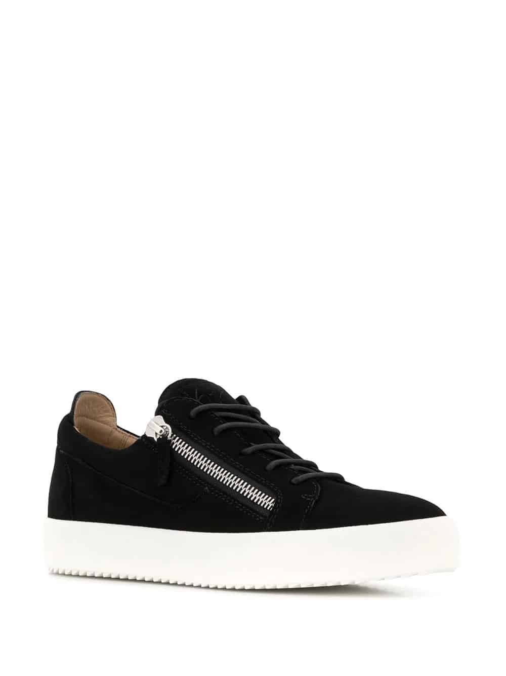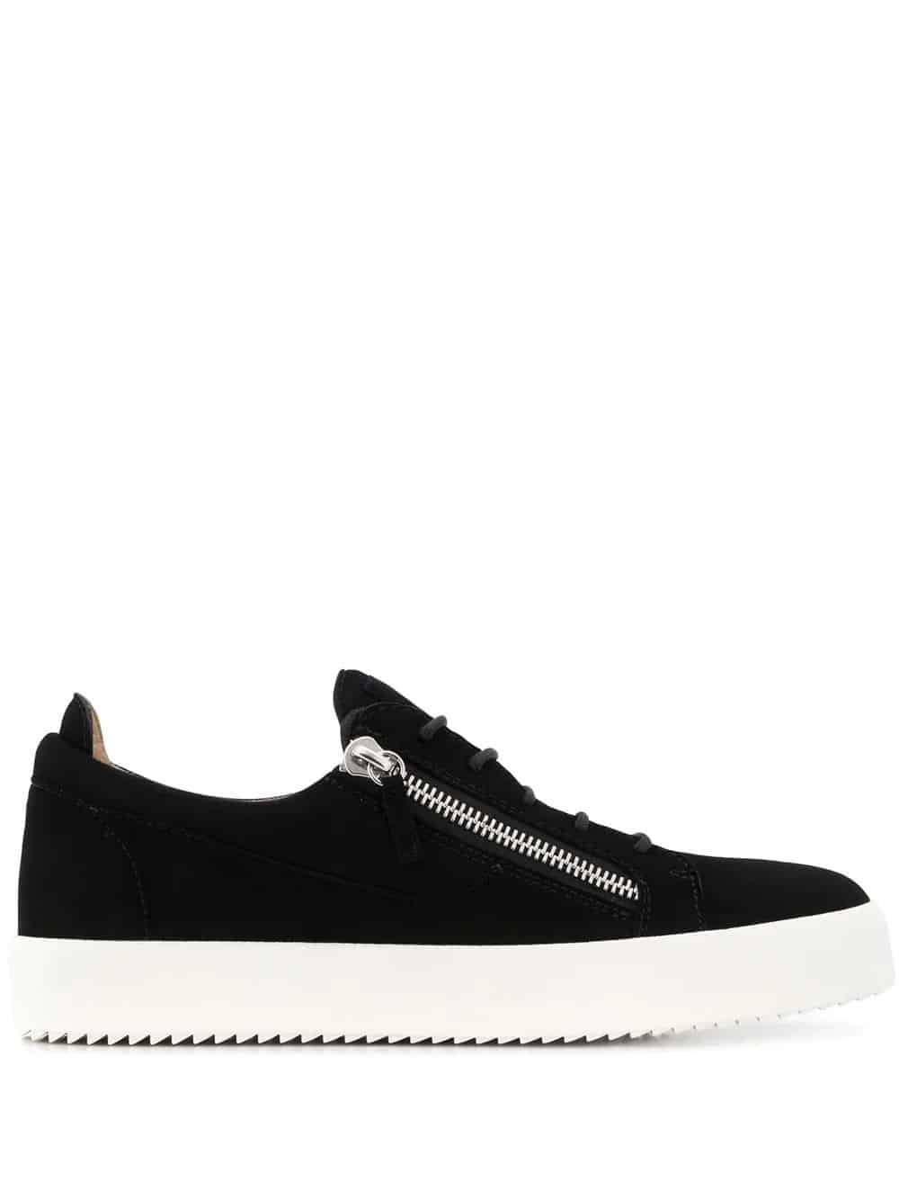 Giuseppe Zanotti Design creates show stopping leather good for connoisseurs of faultless construction with a slick edginess, such as these black leather zip detail low top trainers featuring an almond toe, a front lace up detail, side zip details, silver-tone hardware, a flat rubber sole and a brand embossed tongue.